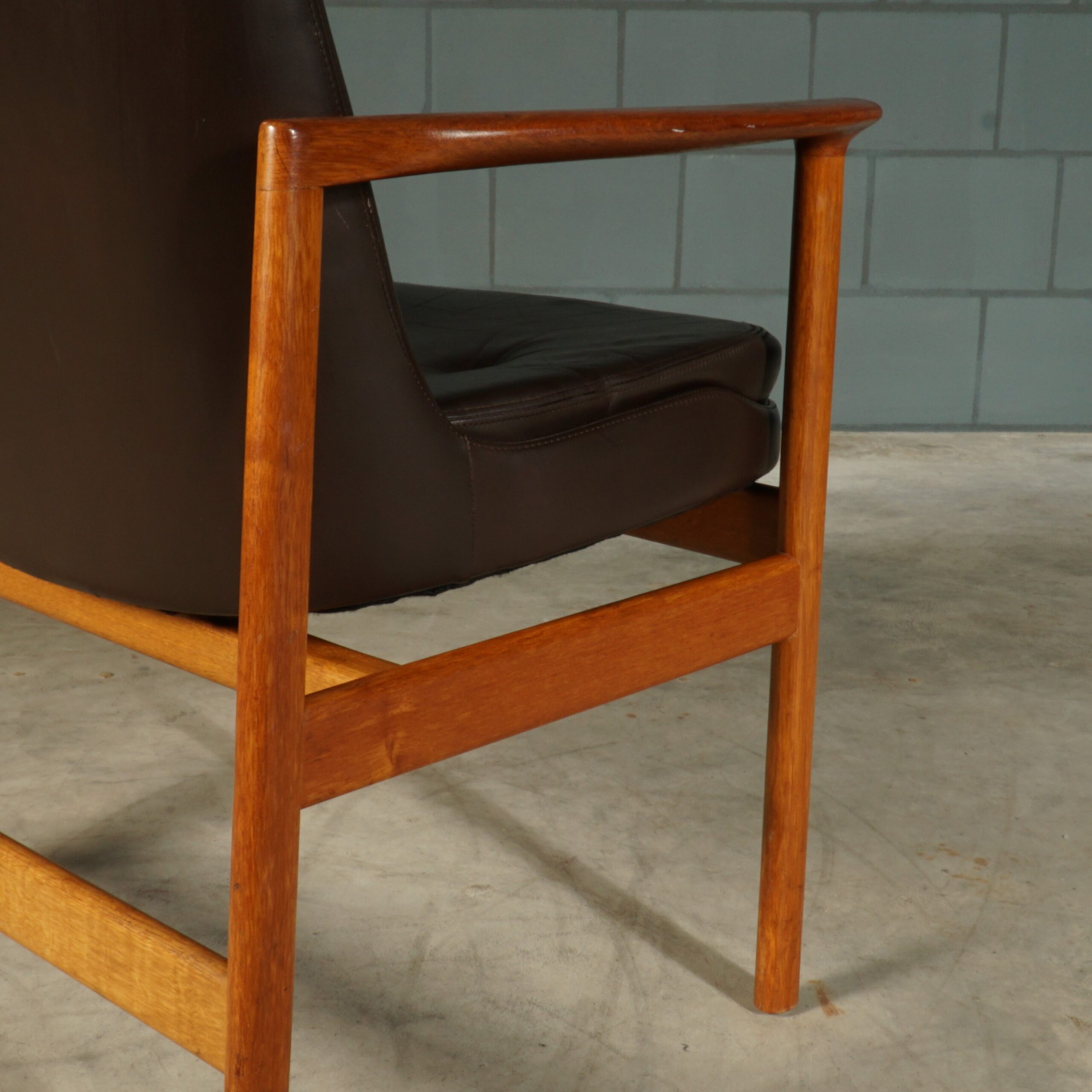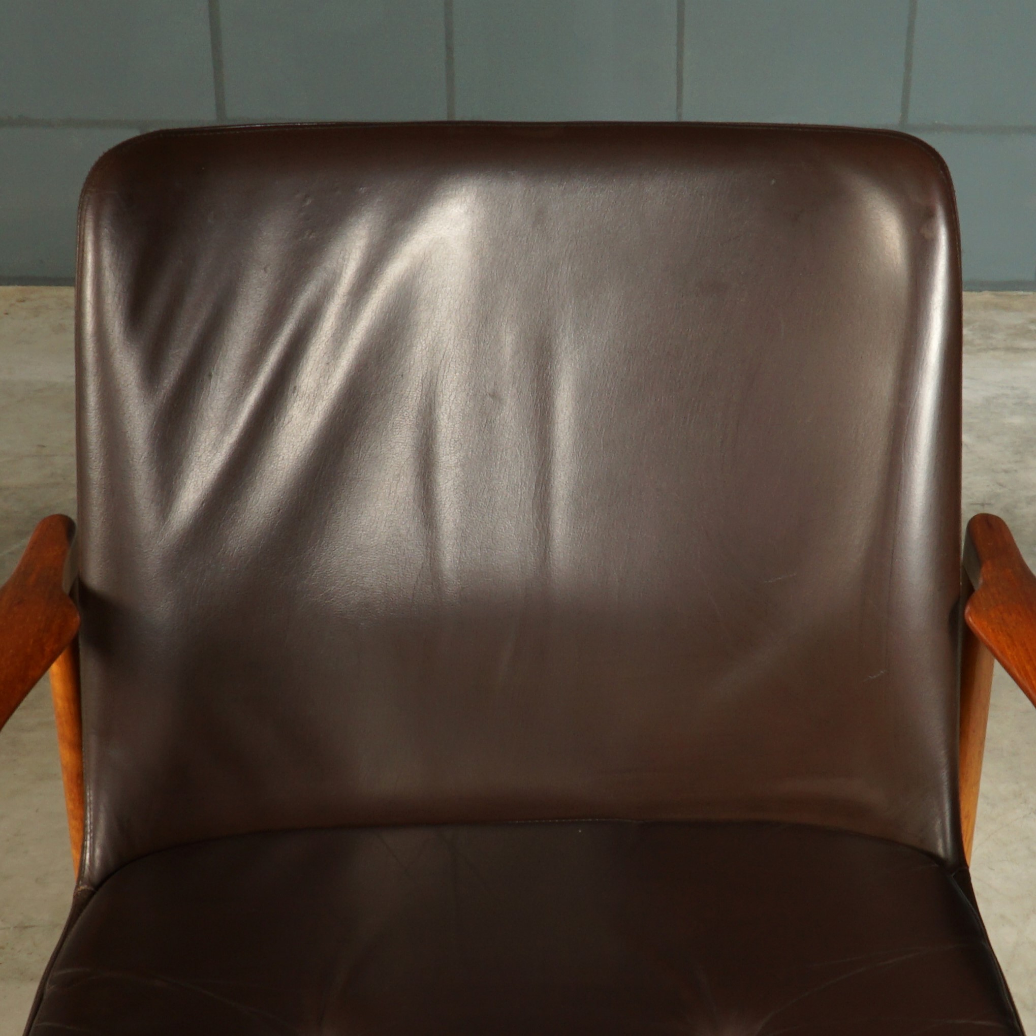 Deze prachtige stoelen zijn ontworpen door Ib Kofod Larsen voor Fröscher in Duitsland rond 1960. Gemaakt van hoogwaardig walnoothout met donkerbruin leer zijn dit zeer herkenbare stukken van het iconische ontwerp van Ib Kofod Larsen. Het warme notenhout past heel mooi bij de donkerbruine lederen bekleding en draagt bij tot de prachtige aantrekkingskracht van deze stoelen. De frames hebben een afgeronde afwerking en de gebogen rugleuningen en de extra zitkussens zorgen voor een heerlijk zitcomfort! Absolue eye-catchers die een mooie aanvulling zullen zijn in elk interieur. De stoelen zijn in mooie vintage staat. Alle drie de stoelen hebben een zichtbare beschadiging aan het leer (zie foto’s).