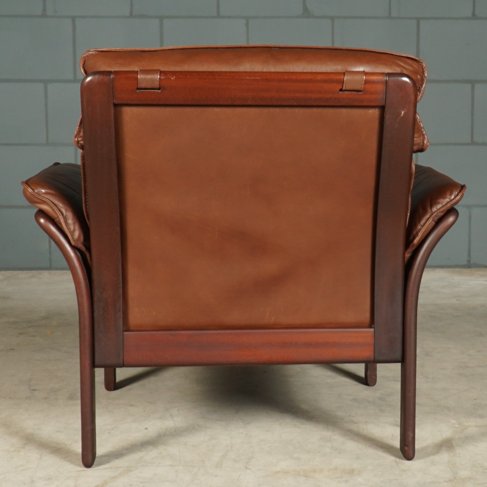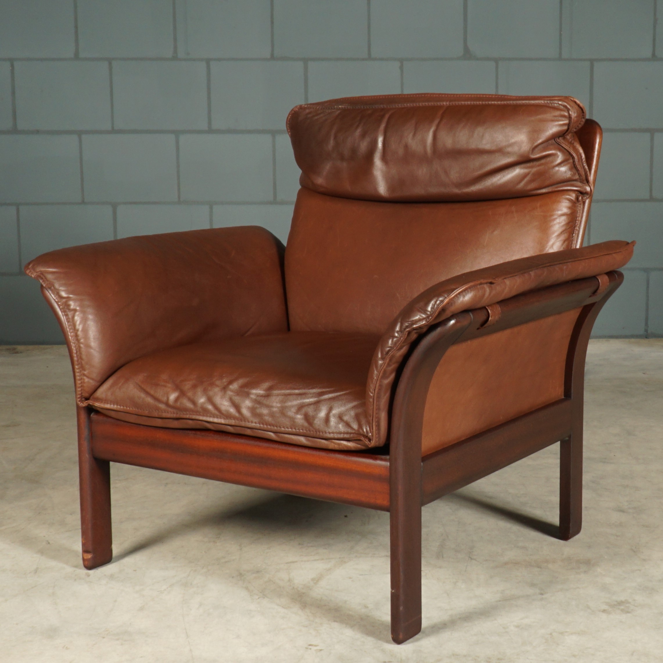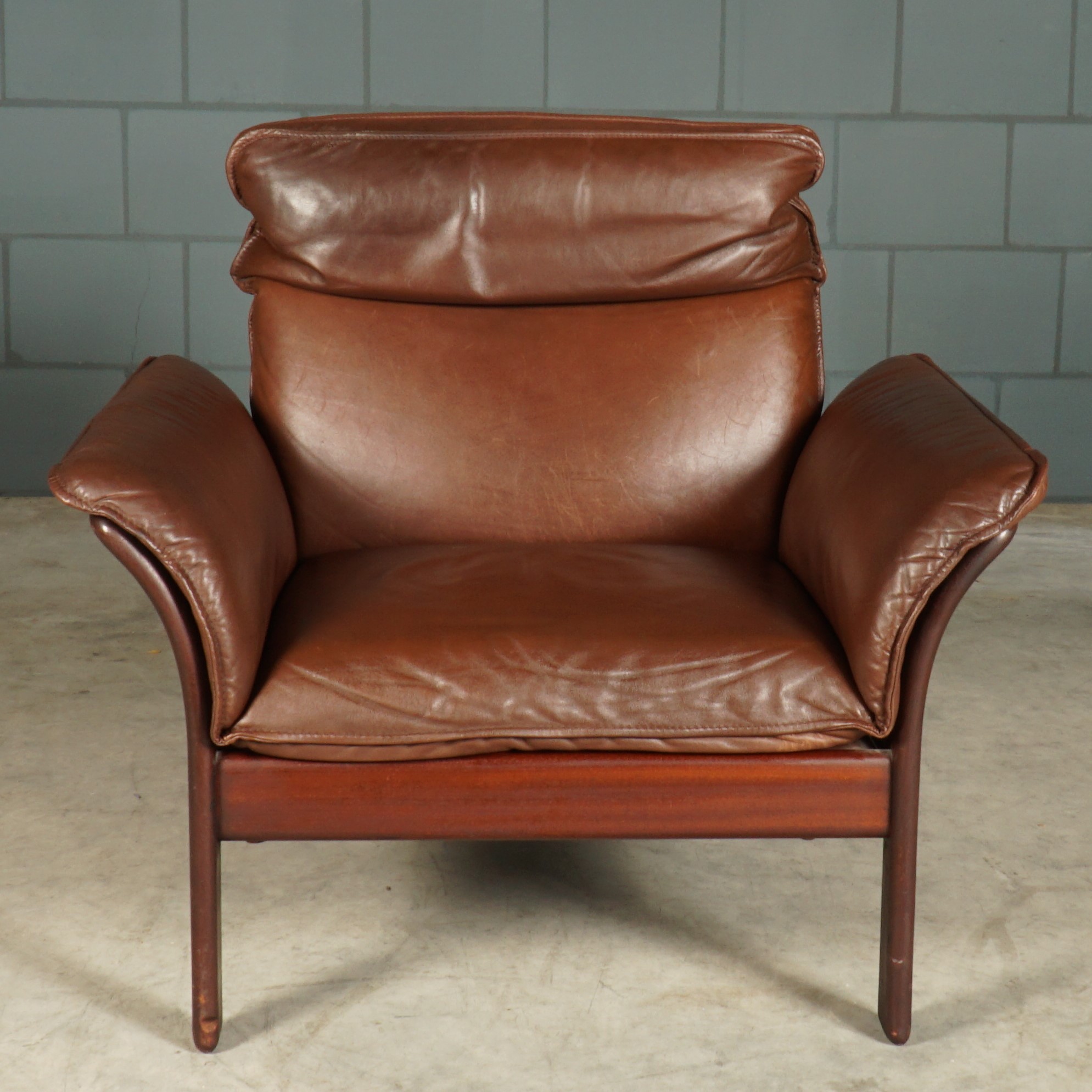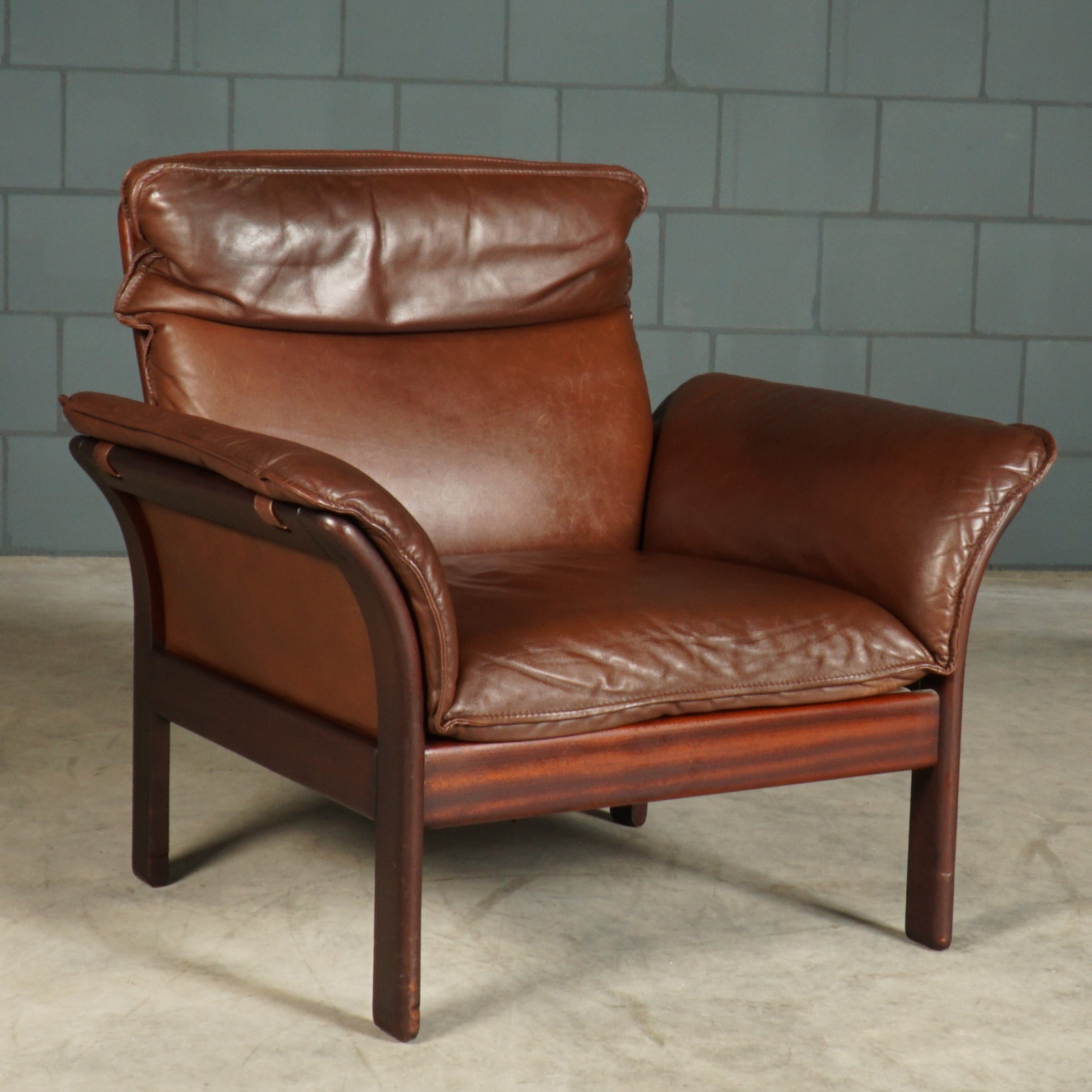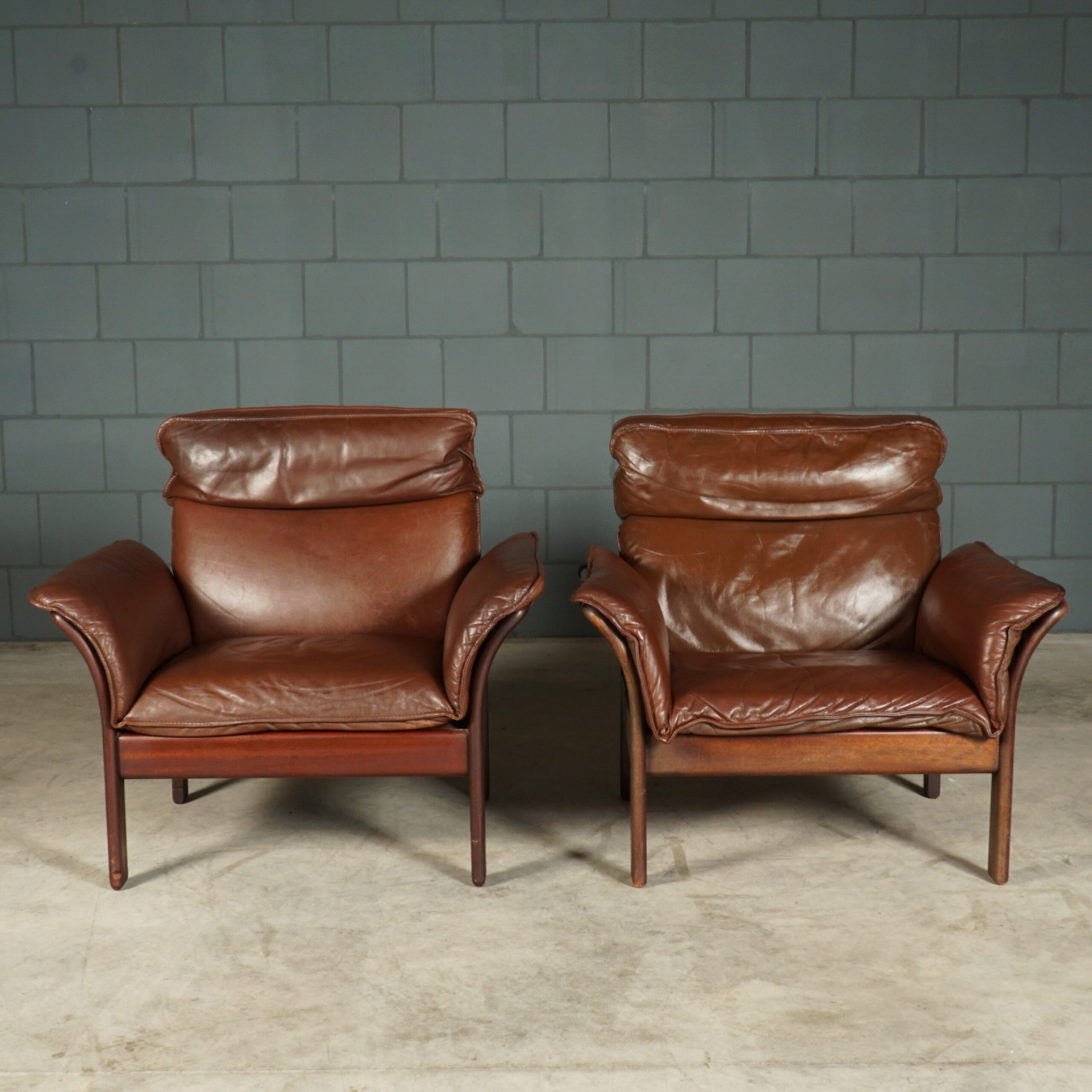 Absoluut een lust voor het oog! Deze prachtige set fauteuils met hocker komen uit Duitsland en zijn in de jaren 80 gemaakt door Dreipunkt International. De fauteuils zijn bekleed met prachtig kwaliteitsleder in een mooie donkerbruine kleur. De fauteuils hebben een houten organisch vormgegeven frame, waarbij de lederen bekleding ook aan de achterzijde en onder de armleuningen doorloopt. De fauteuils zijn niet alleen mooi om te zien, maar hebben ook nog eens een super goed zitcomfort met een fijn hoofdkussen. Gezien de leeftijd nog in zeer goede vintage staat.