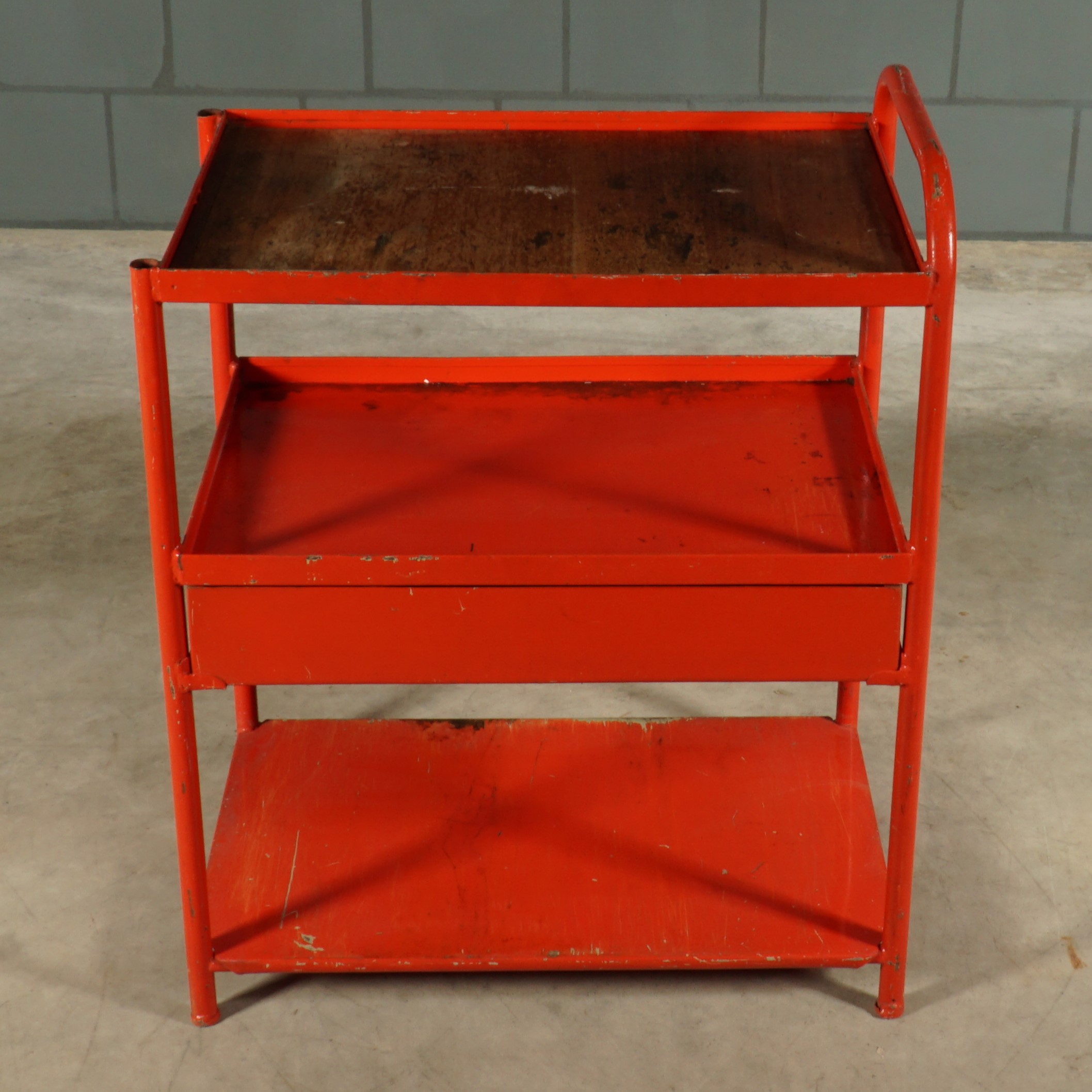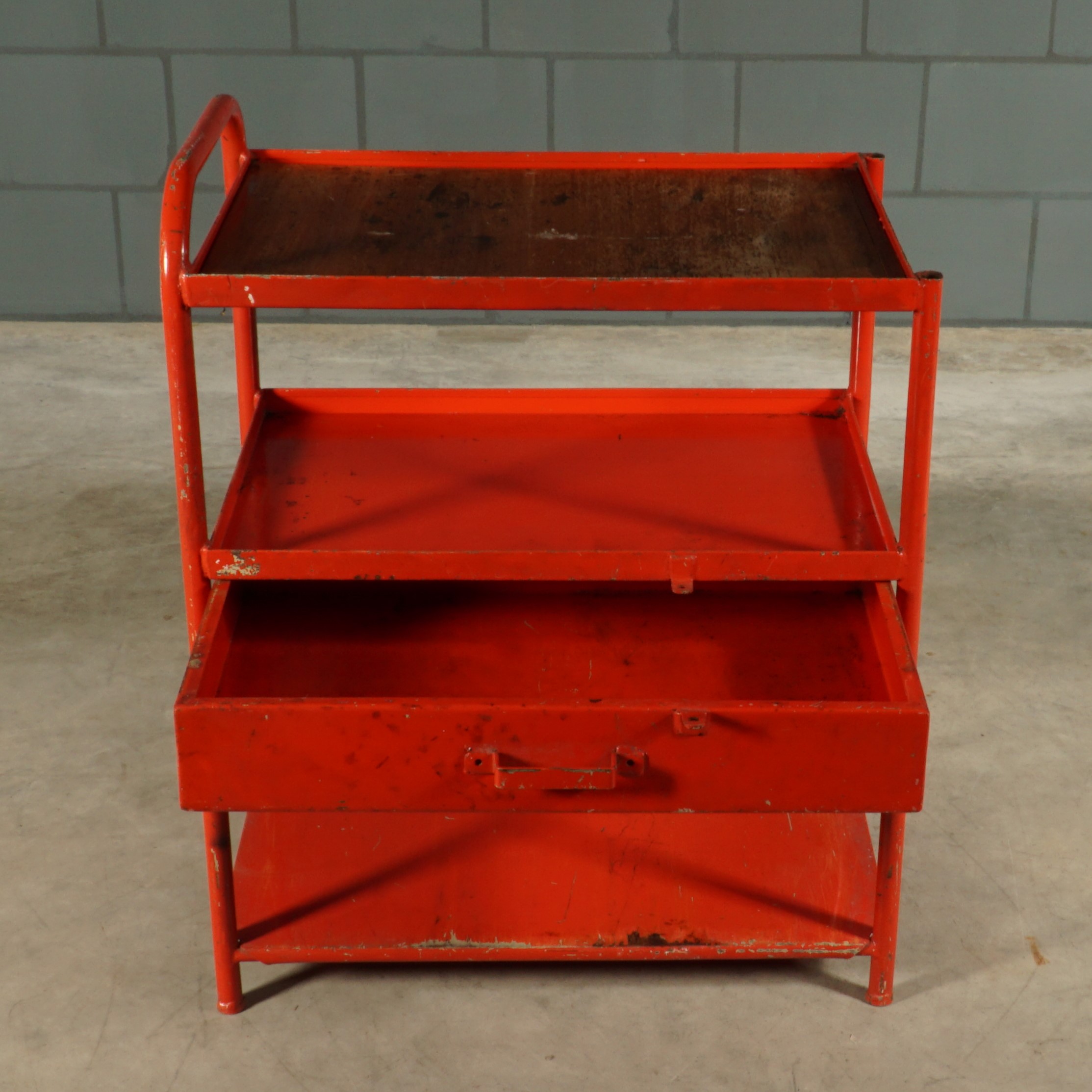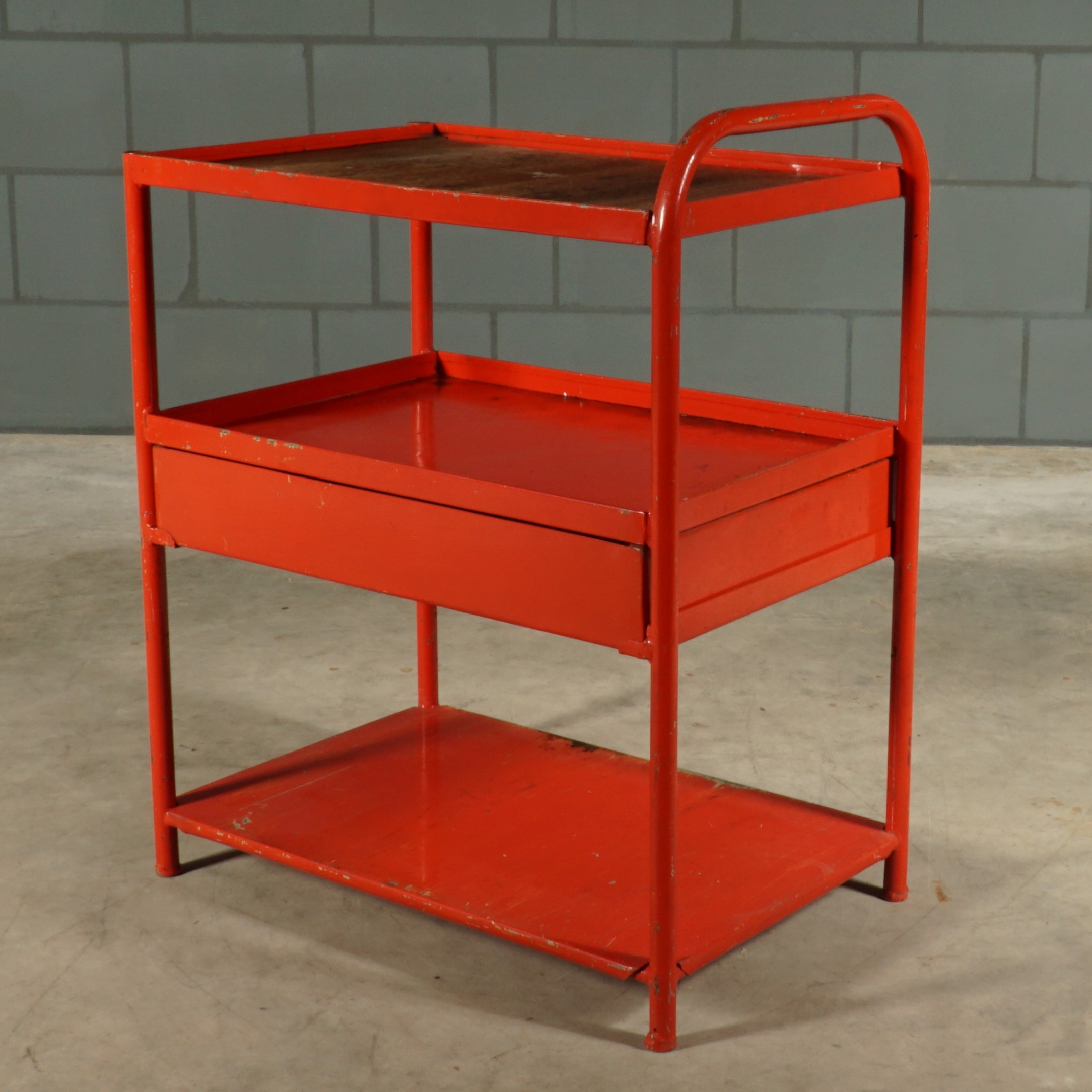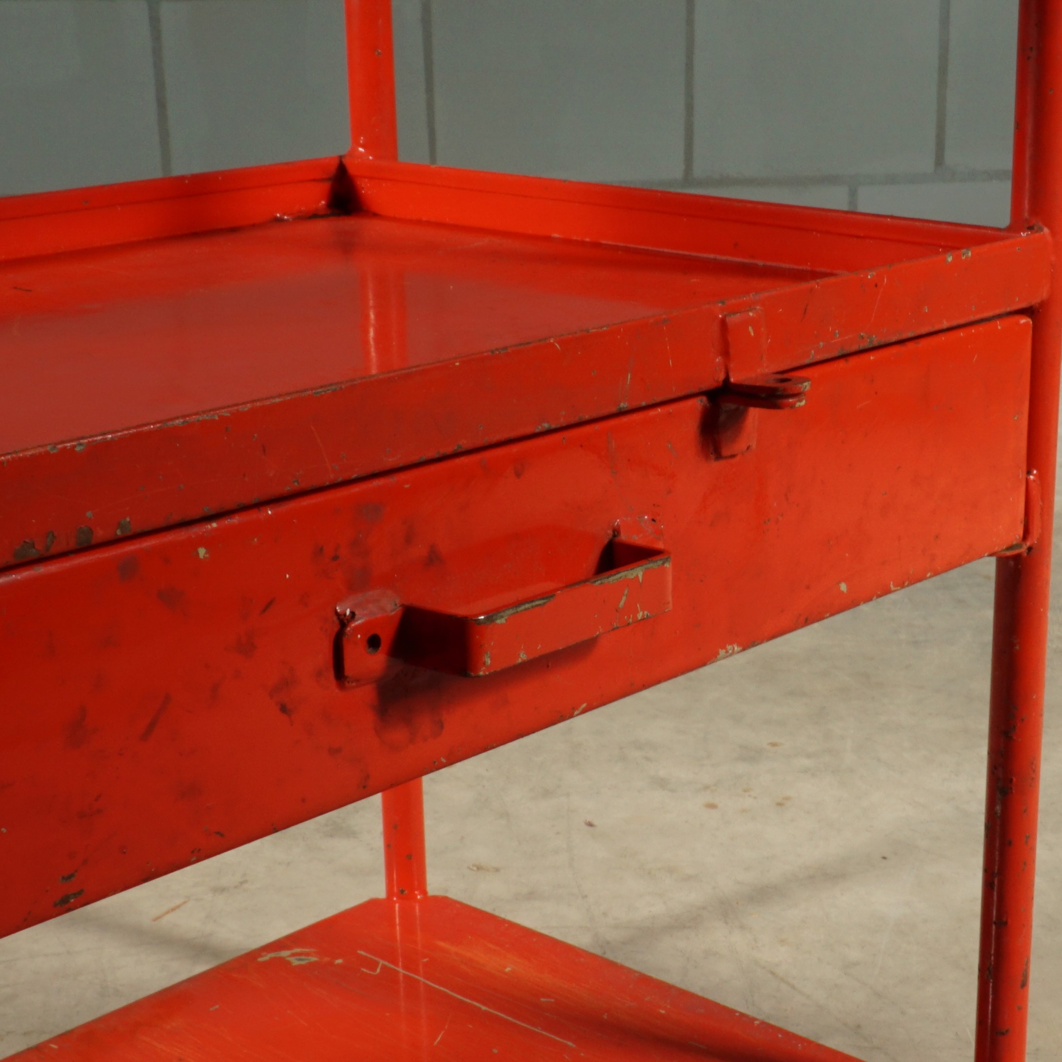 Dit leuke rode metalen kastje heeft een industriële uitstraling van heb ik jou daar! Een prachtige kleurrijke Franse eye-catcher voor in de keuken of hal of natuurlijk gewoon in de werkplaats. Bovenop zit een mooi verweerde houten plank en het kastje heeft een handige grote lade. Je zou er wieltjes onder kunnen monteren om deze beauty om te toveren tot trolley of serveerwagen. Patina ten top!