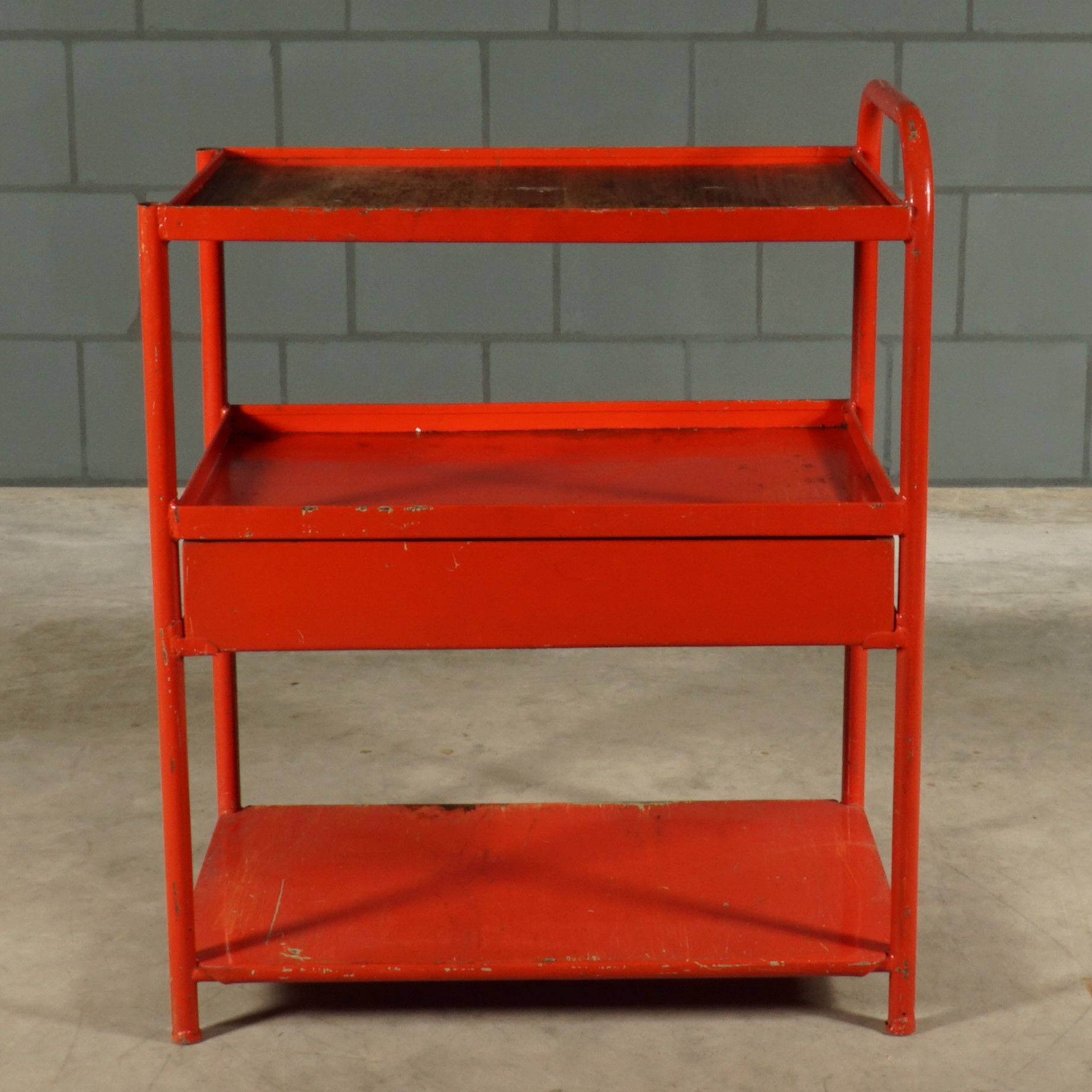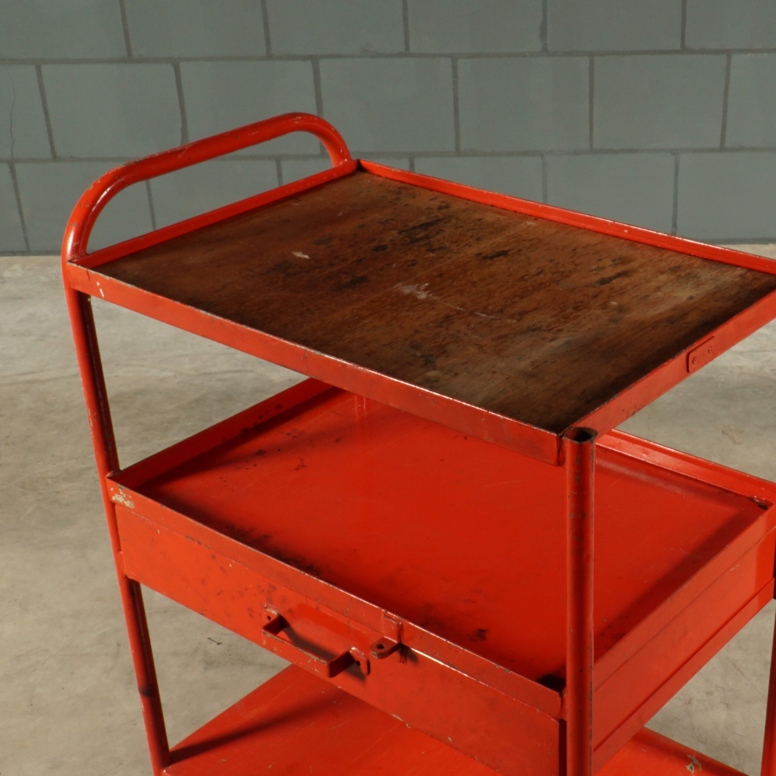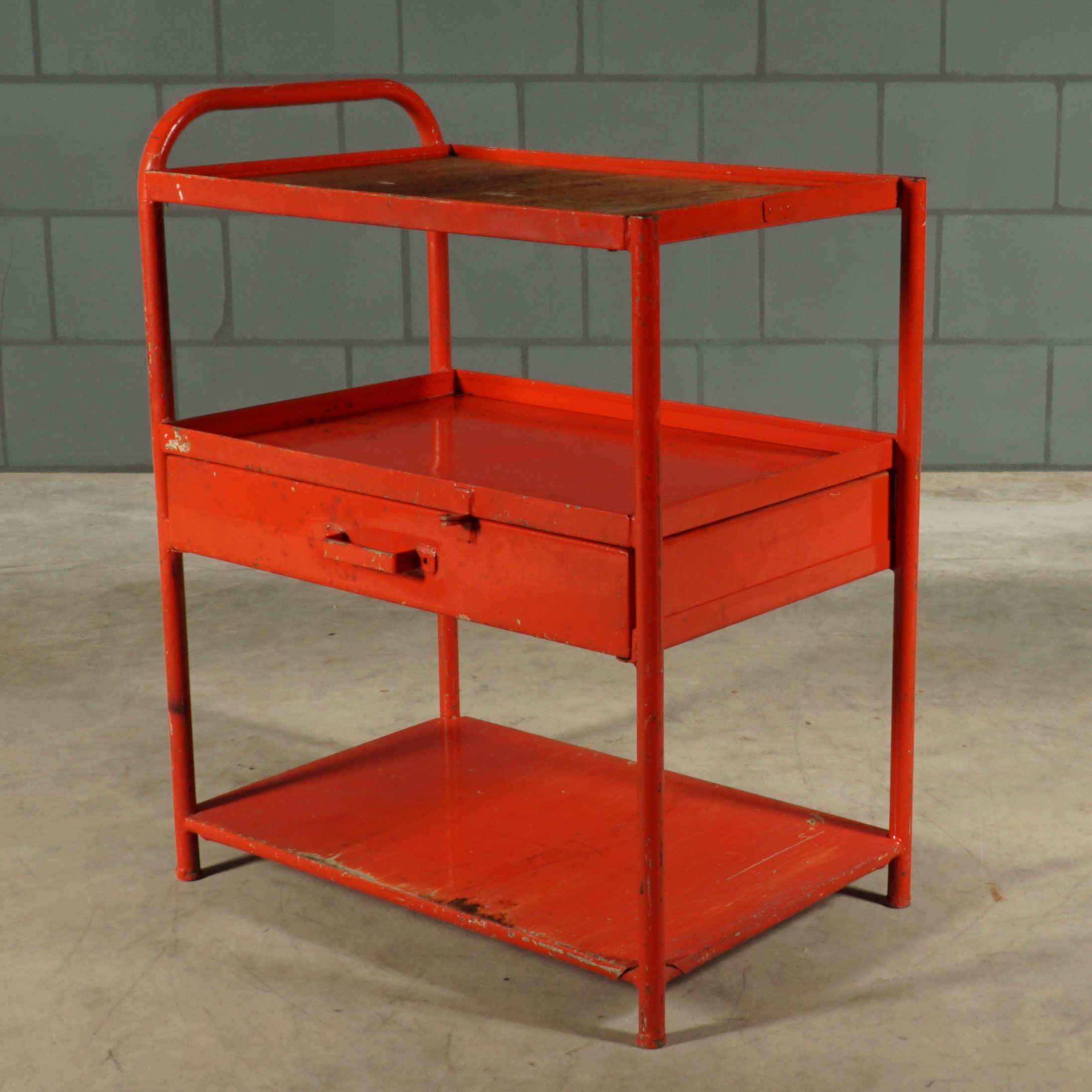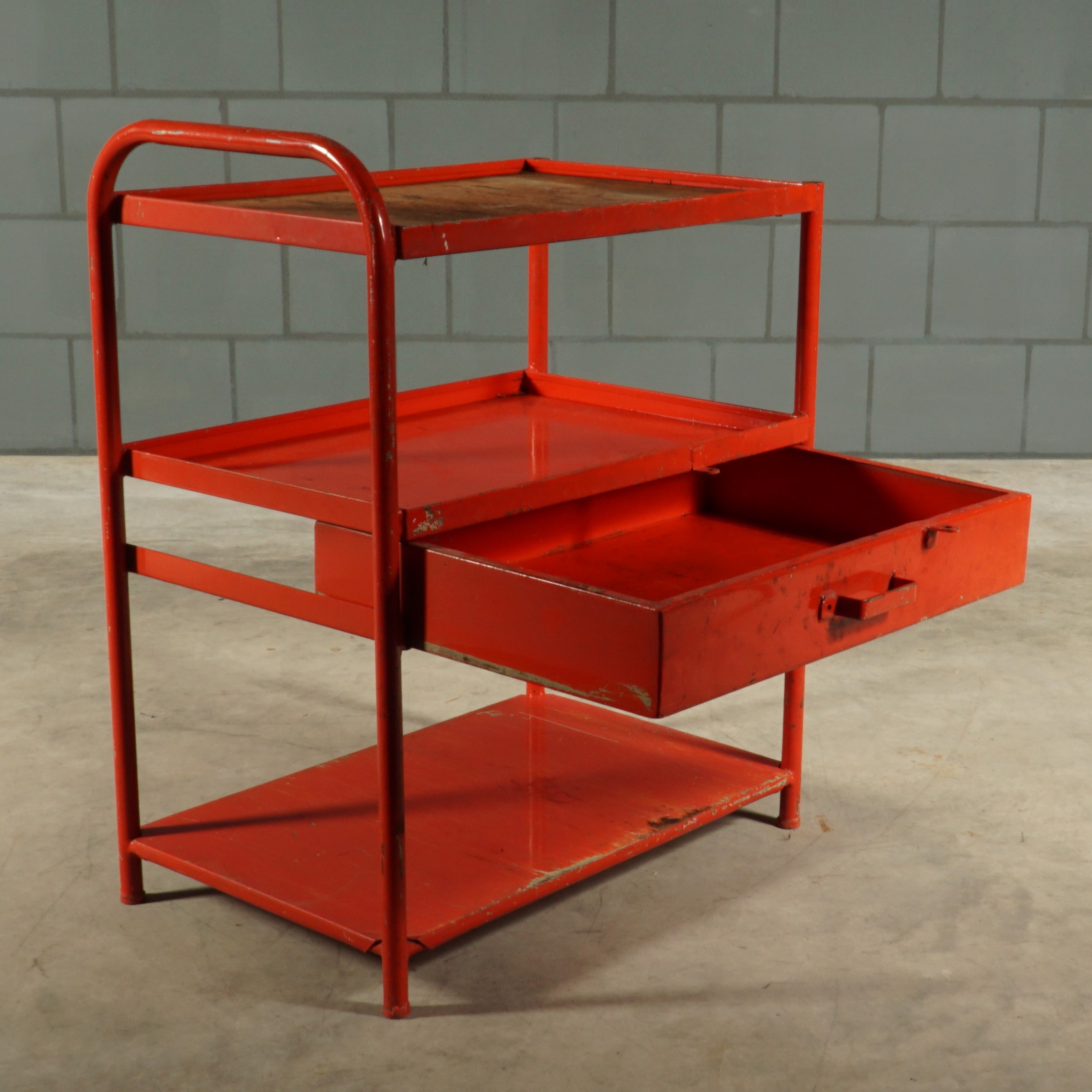 Dit leuke rode metalen kastje heeft een industriële uitstraling van heb ik jou daar! Een prachtige kleurrijke Franse eye-catcher voor in de keuken of hal of natuurlijk gewoon in de werkplaats. Bovenop zit een mooi verweerde houten plank en het kastje heeft een handige grote lade. Je zou er wieltjes onder kunnen monteren om deze beauty om te toveren tot trolley of serveerwagen. Patina ten top!