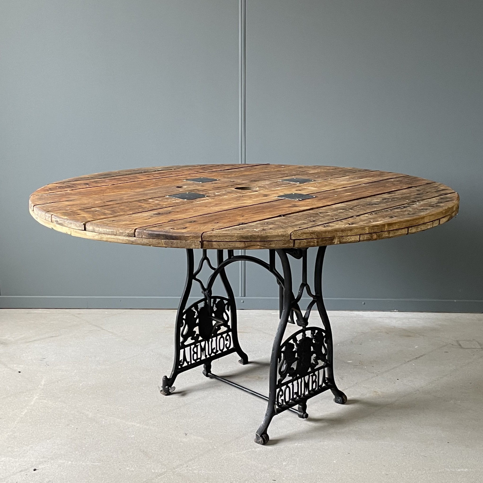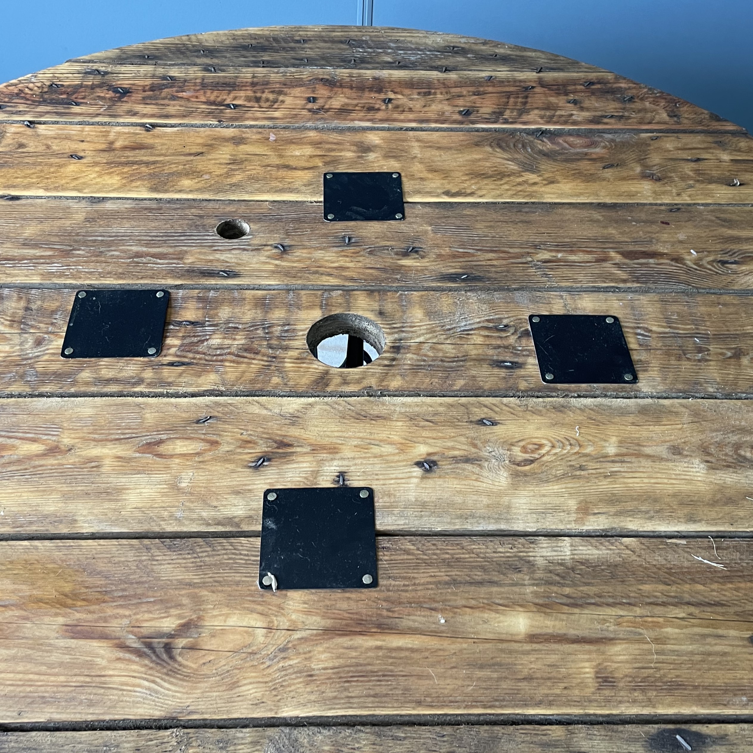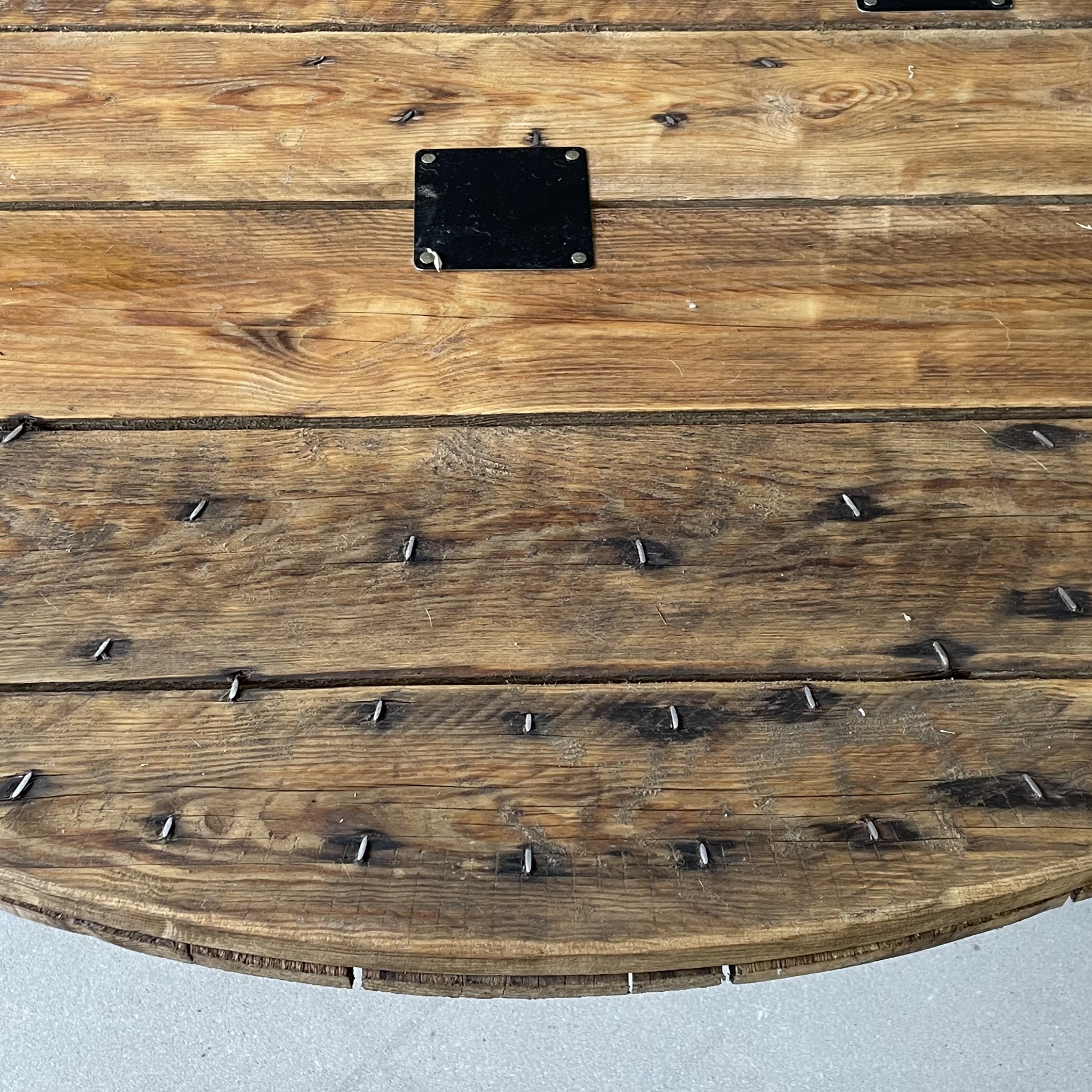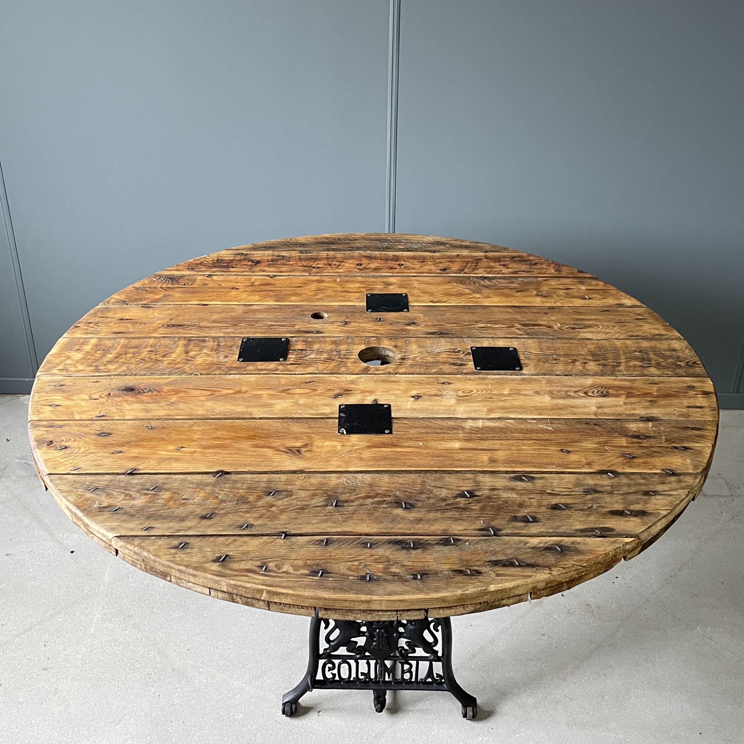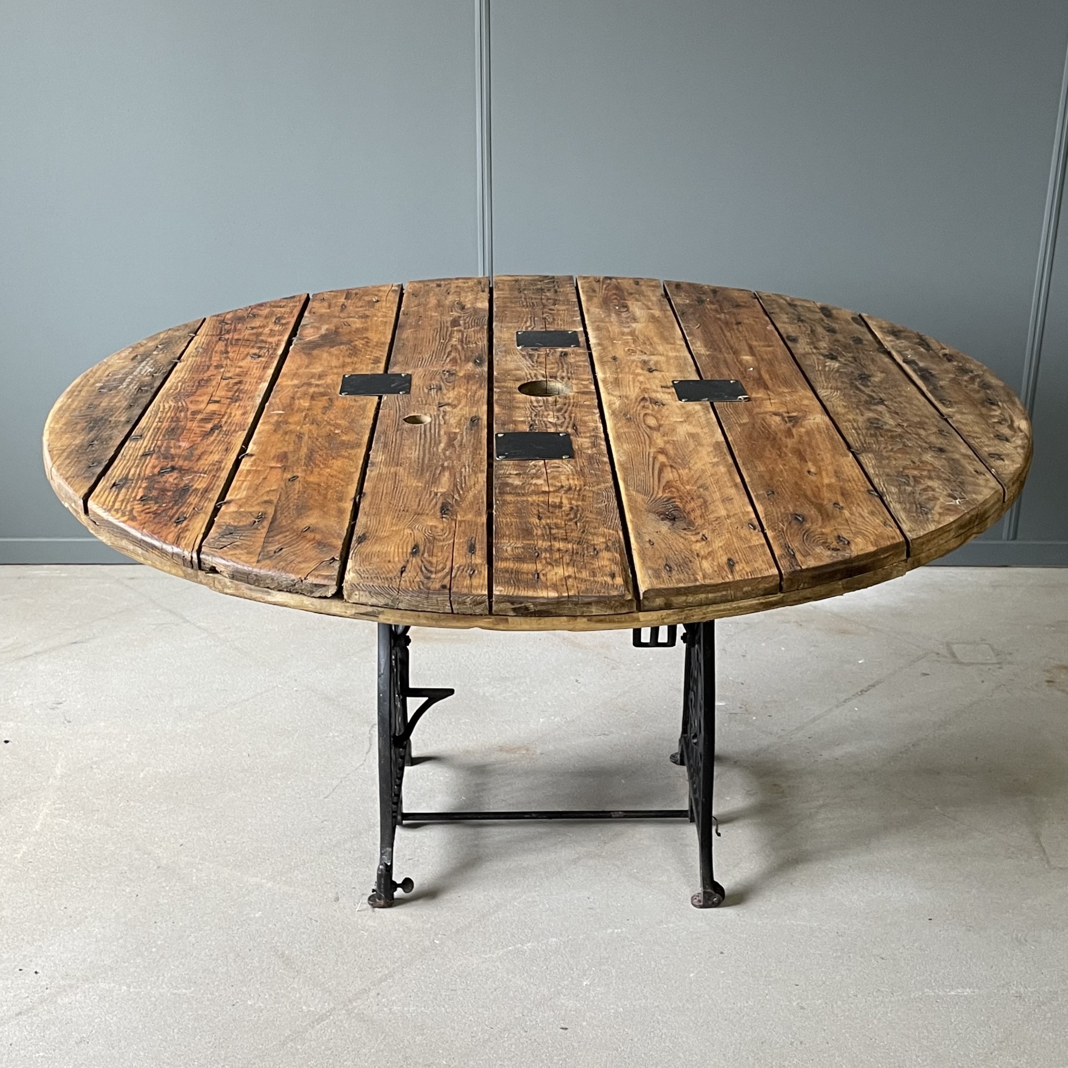 Deze stoere industriële tafel is gemaakt van prachtig verweerde oude eikenhouten planken en heeft een zwart gietijzeren onderstel. De tafel kan zowel binnen als buiten gebruikt worden. In het midden zit een gat waar een parasol doorheen gestoken kan worden, zodat de tafel ook erg geschikt is als tuintafel. Maar de tafel zou ook fantastisch staan in een landelijke keuken. Een mooi contrast tussen het warme eikenhout en het stoere zwarte metaal!