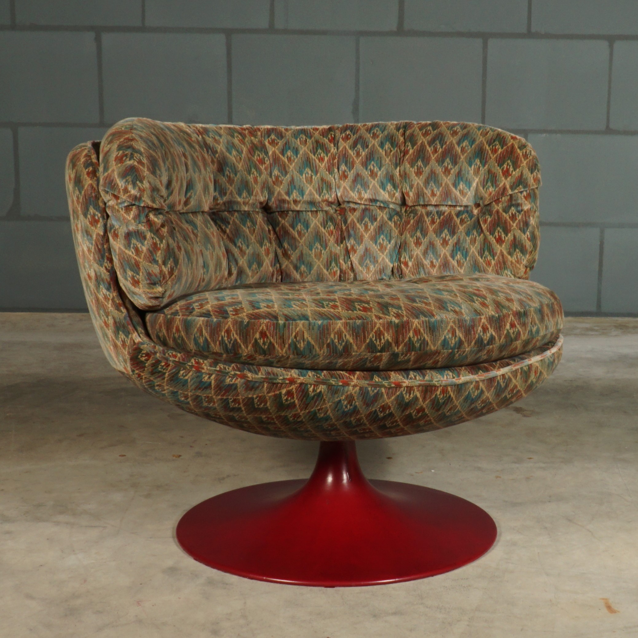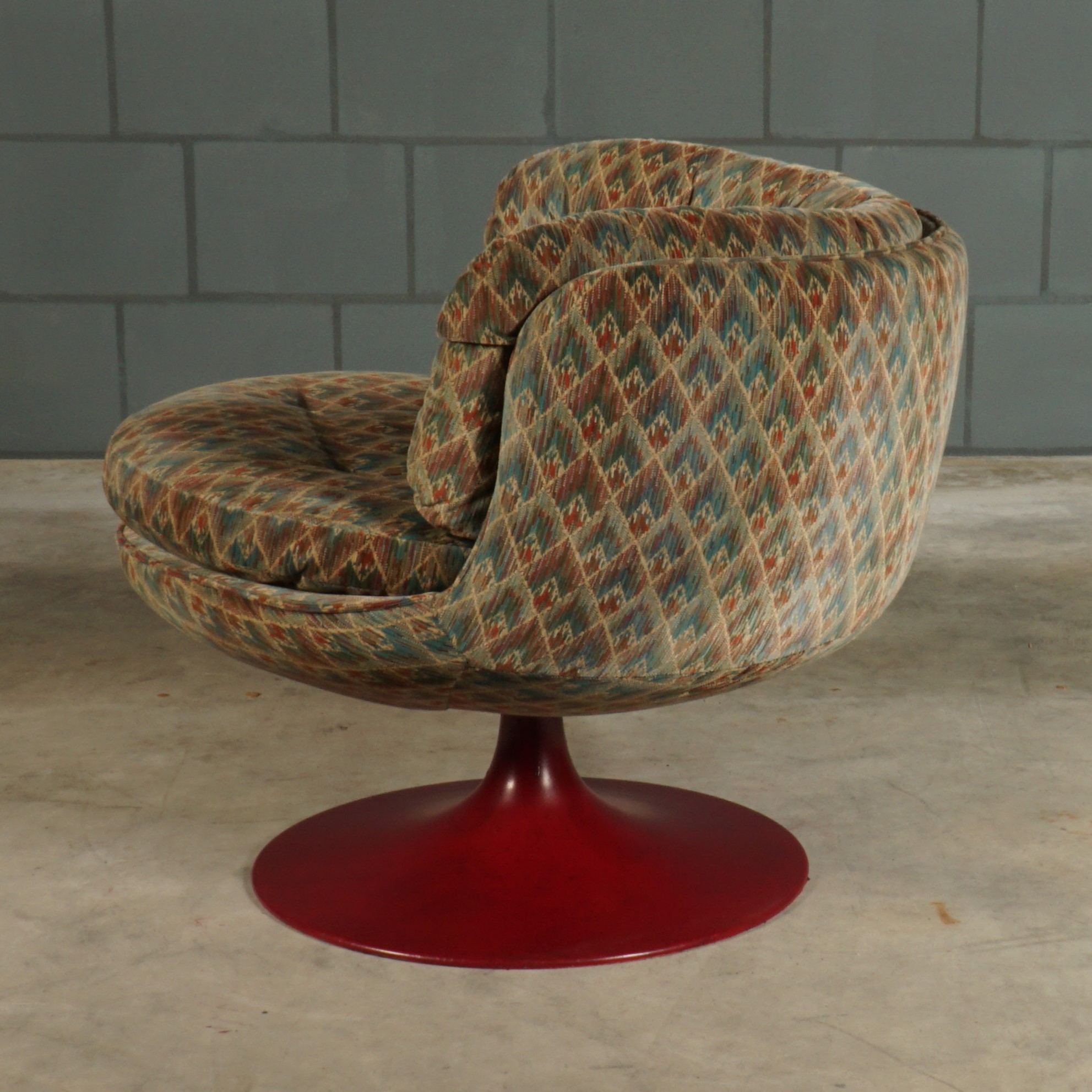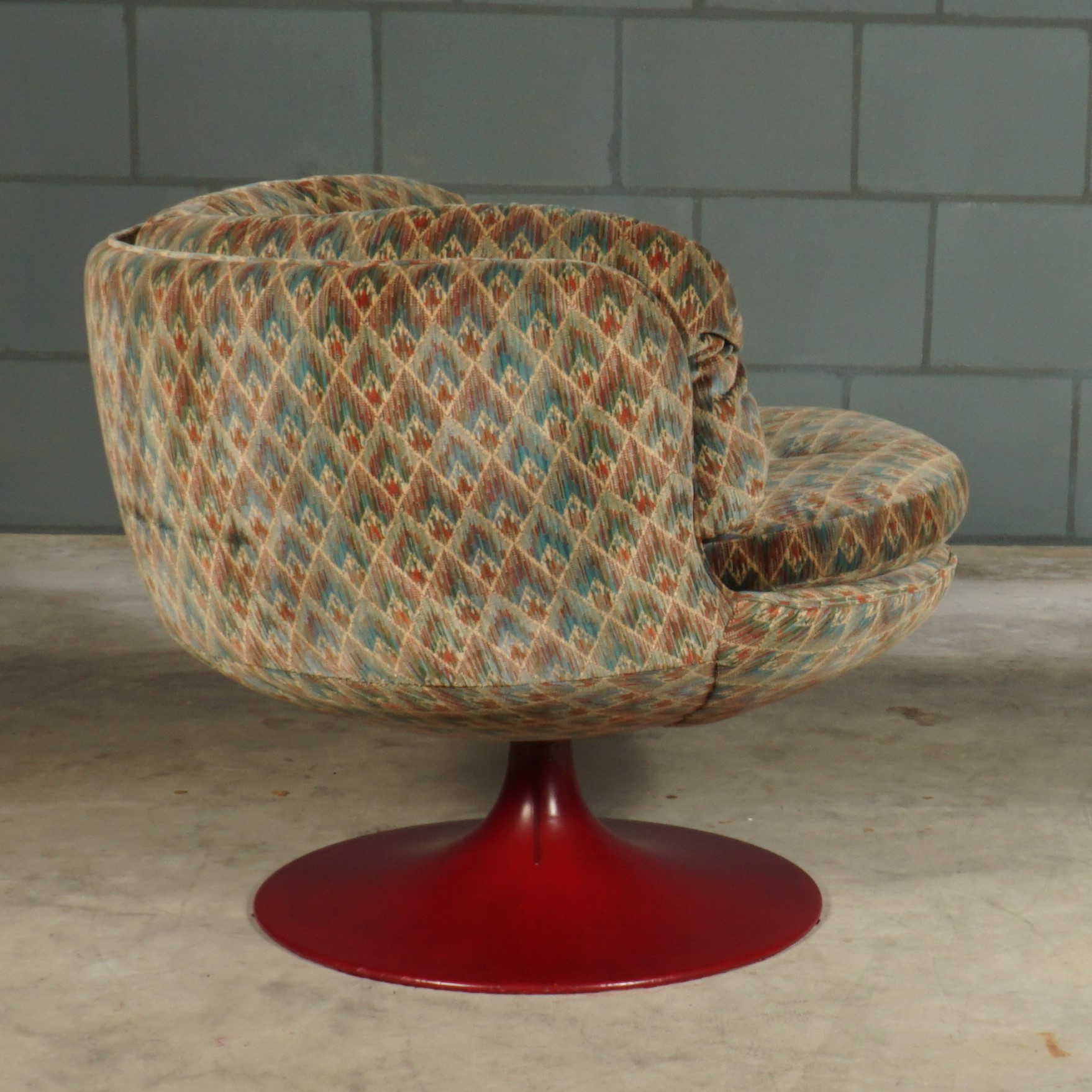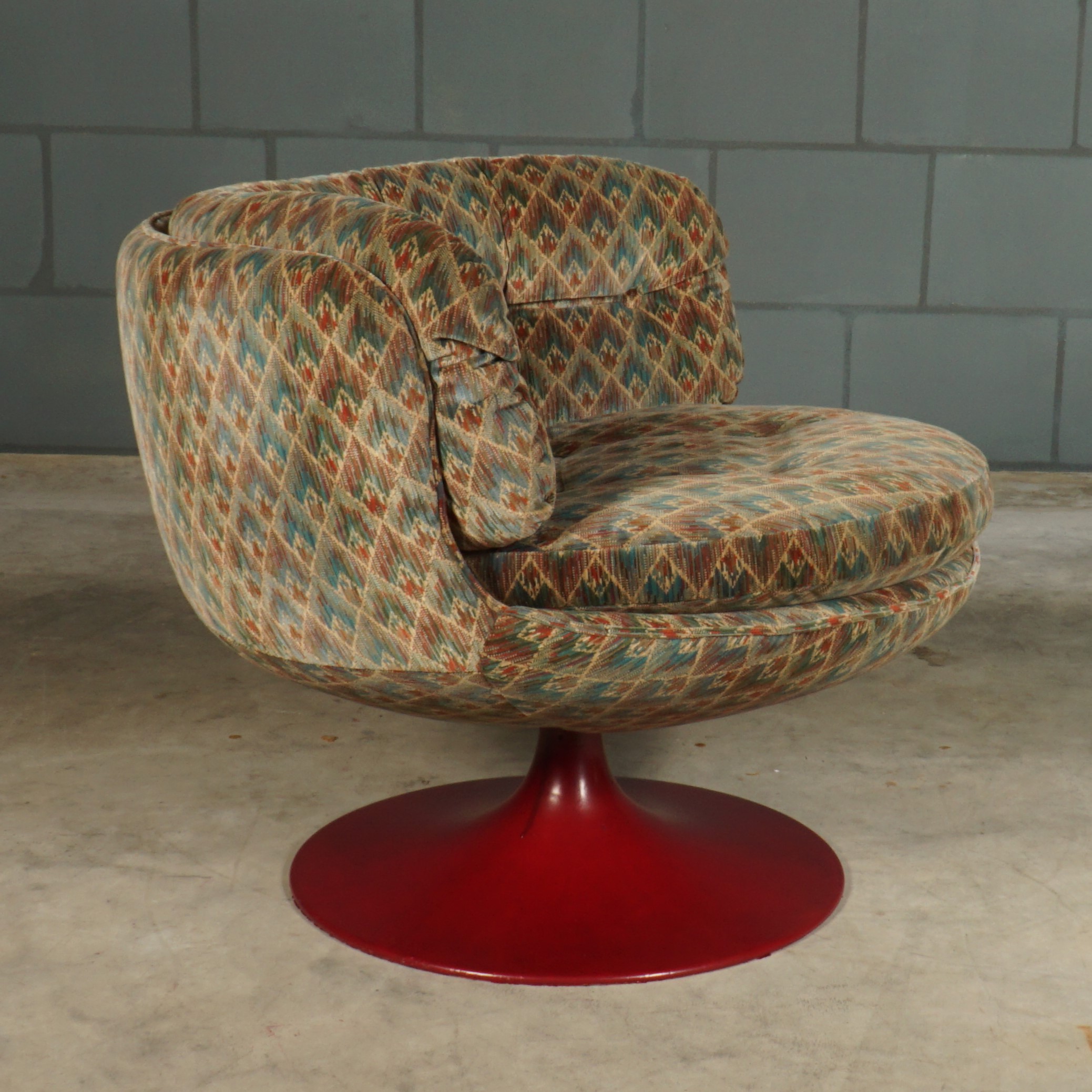 Dit kleurrijke vintage juweeltje is een echte ‘one-of-a-kind’ eye-catcher! De stoel is gestoffeerd met een zachte velours stof en heeft een gecapitonneerd rugkussen en zitkussen. De ronde metalen voet is opnieuw gelakt met een wijnrode matte lak. Staat geweldig bij de rode accenten in de stoffen bekleding. De fauteuil betreft een lage loungestoel met een lage rugleuning en zonder draaivoet. De fauteuil is in uitmuntende staat zonder vlekken of beschadigingen.