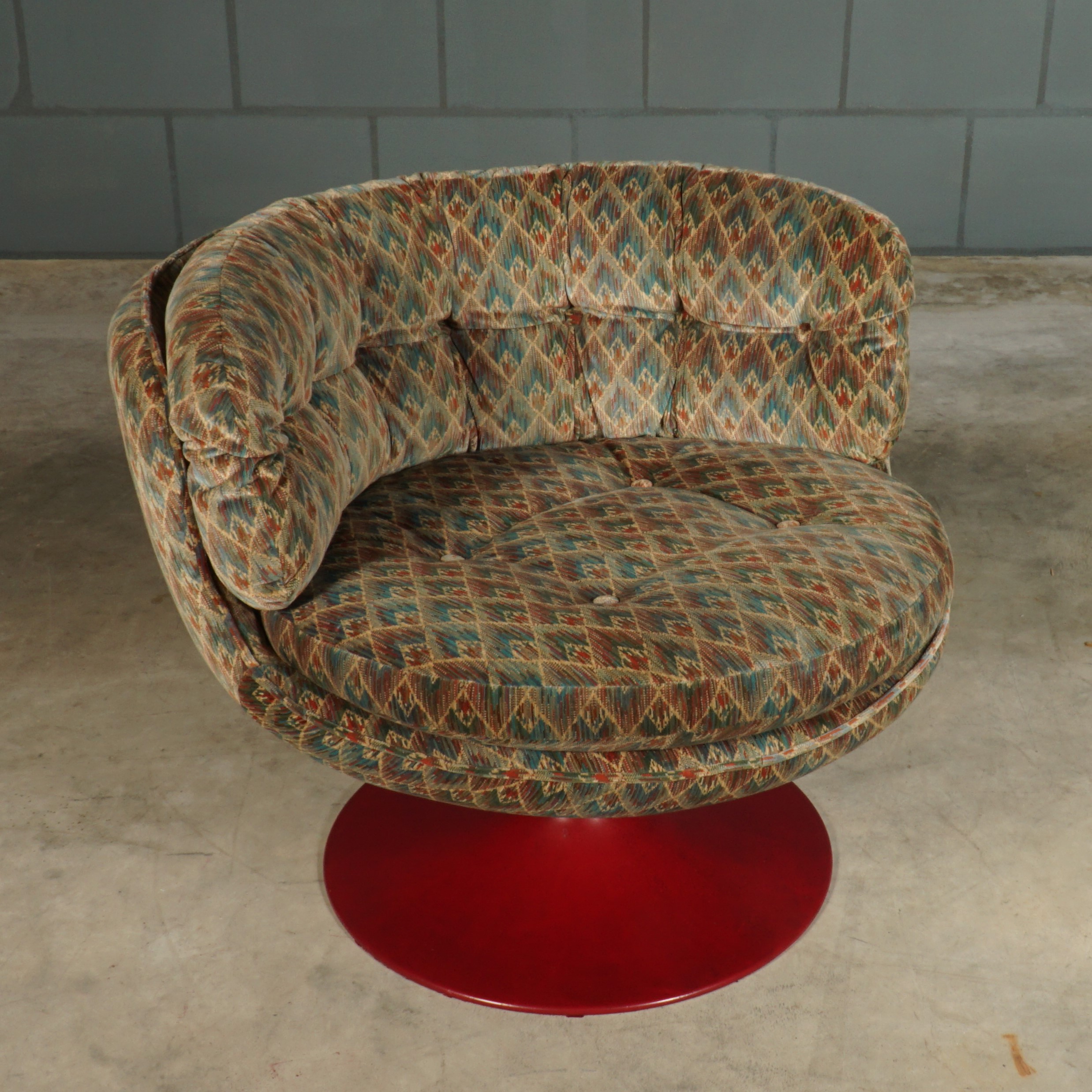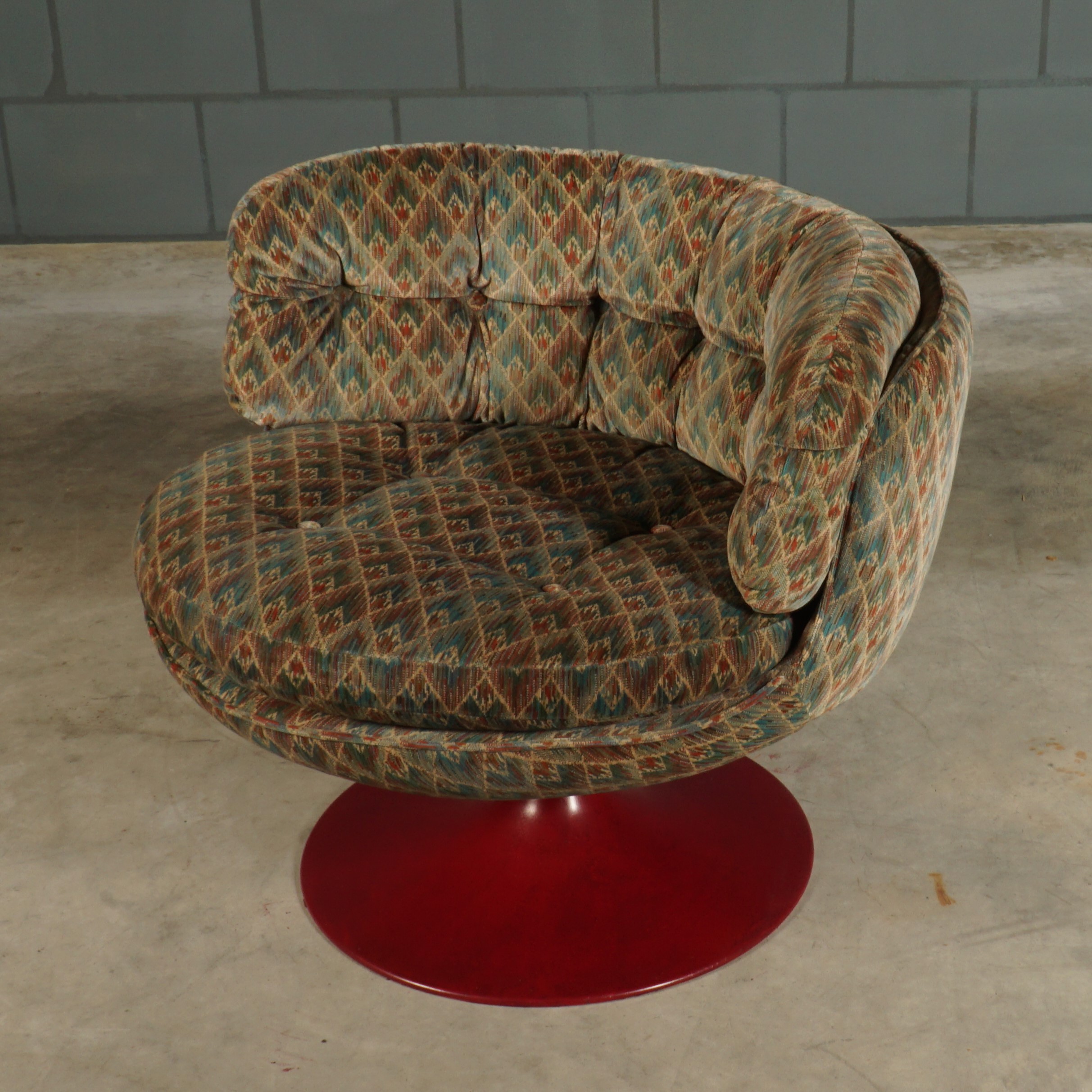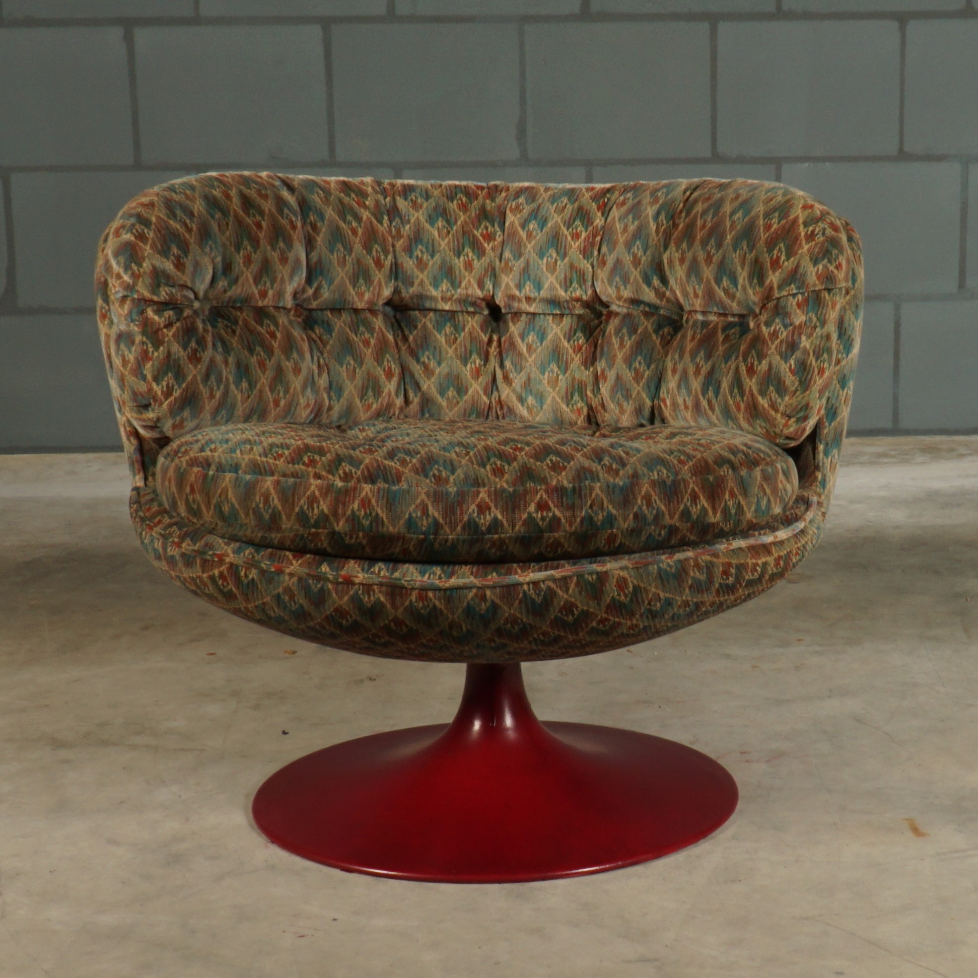 Dit kleurrijke vintage juweeltje is een echte ‘one-of-a-kind’ eye-catcher! De stoel is gestoffeerd met een zachte velours stof en heeft een gecapitonneerd rugkussen en zitkussen. De ronde metalen voet is opnieuw gelakt met een wijnrode matte lak. Staat geweldig bij de rode accenten in de stoffen bekleding. De fauteuil betreft een lage loungestoel met een lage rugleuning en zonder draaivoet. De fauteuil is in uitmuntende staat zonder vlekken of beschadigingen.