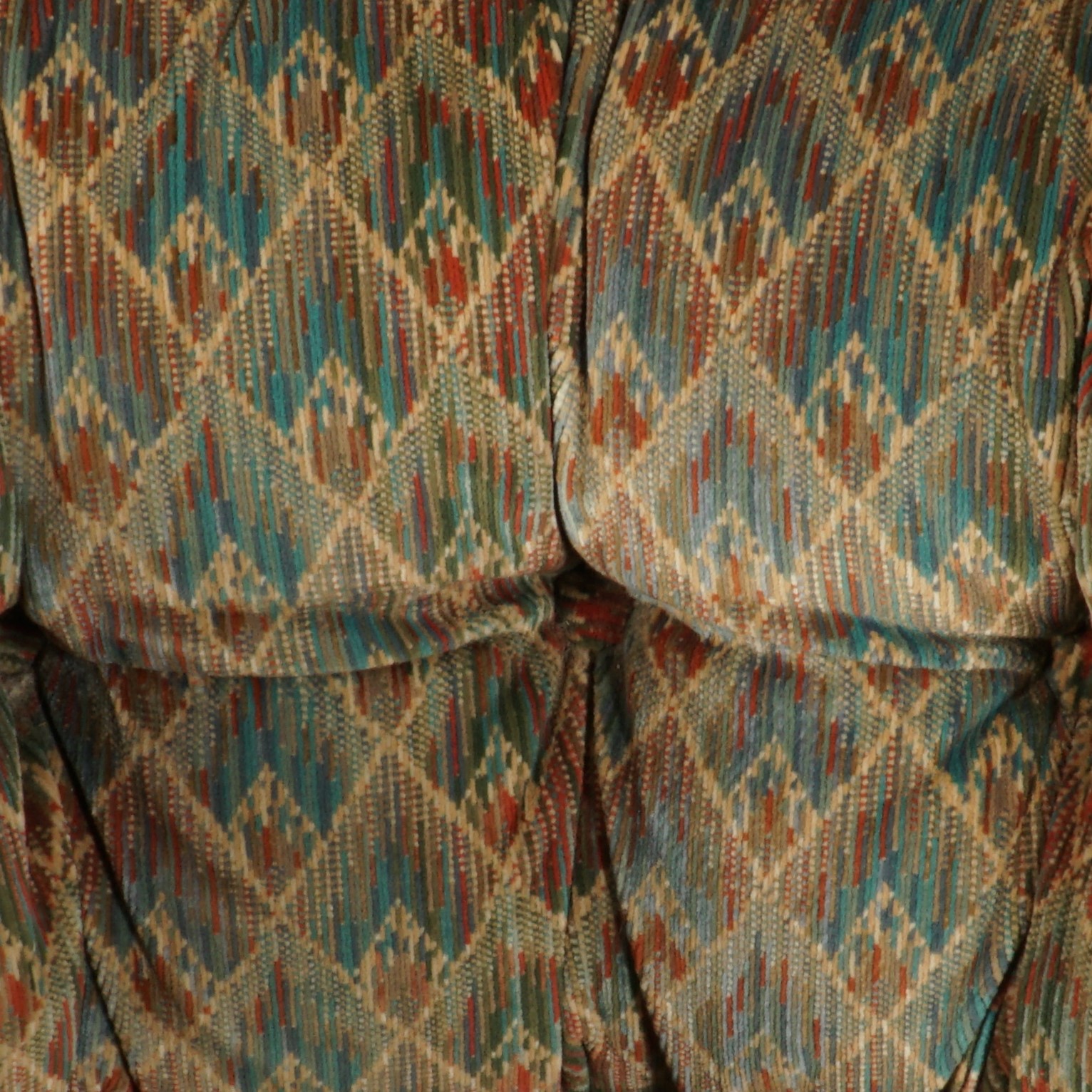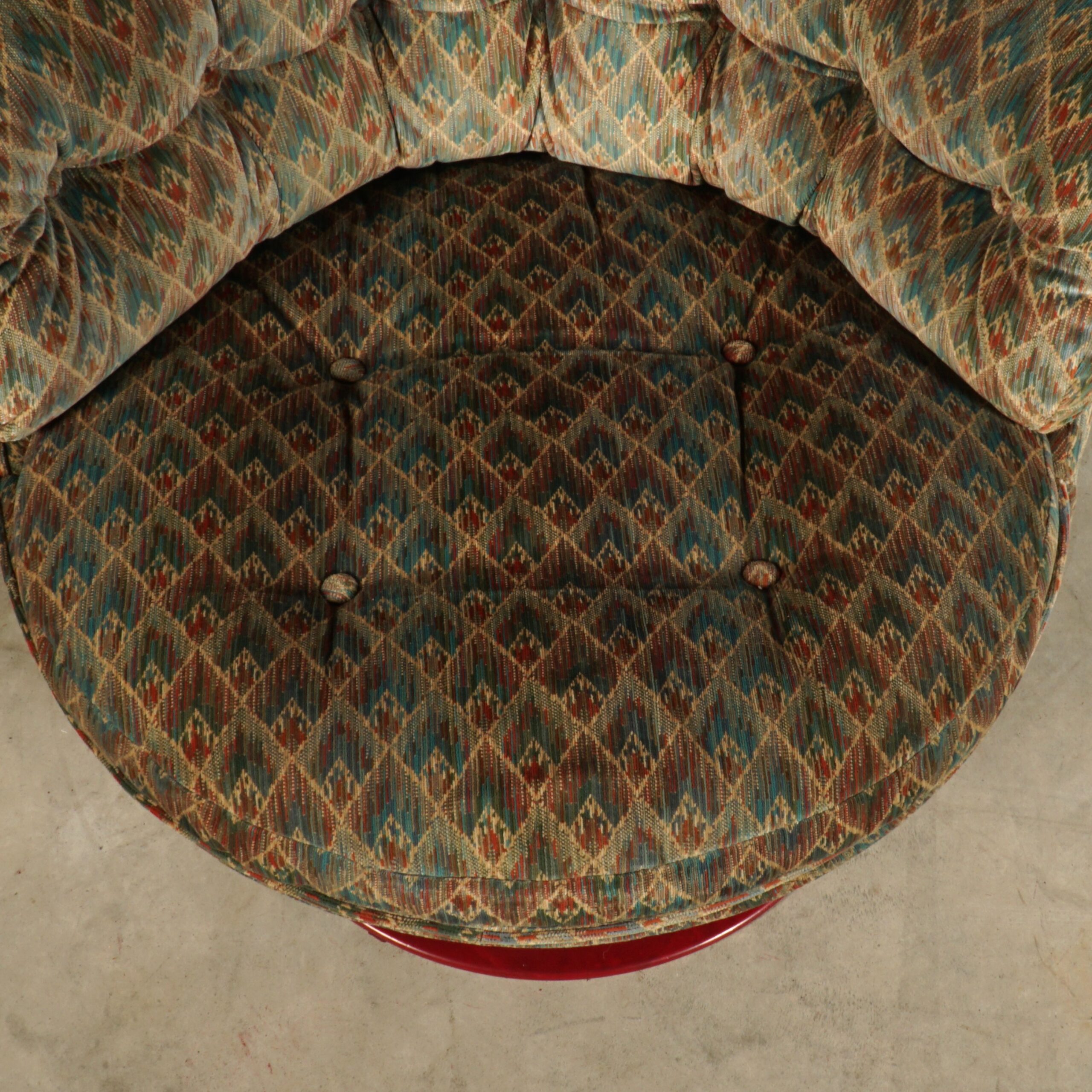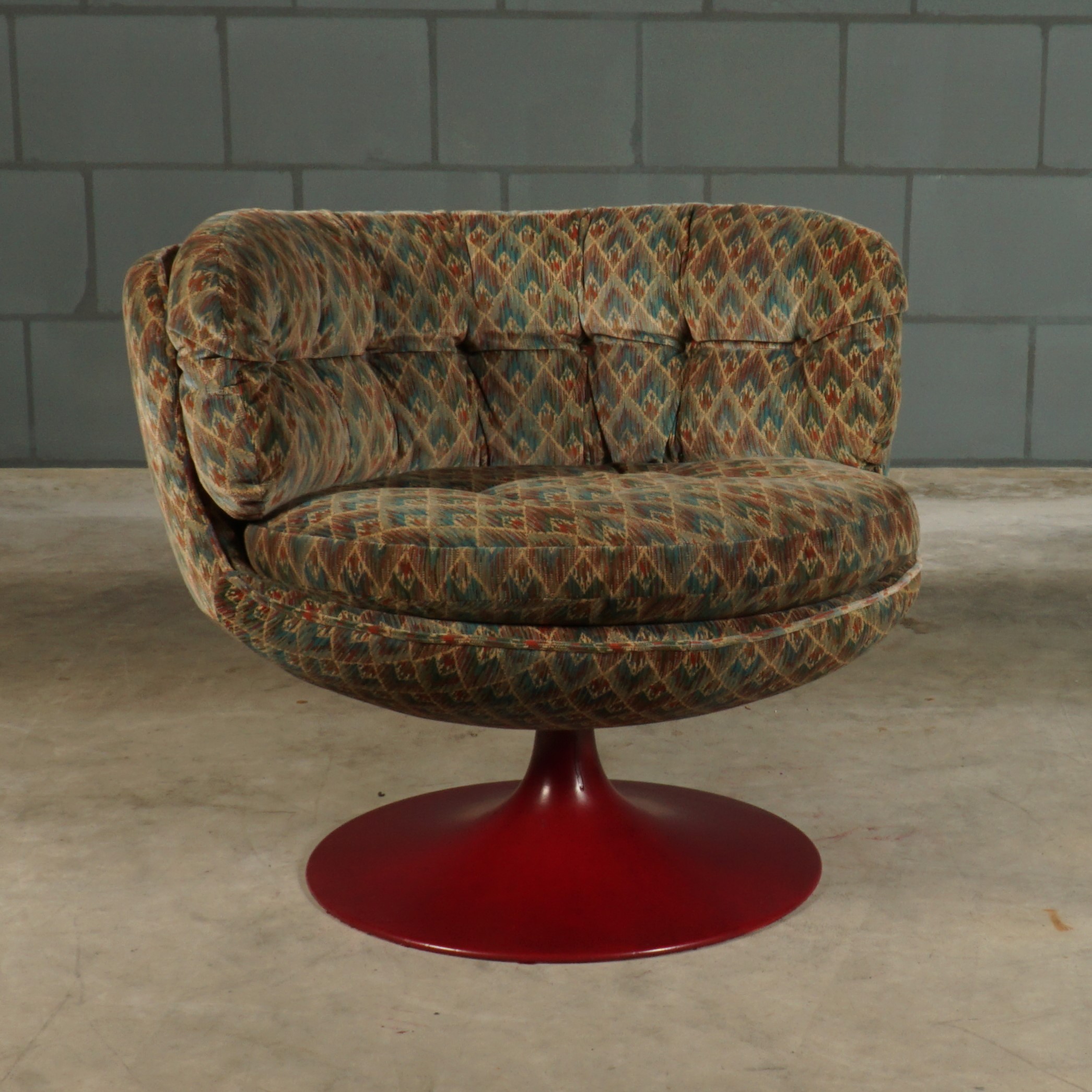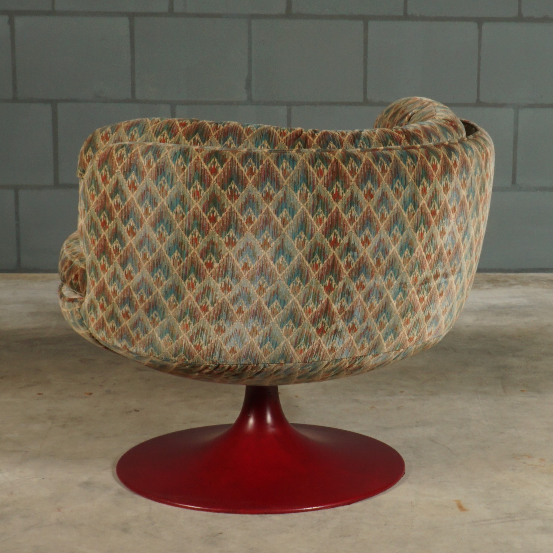Dit kleurrijke vintage juweeltje is een echte ‘one-of-a-kind’ eye-catcher! De stoel is gestoffeerd met een zachte velours stof en heeft een gecapitonneerd rugkussen en zitkussen. De ronde metalen voet is opnieuw gelakt met een wijnrode matte lak. Staat geweldig bij de rode accenten in de stoffen bekleding. De fauteuil betreft een lage loungestoel met een lage rugleuning en zonder draaivoet. De fauteuil is in uitmuntende staat zonder vlekken of beschadigingen.