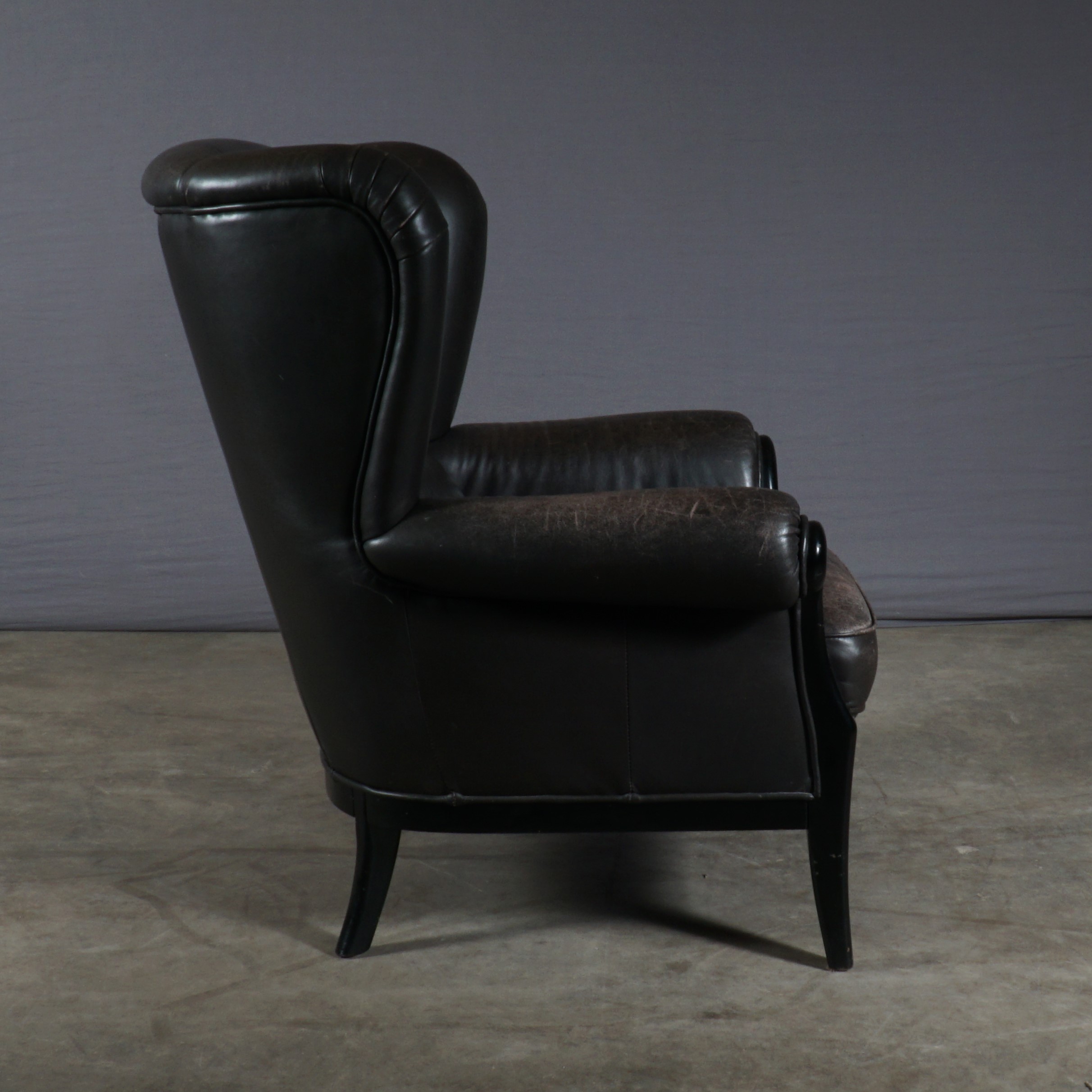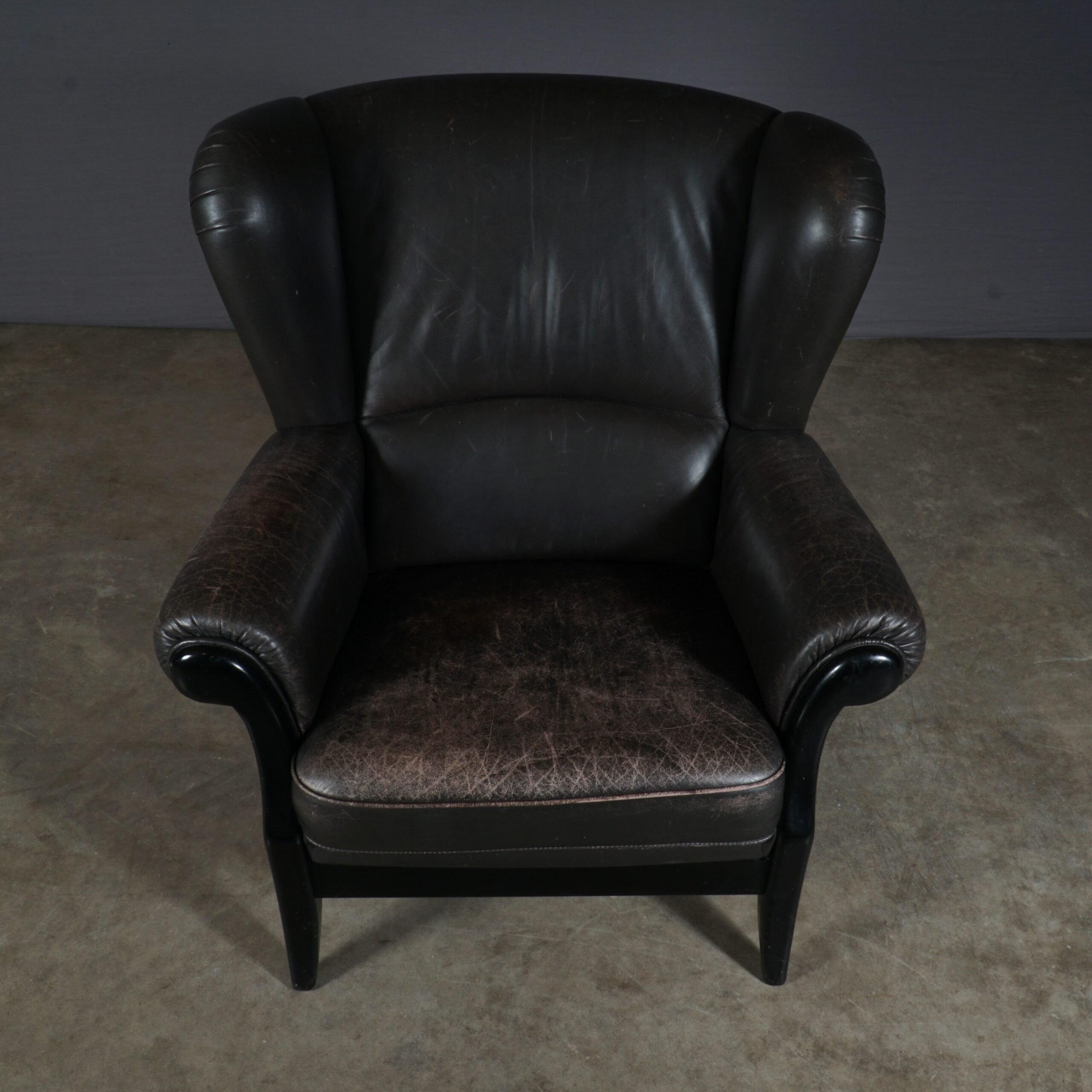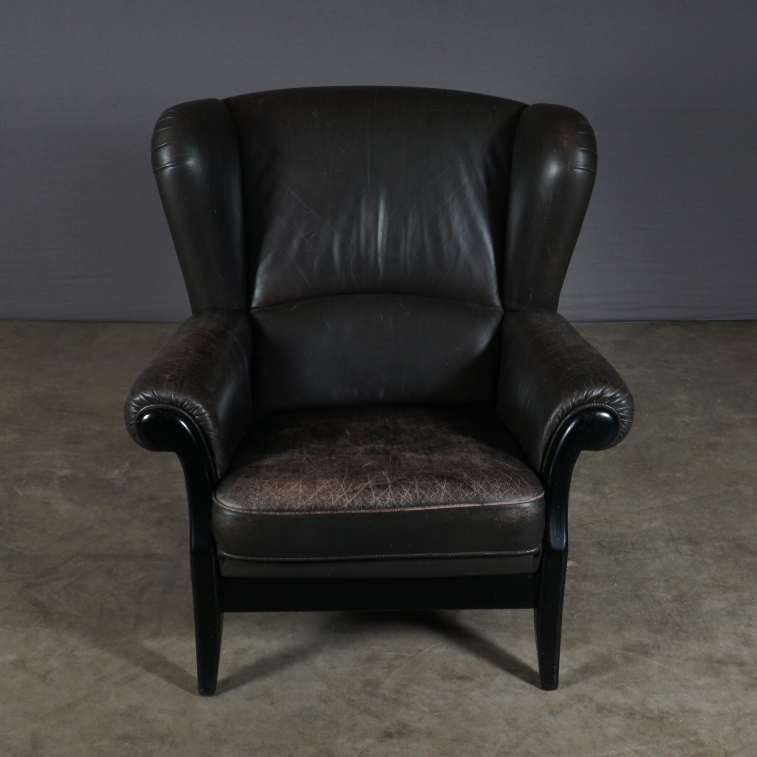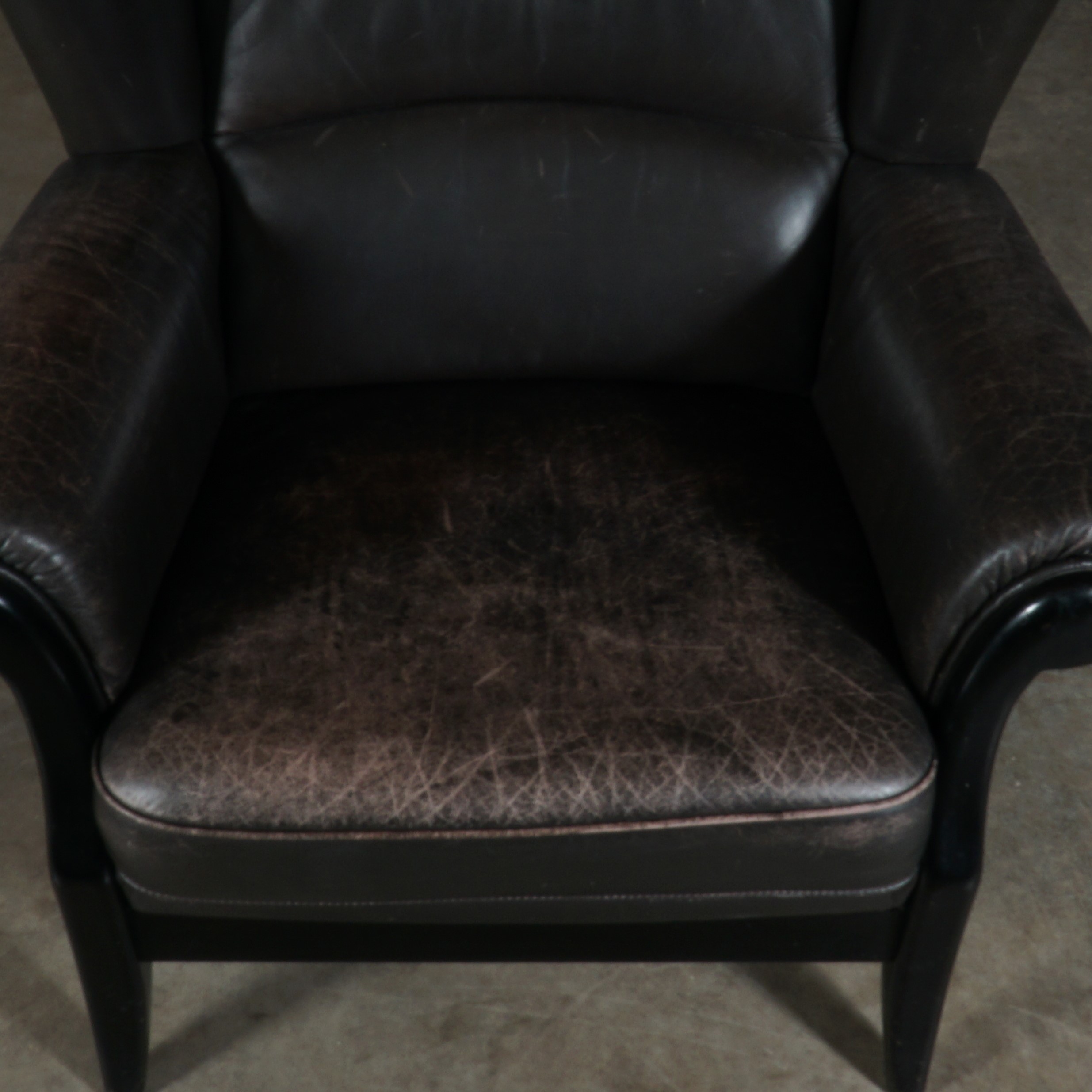 Deze prachtige vintage oorfauteuil is een geweldige combinatie van stijlvol design en gemak. Deze fauteuil bestaat uit een zwart houten frame en heeft een prachtige bruin lederen bekleding. De gevoerde zitting en rugleuning bieden je een stevige maar zeer comfortabele zit. De fauteuil is in mooie vintage staat, waarbij het leer in de loop der jaren een prachtige patina heeft gekregen. Een heerlijke stoel met een stoere uitstraling!