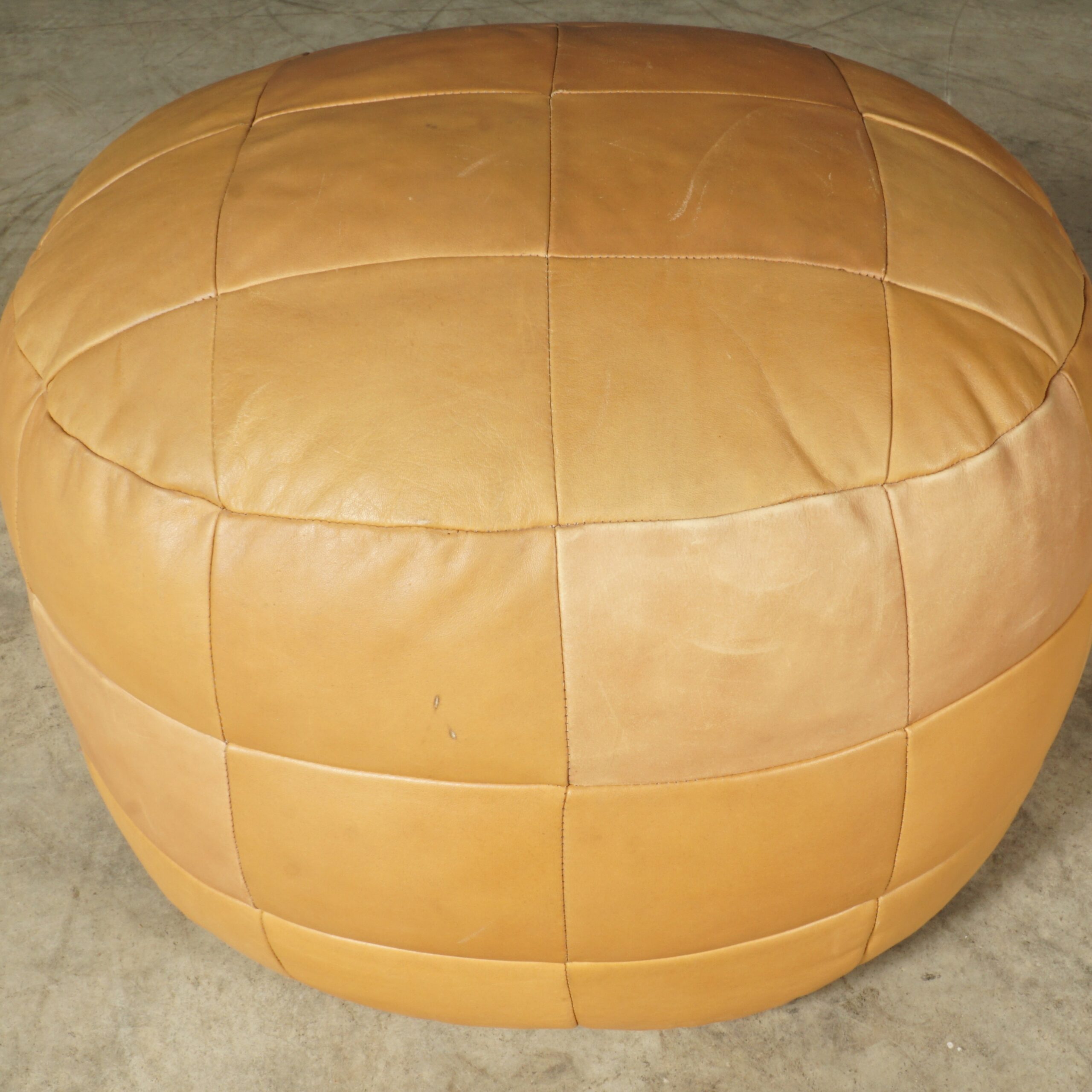Toffe lederen patchwork poef in lichtbruin tinten, vintage jaren 70. Cirkelvormig model met kleine polystyreen balletjes. In hele mooie staat met maar zeer lichte gebruikssporen. Multi inzetbaar. Een mooie aanvulling voor bij een zithoek of op een kinderkamer.
