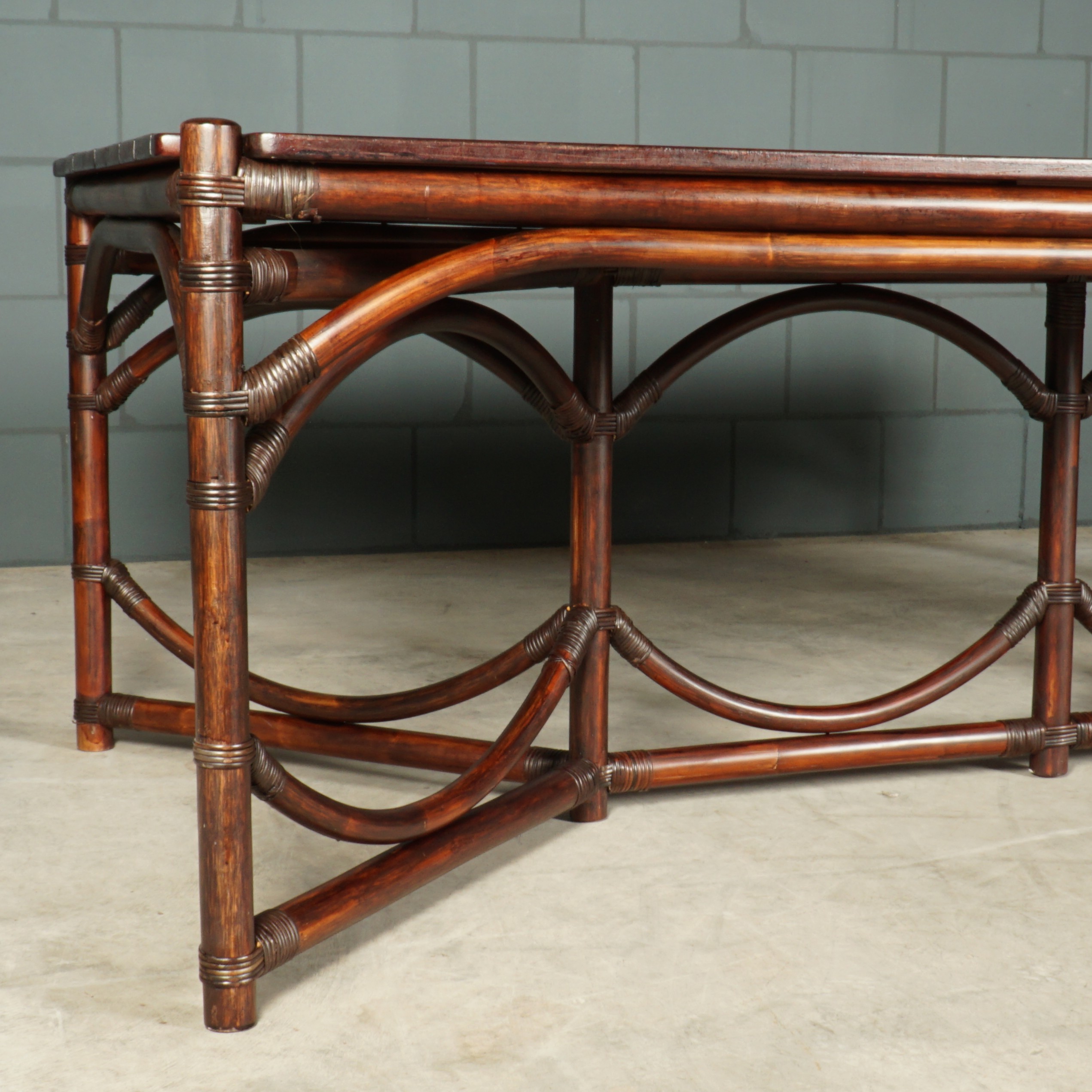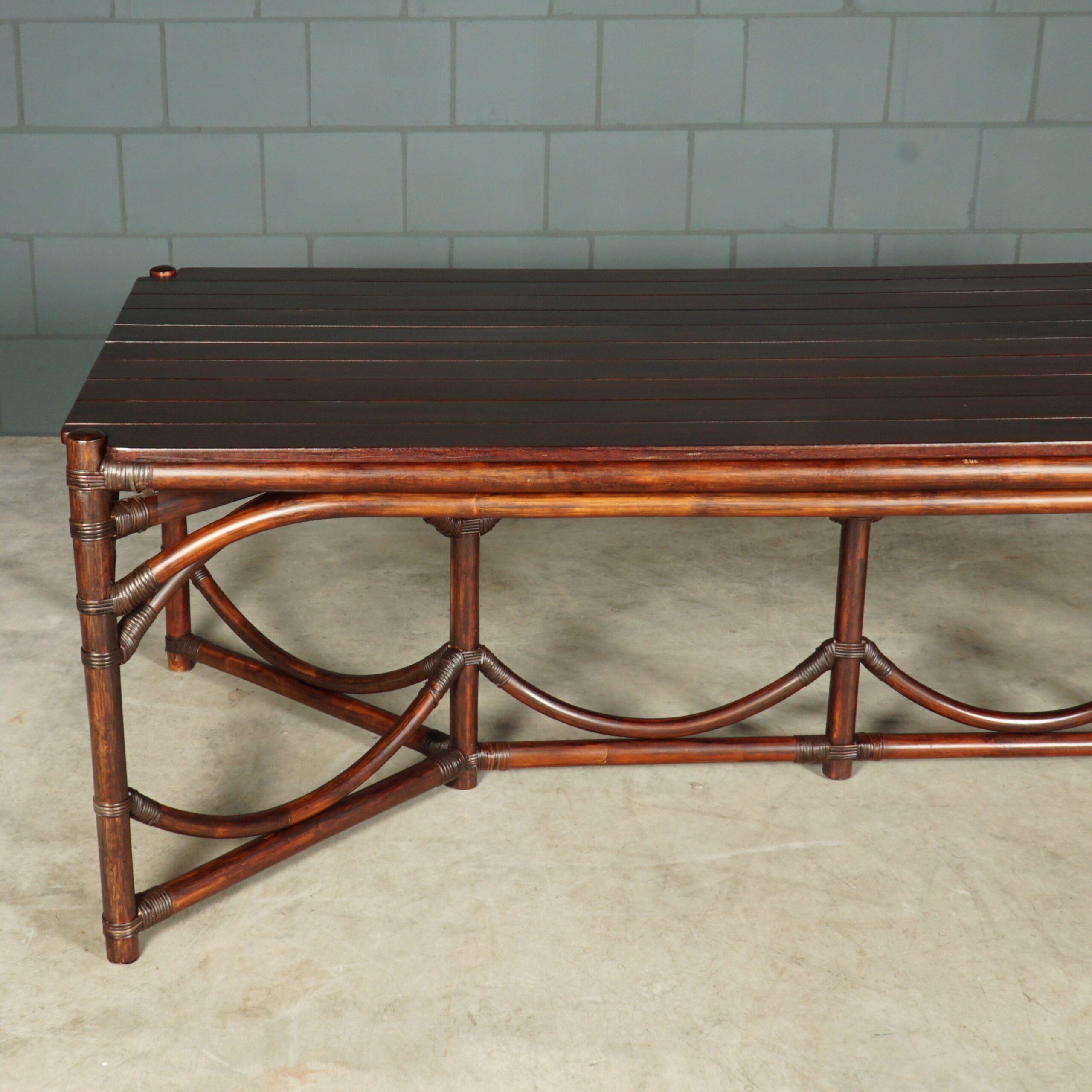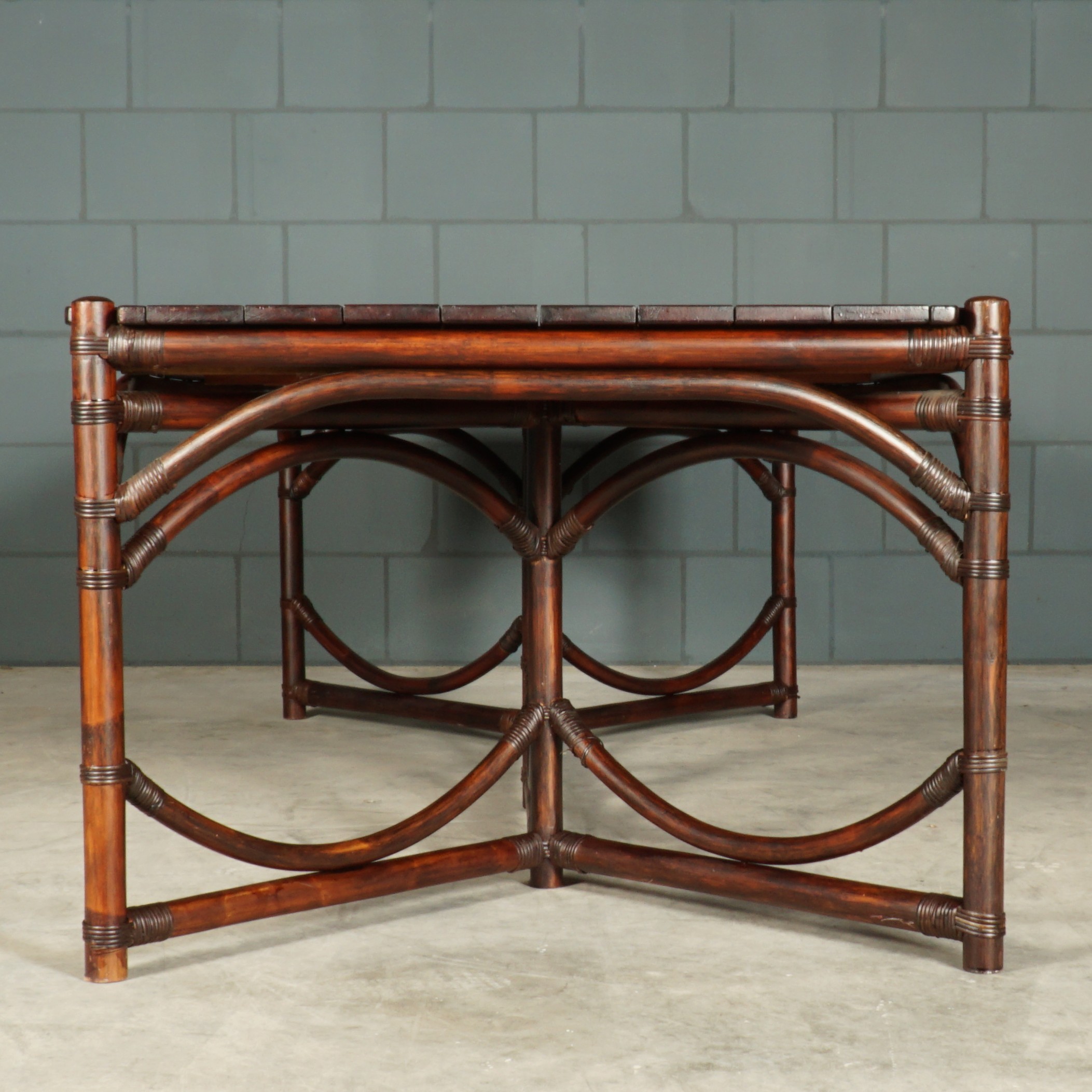 Wat een indrukwekkende tafel is dit! De perfecte combinatie van natuurlijke elegantie en duurzaamheid. Deze manoe/bamboe eettafel met prachtige organische vormen is ontworpen met oog voor detail en vakmanschap. Het zware hardhouten tafelblad rust op het manou onderstel en zorgt voor een goede stabiliteit. De tafel is afgewerkt met een mahoniekleurige beits. Geschikt voor binnen of voor buiten met plaats voor 8 tot 10 personen. Echt in prachtstaat met slechts een paar lichte gebruikssporen.
