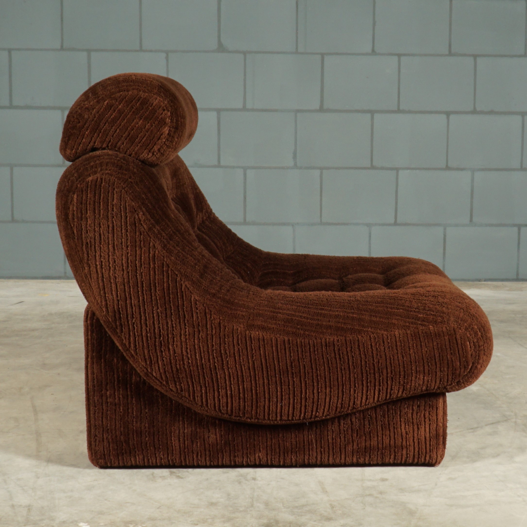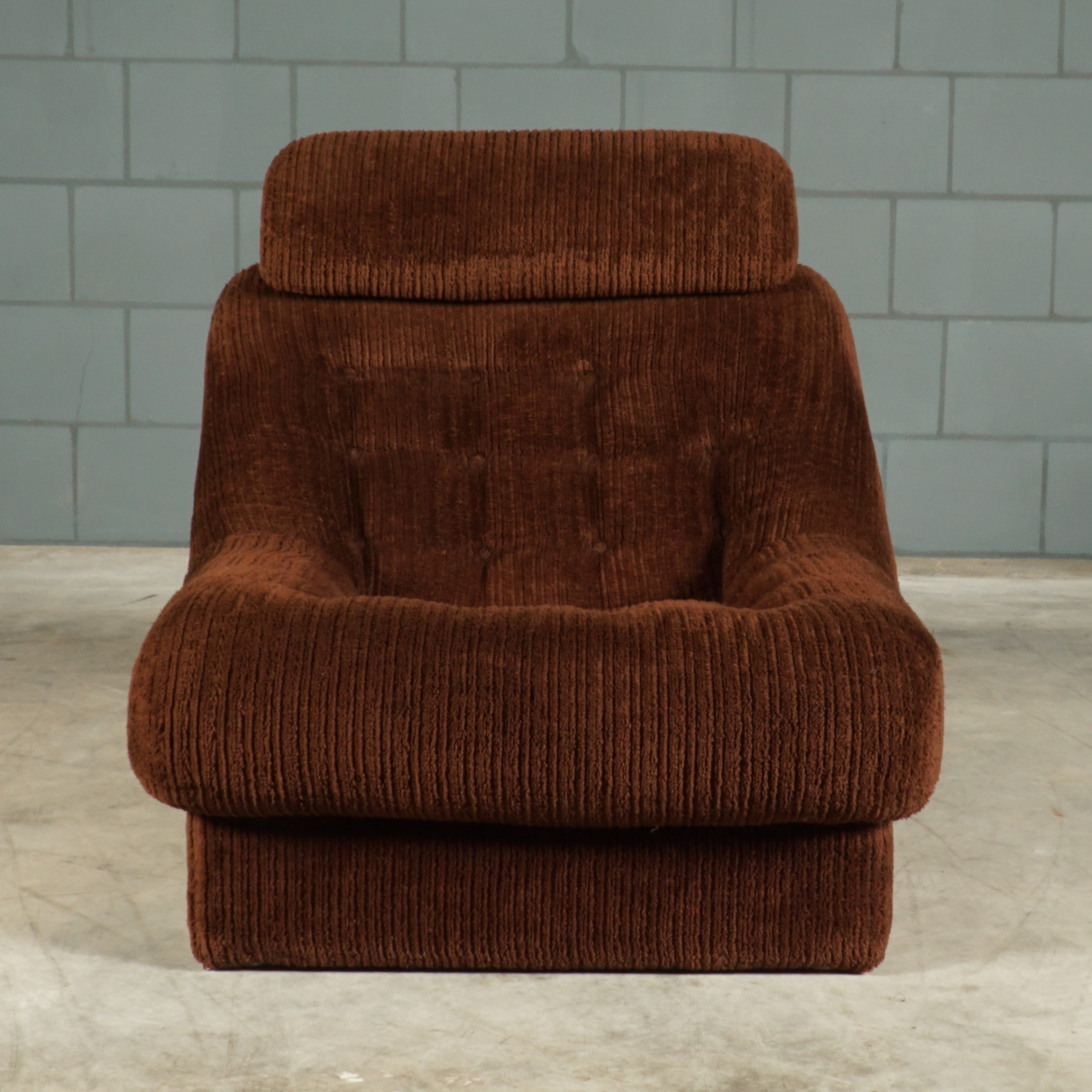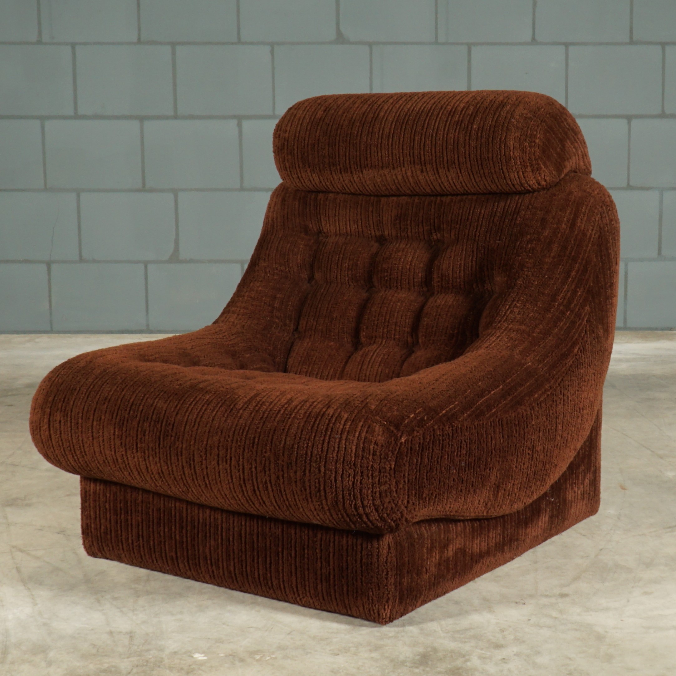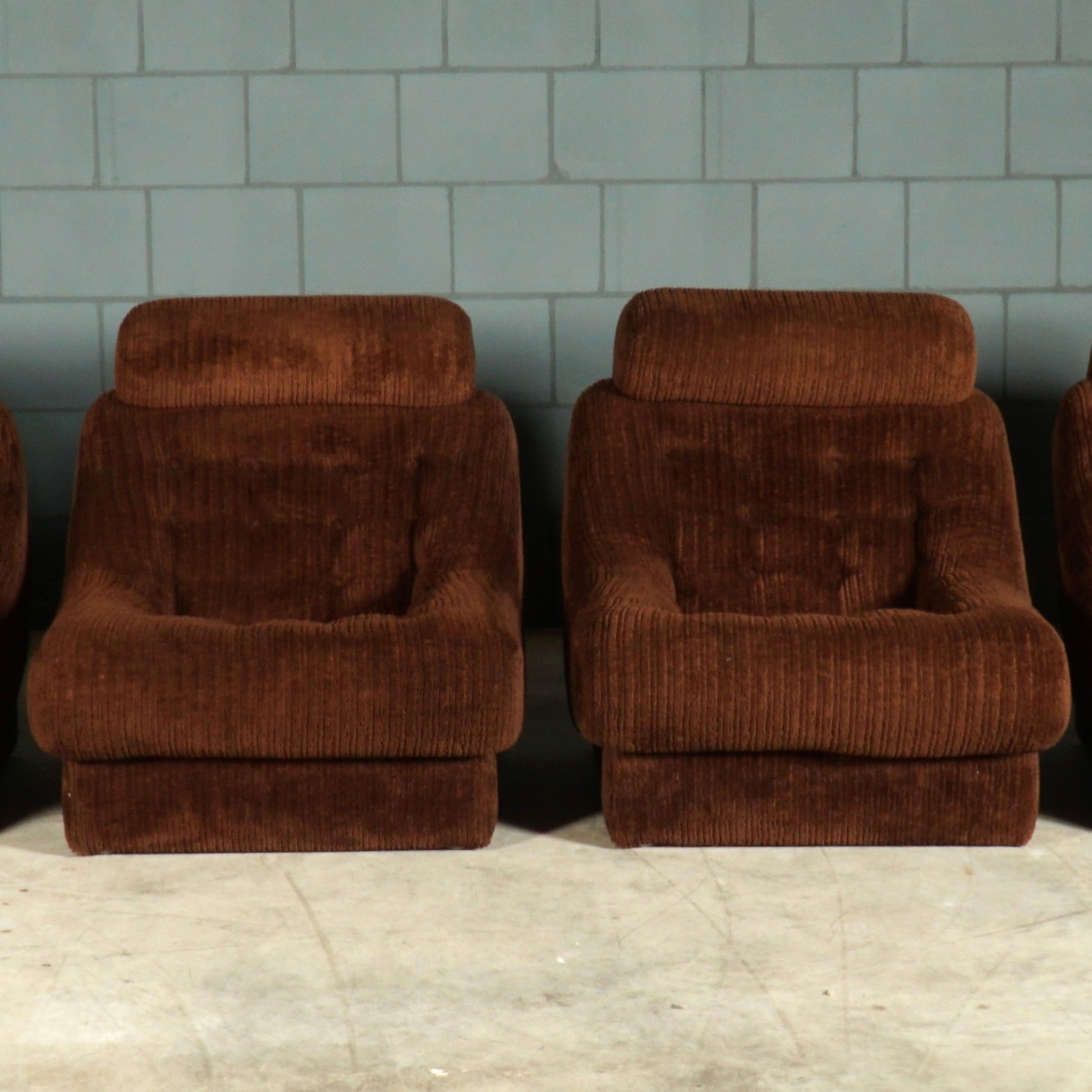 Deze toffe fauteuils, in donkerbruine ribstof, komen uit Duitsland en dateren uit de jaren 70. De fauteuils hebben een zeer goed zitcomfort en een mooi space age design. De fauteuils zijn rondom gestoffeerd. De modules kunnen worden gebruikt als afzonderlijke fauteuils of worden gekoppeld tot een tweezitsbank. Zorg dat je alle tijd van de wereld hebt, als je neerploft in deze comfortabele juweeltjes. Eenmaal gesetteld, kom je er niet meer uit! Zo heerlijk!! De set is in hele mooie vintage staat met lichte gebruikssporen.