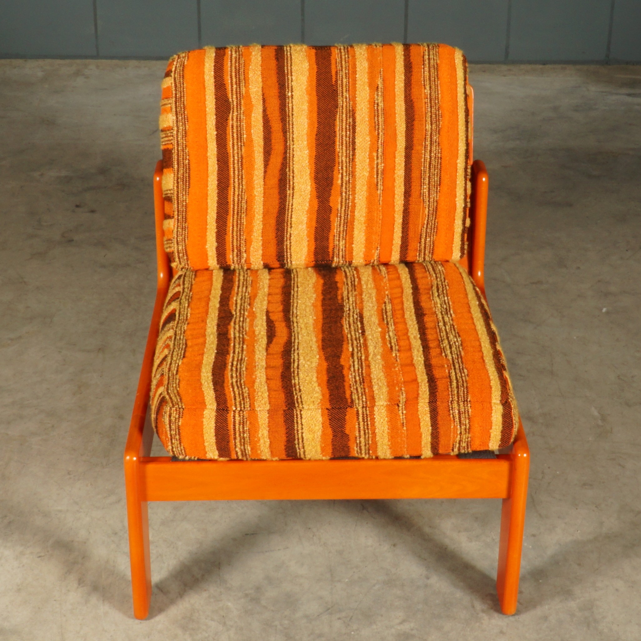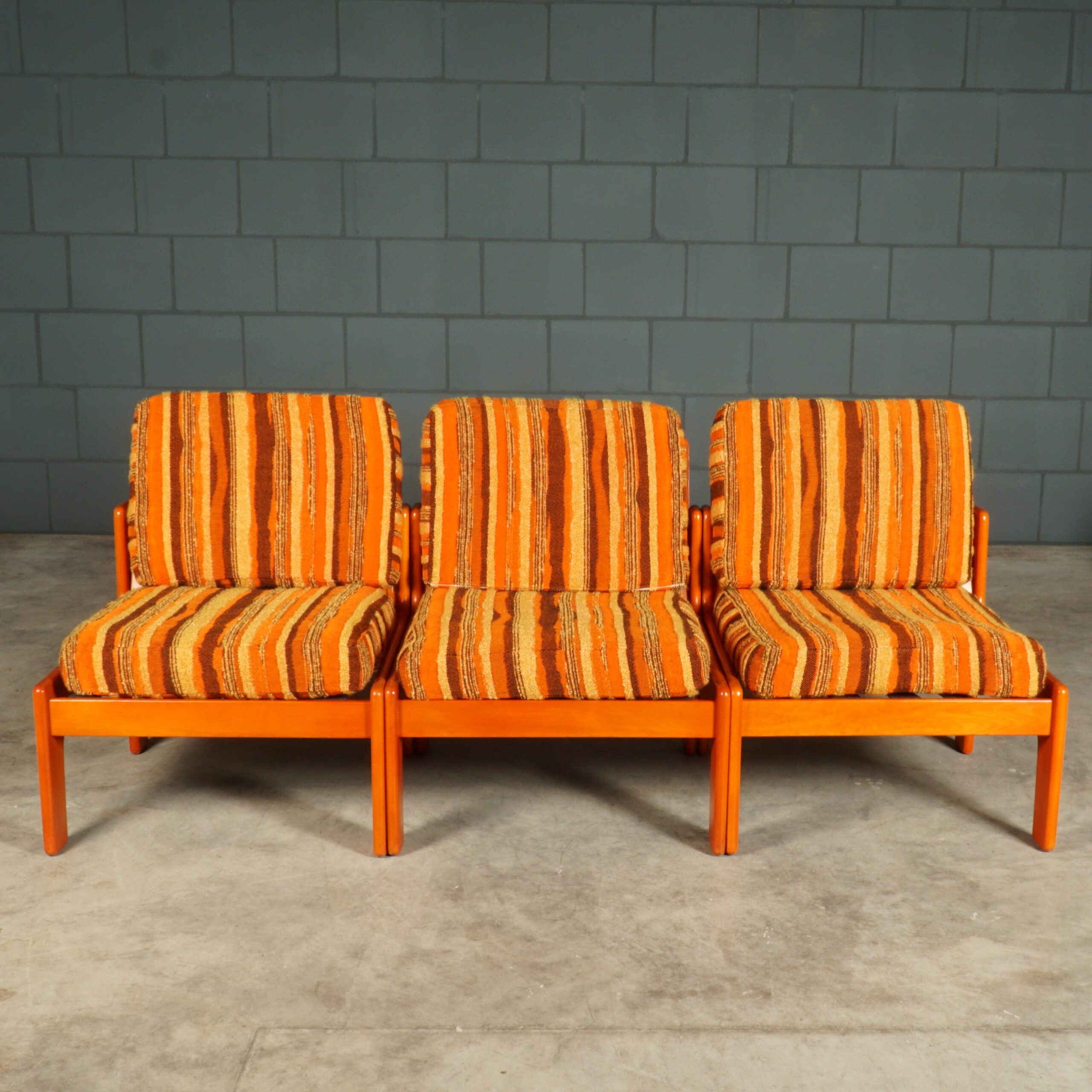 Back to the “seventies”!! Deze modulaire bank met 3 elementen heeft alles in huis om de jaren 70 weer helemaal terug te brengen in je interieur. Met de oranje houten frames en de oranje-bruine stoffen bekleding steelt deze kleurrijke set de show, waar dan ook. De set komt uit Duitsland. Houd je van een kleurrijk interieur en een fijn zacht zitcomfort, zoek dan niet meer verder! Gelet op de leeftijd, nog in hele mooie staat met slechts lichte gebruikssporen.