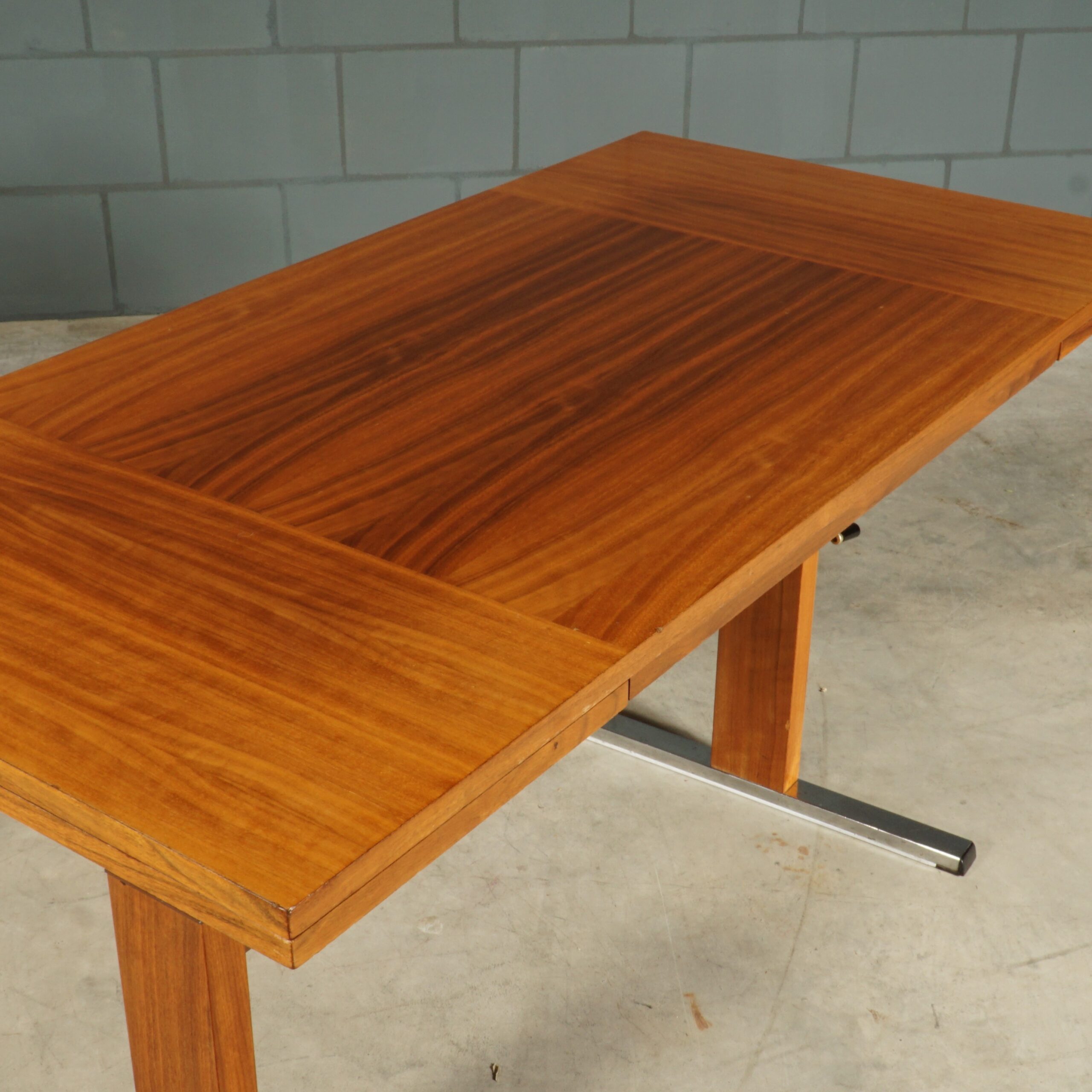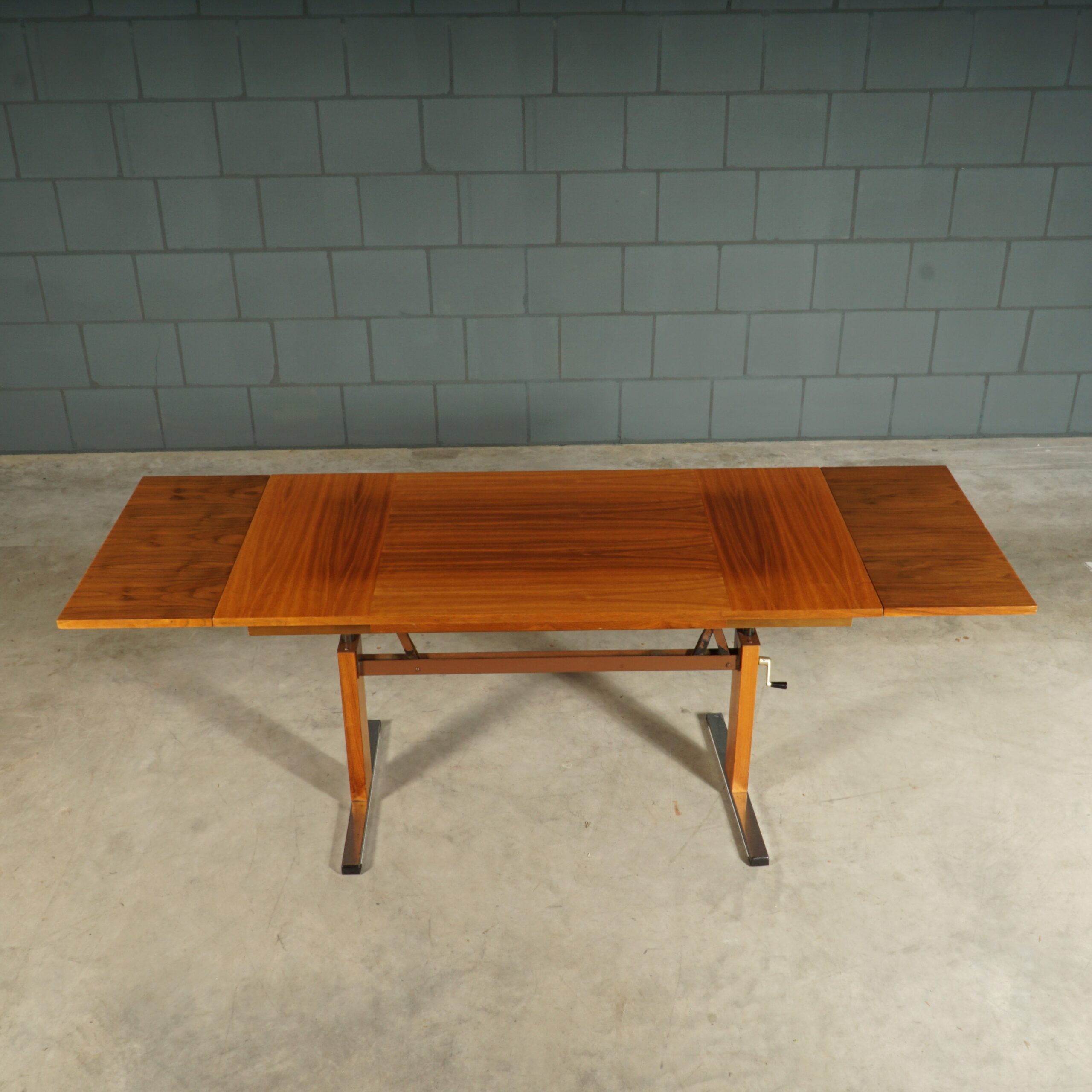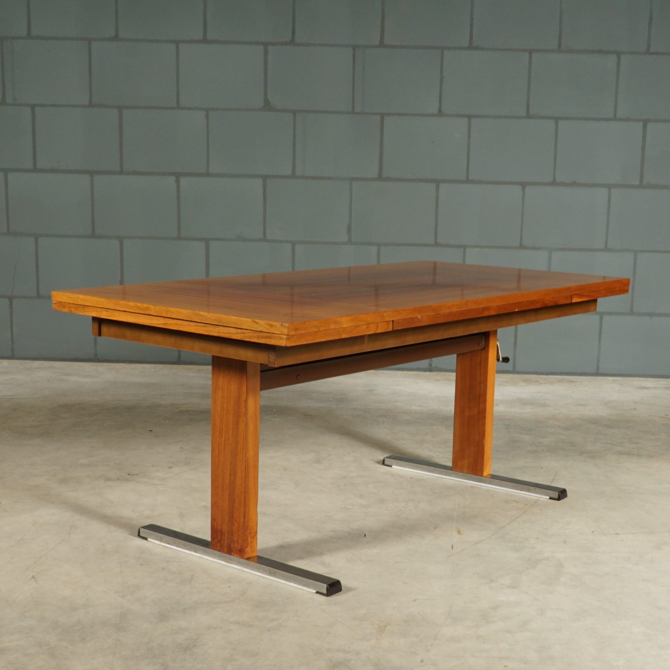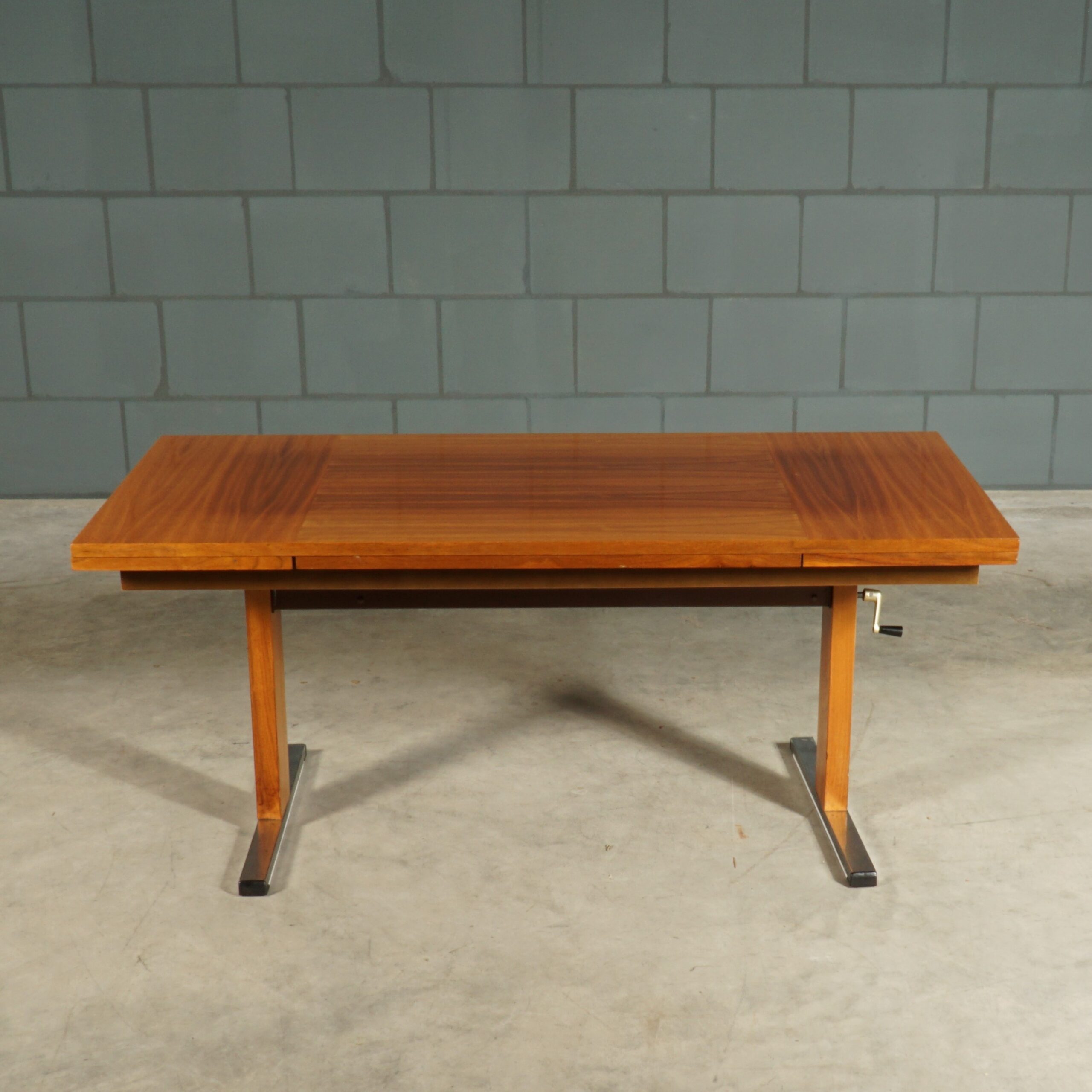 Deze bijzonder mooie salontafel/eettafel dateert uit de jaren 70 en is gemaakt van notenhout, afgewerkt met een hoogglans lak. Het blad heeft een prachtig motief en een bijzonder onderstel met chromen poten. De tafel is door middel van een draaimechanisme onder het blad in hoogte verstelbaar. Zo kun je in een handomdraai van een lage salontafel (58 cm hoog) een hogere eettafel maken (71 cm hoog). Dit onderstel is een ontzettend leuk detail aan deze eye-catcher! Niet is de tafel alleen in hoogte verstelbaar, ook heeft de tafel twee geïntegreerde verlengstukken, waarmee je de tafel ook kunt verlengen van 130 cm naar 190 cm. Je kunt dus alle kanten op met deze tafel! De tafel is in mooie vintage staat met lichte gebruikerssporen.