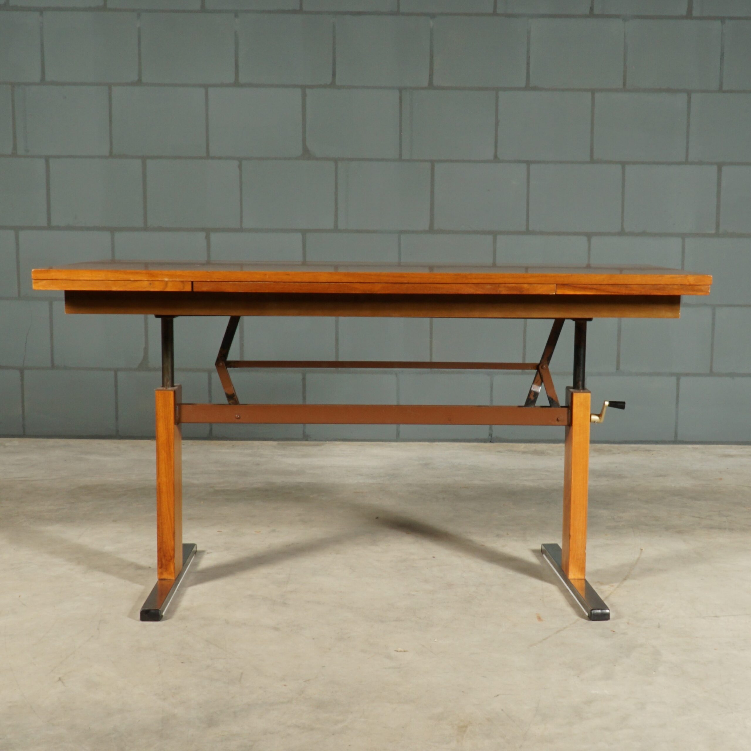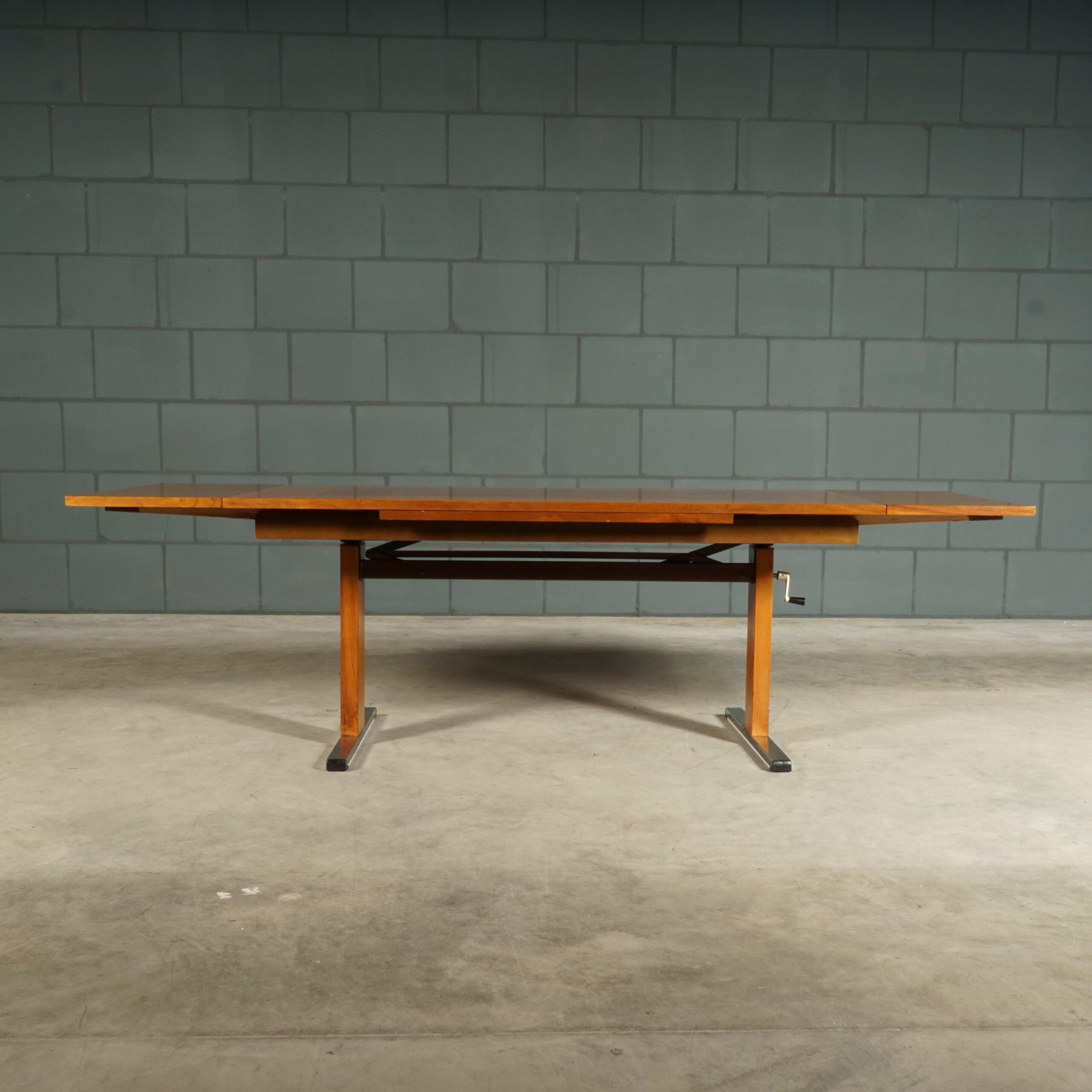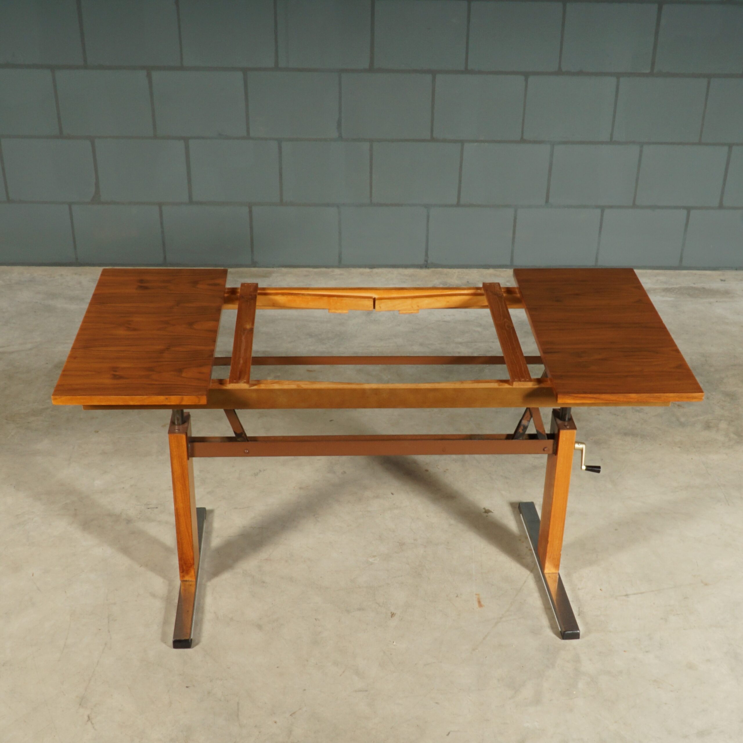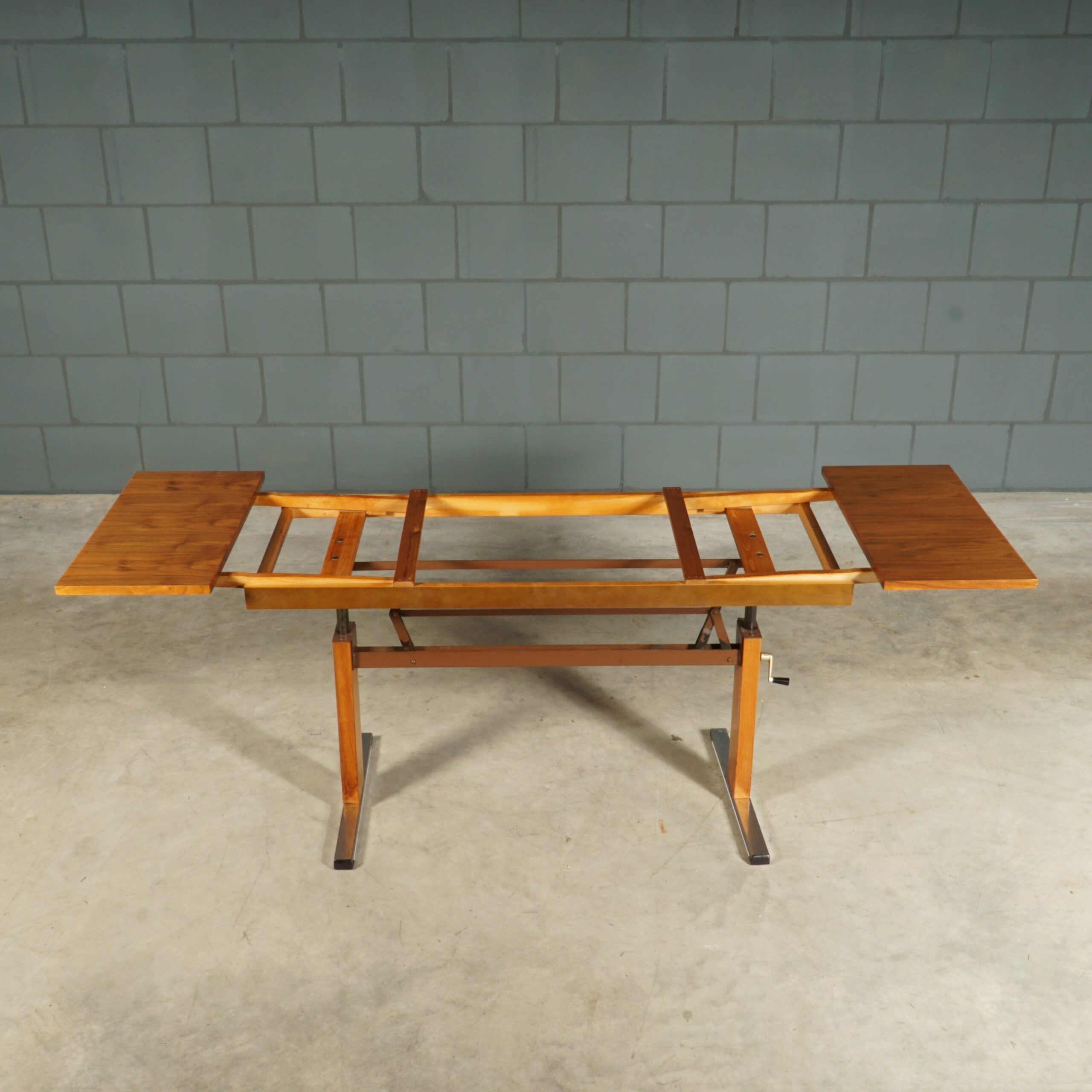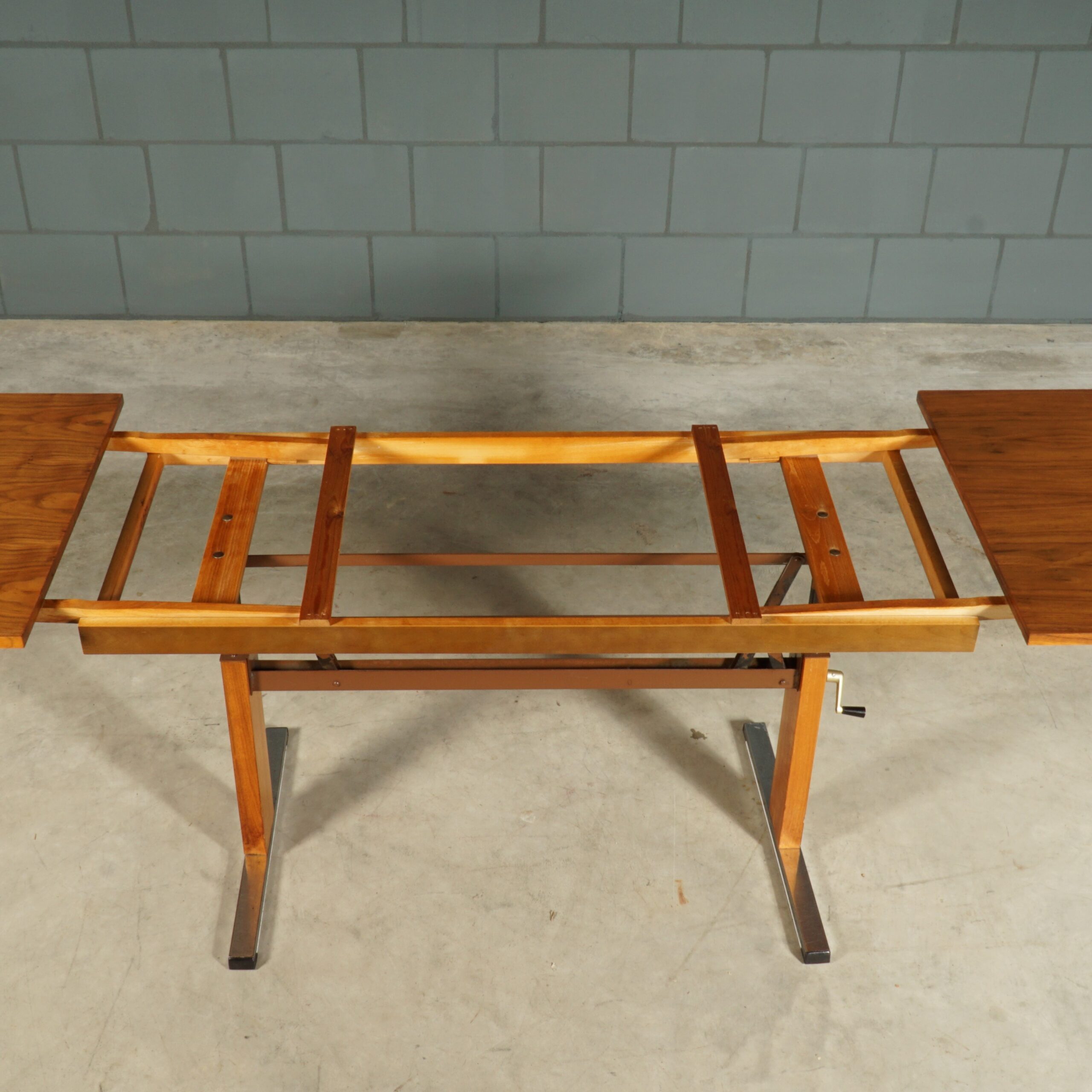 Deze bijzonder mooie salontafel/eettafel dateert uit de jaren 70 en is gemaakt van notenhout, afgewerkt met een hoogglans lak. Het blad heeft een prachtig motief en een bijzonder onderstel met chromen poten. De tafel is door middel van een draaimechanisme onder het blad in hoogte verstelbaar. Zo kun je in een handomdraai van een lage salontafel (58 cm hoog) een hogere eettafel maken (71 cm hoog). Dit onderstel is een ontzettend leuk detail aan deze eye-catcher! Niet is de tafel alleen in hoogte verstelbaar, ook heeft de tafel twee geïntegreerde verlengstukken, waarmee je de tafel ook kunt verlengen van 130 cm naar 190 cm. Je kunt dus alle kanten op met deze tafel! De tafel is in mooie vintage staat met lichte gebruikerssporen.