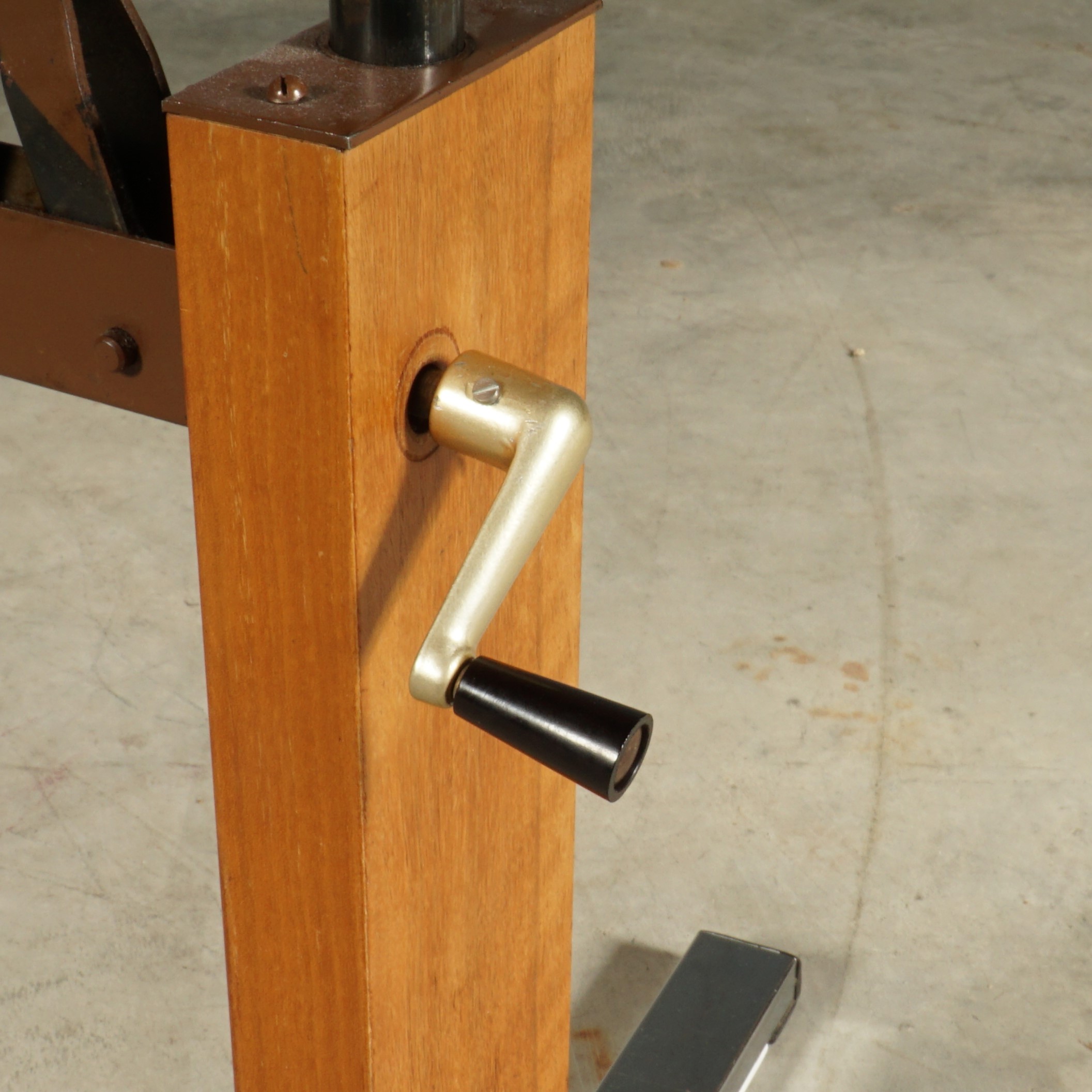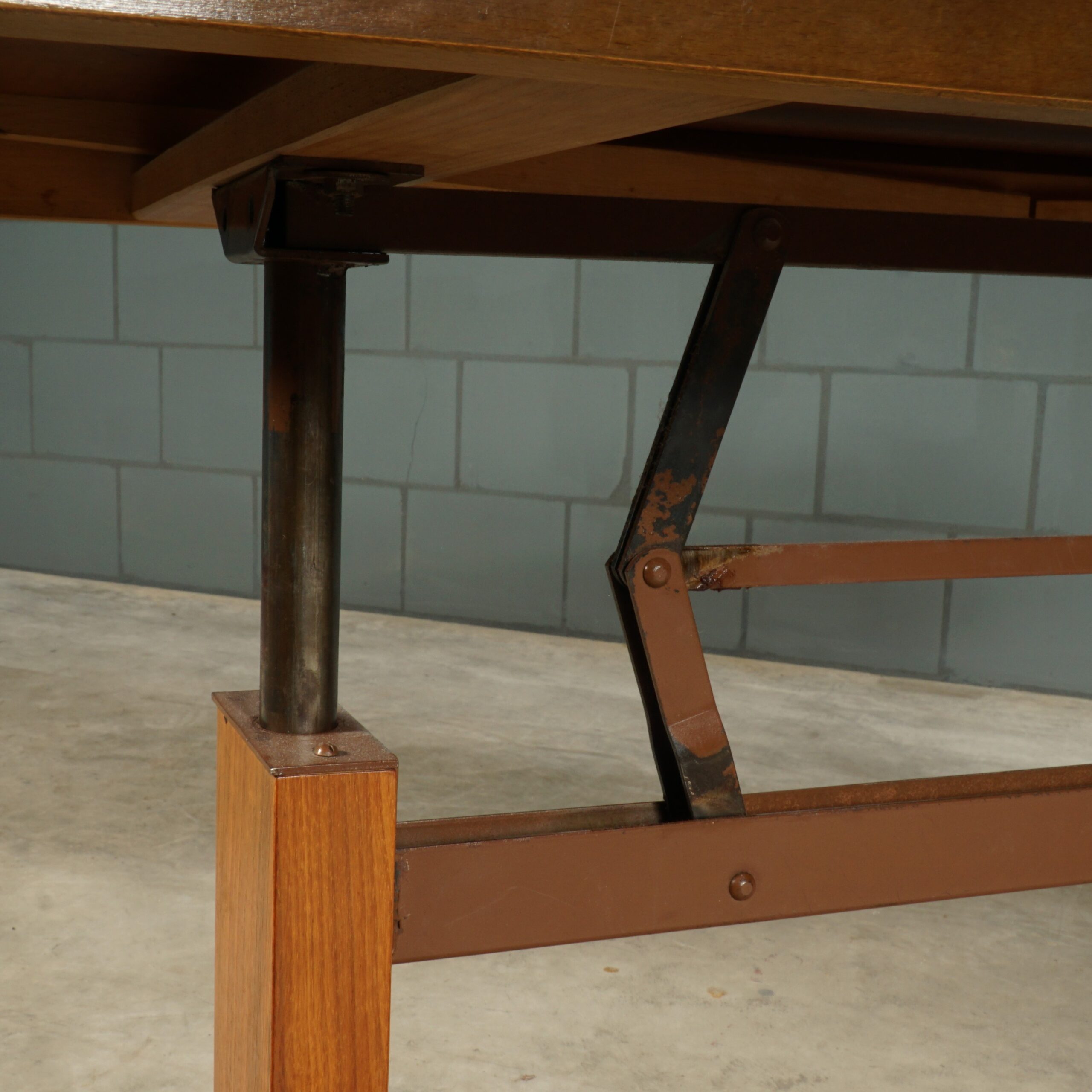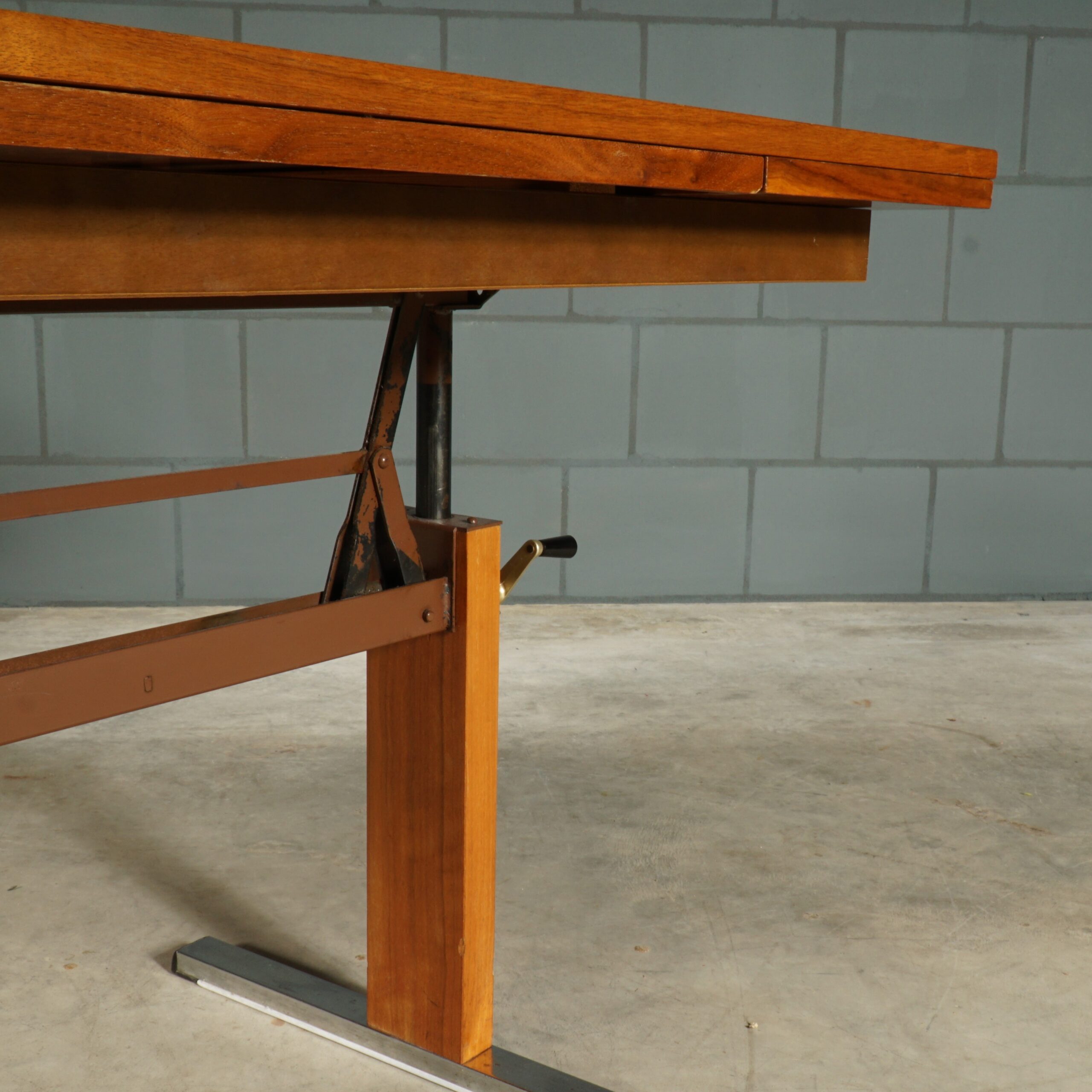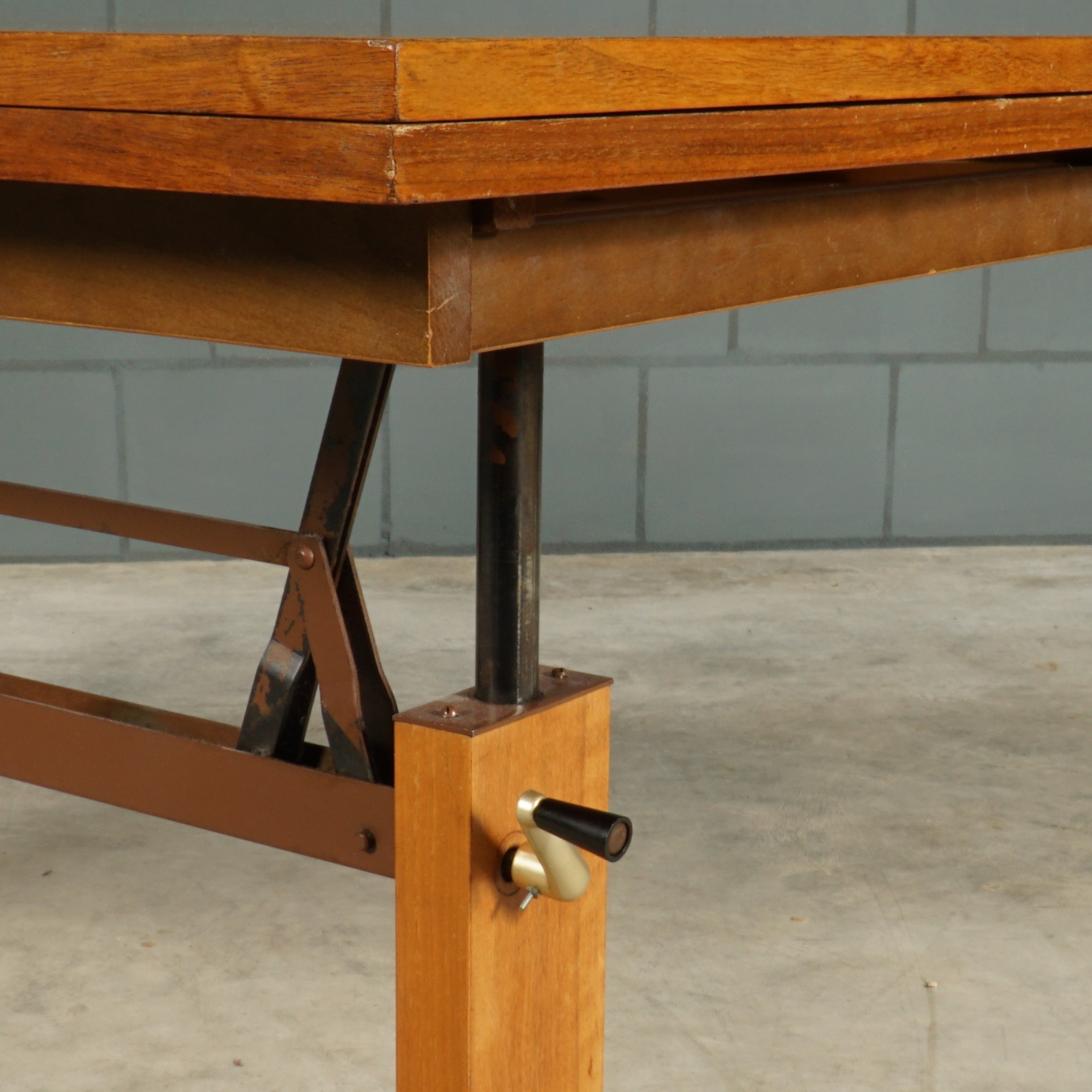 Deze bijzonder mooie salontafel/eettafel dateert uit de jaren 70 en is gemaakt van notenhout, afgewerkt met een hoogglans lak. Het blad heeft een prachtig motief en een bijzonder onderstel met chromen poten. De tafel is door middel van een draaimechanisme onder het blad in hoogte verstelbaar. Zo kun je in een handomdraai van een lage salontafel (58 cm hoog) een hogere eettafel maken (71 cm hoog). Dit onderstel is een ontzettend leuk detail aan deze eye-catcher! Niet is de tafel alleen in hoogte verstelbaar, ook heeft de tafel twee geïntegreerde verlengstukken, waarmee je de tafel ook kunt verlengen van 130 cm naar 190 cm. Je kunt dus alle kanten op met deze tafel! De tafel is in mooie vintage staat met lichte gebruikerssporen.