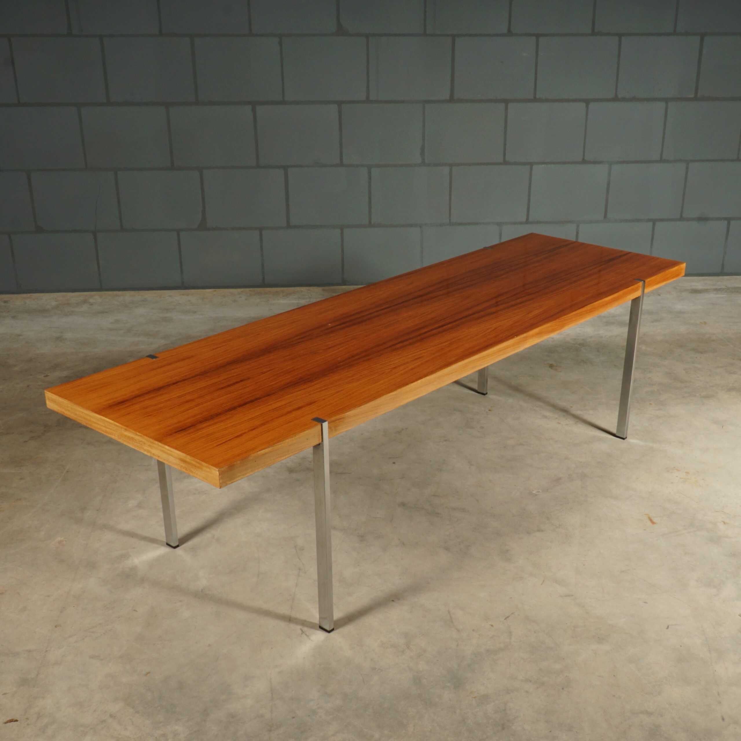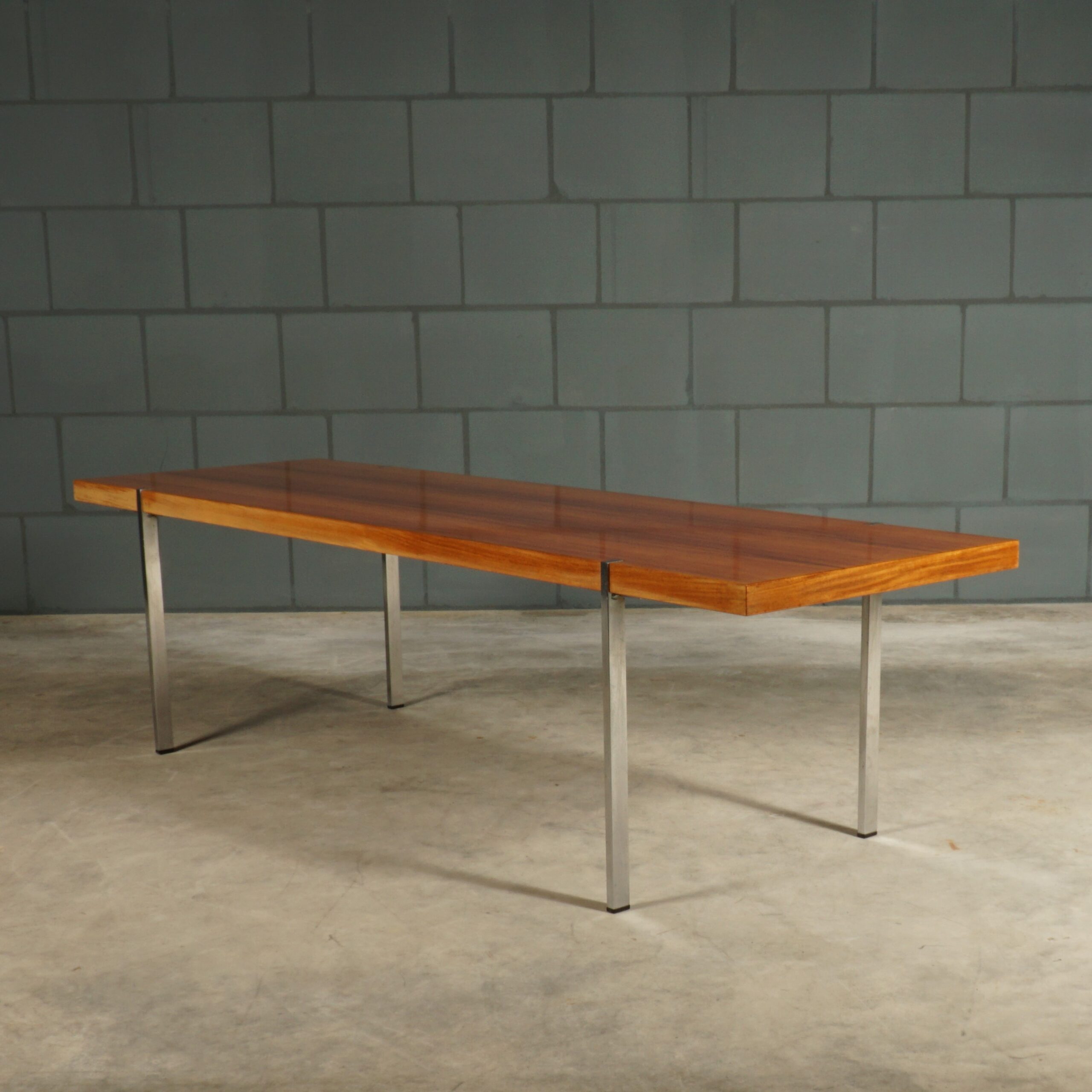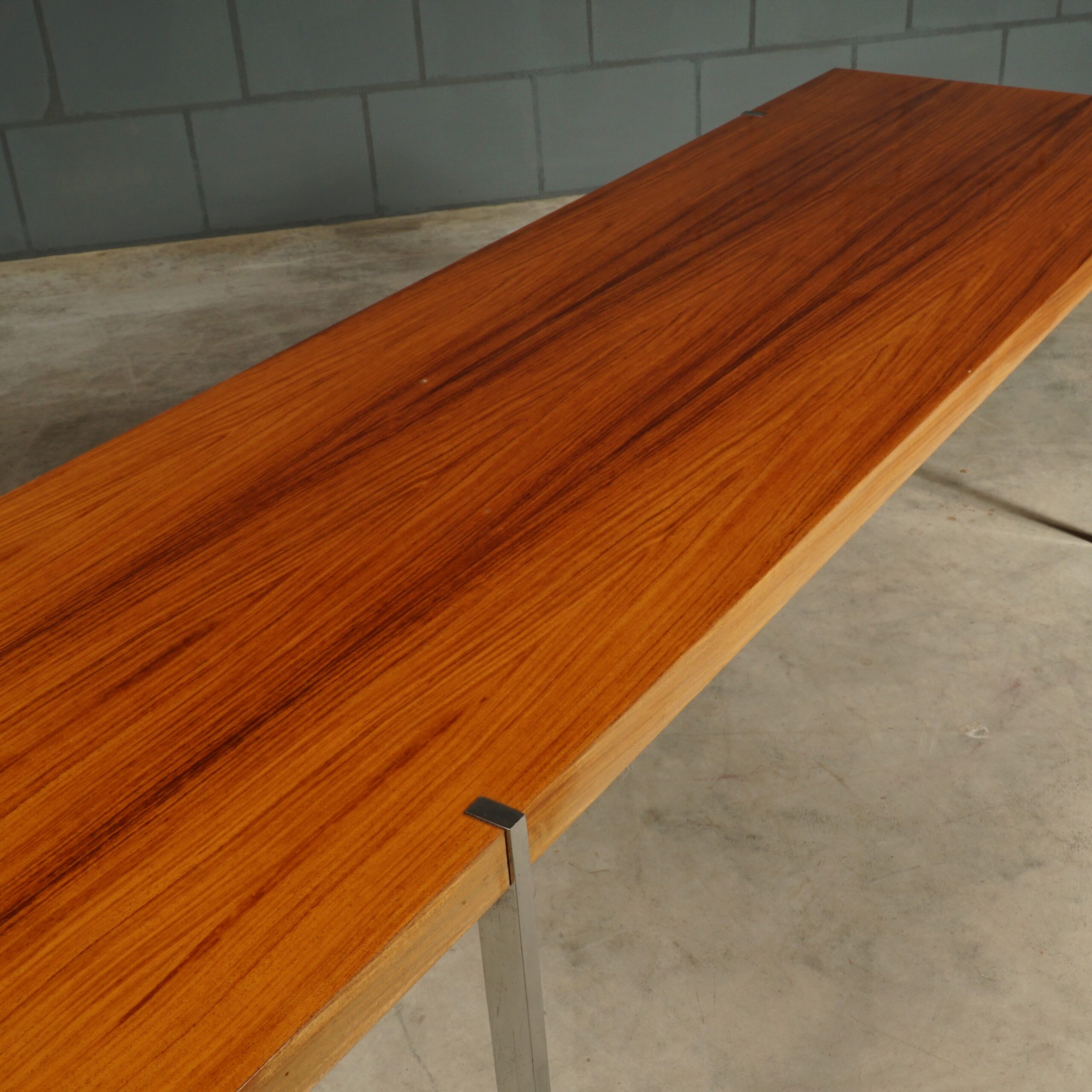 Deze prachtige klassieke palissanderhouten salontafel dateert uit de jaren 1960 en is ontworpen door de Duitse ontwerper Wilhelm Renz voor Metallbau Veyhl (Branding onder het tafelblad). De grote salontafel is ingelegd met prachtig Rio palissander fineer en de rechthoekige chromen poten zijn mooi verzonken in het tafelblad gemonteerd. De tafel is in zeer mooie staat met slechts lichte gebruikssporen. Een absoluut vintage juweeltje van kwaliteit waar je u tegen zegt!