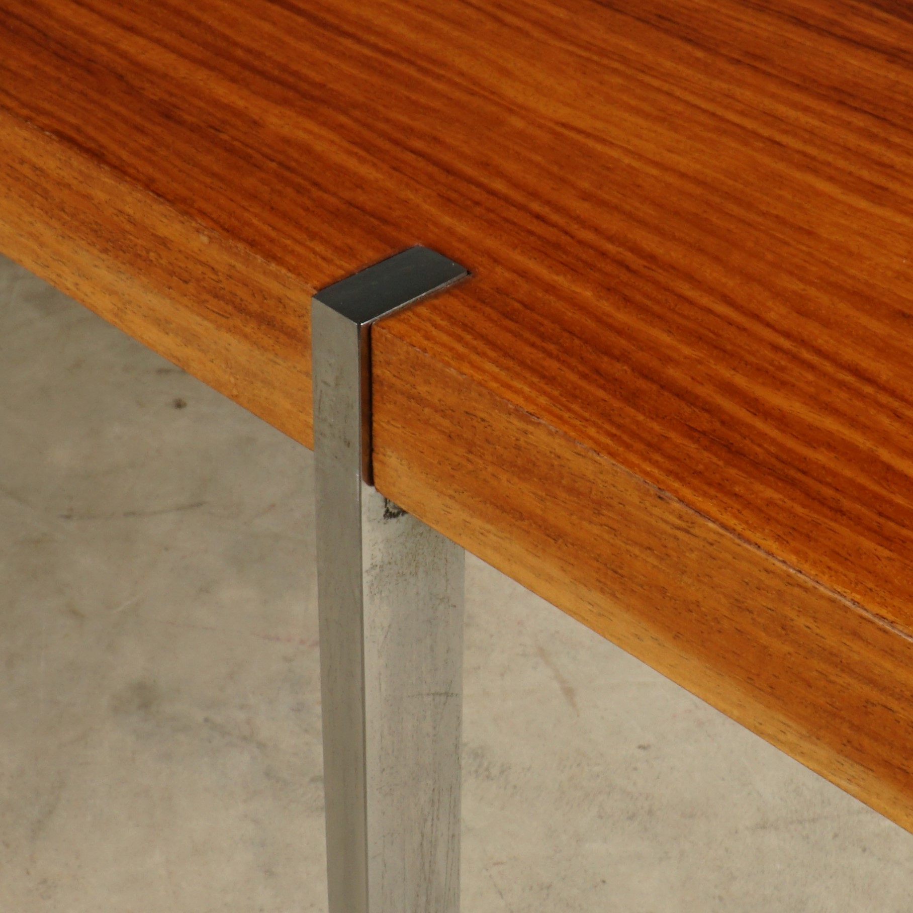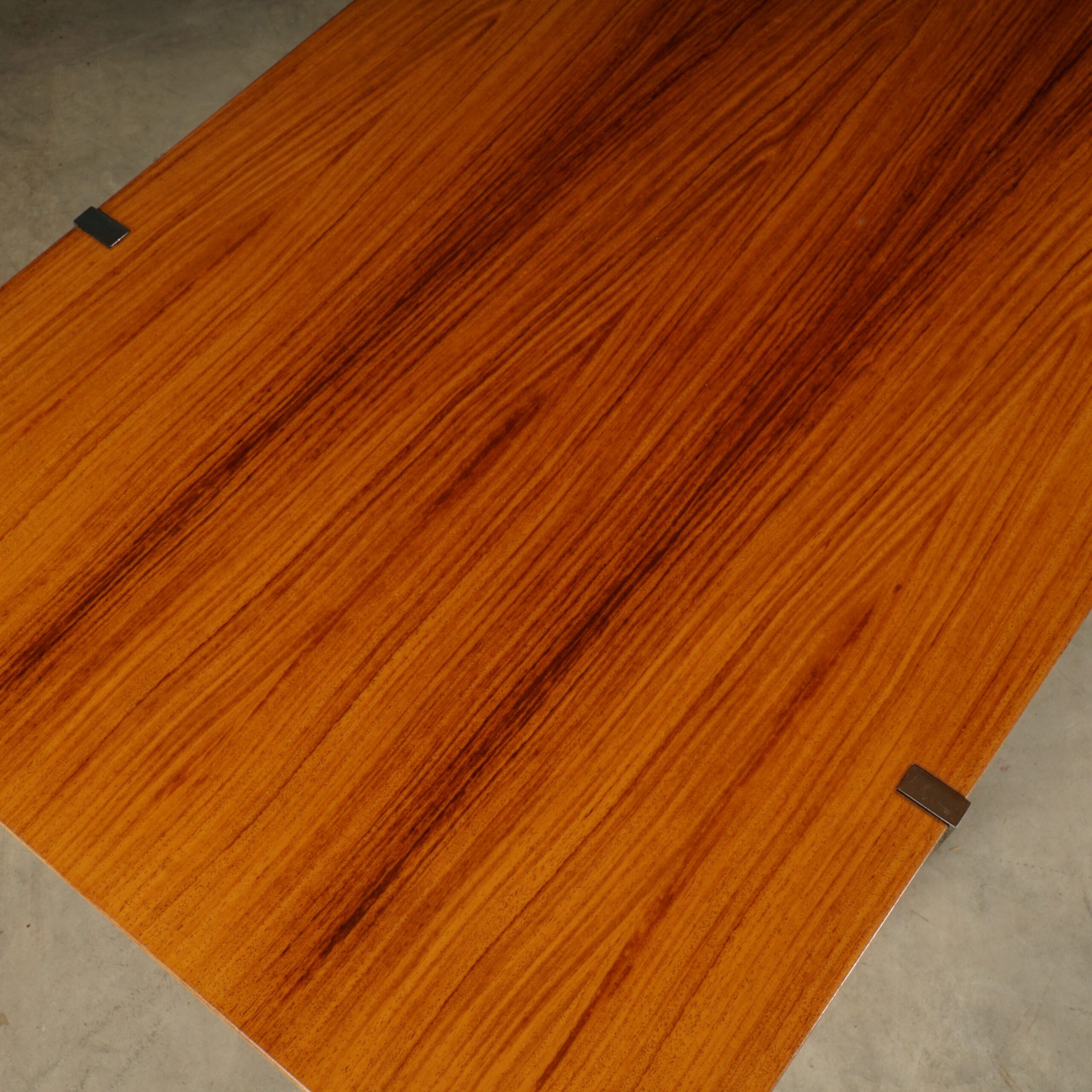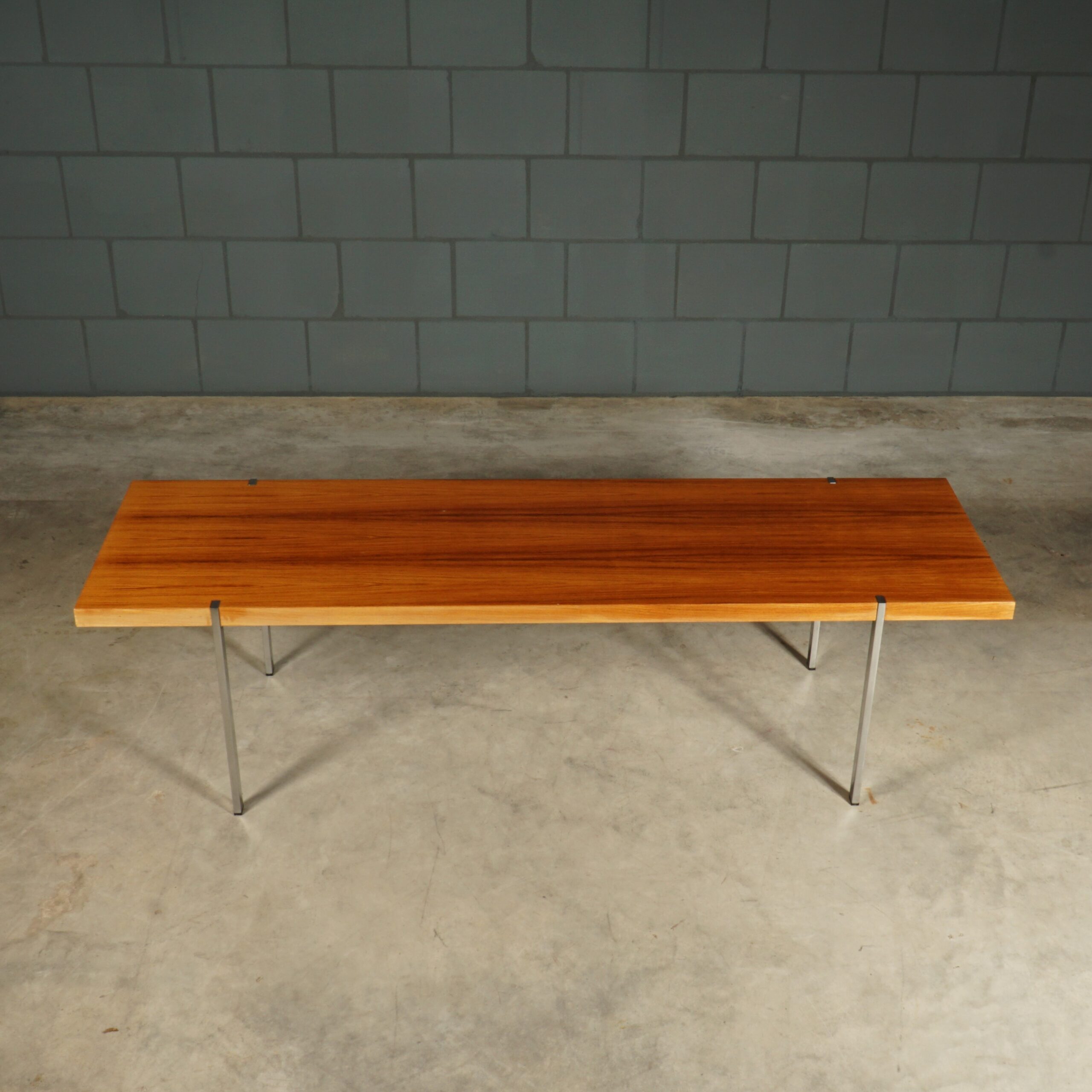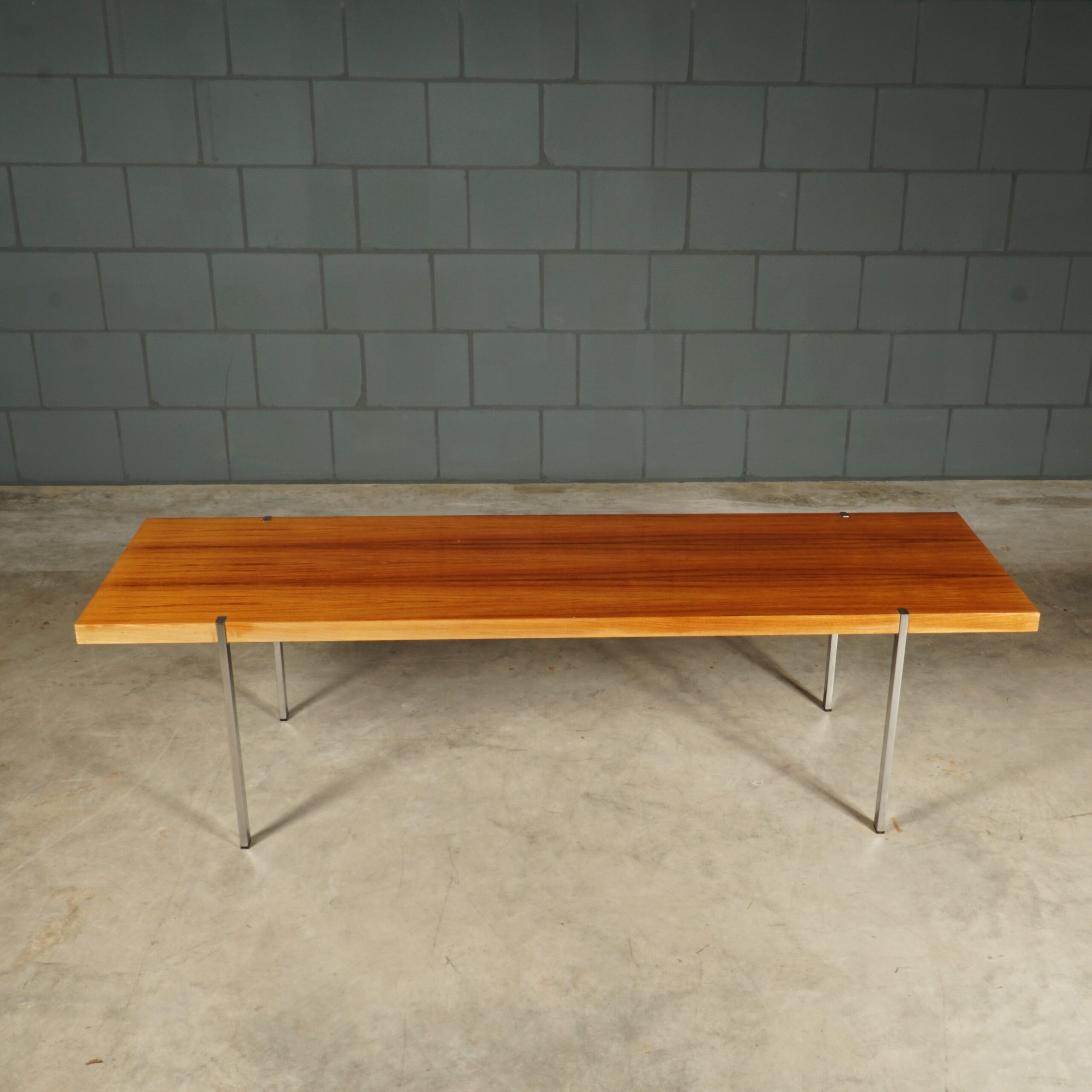 Deze prachtige klassieke palissanderhouten salontafel dateert uit de jaren 1960 en is ontworpen door de Duitse ontwerper Wilhelm Renz voor Metallbau Veyhl (Branding onder het tafelblad). De grote salontafel is ingelegd met prachtig Rio palissander fineer en de rechthoekige chromen poten zijn mooi verzonken in het tafelblad gemonteerd. De tafel is in zeer mooie staat met slechts lichte gebruikssporen. Een absoluut vintage juweeltje van kwaliteit waar je u tegen zegt!