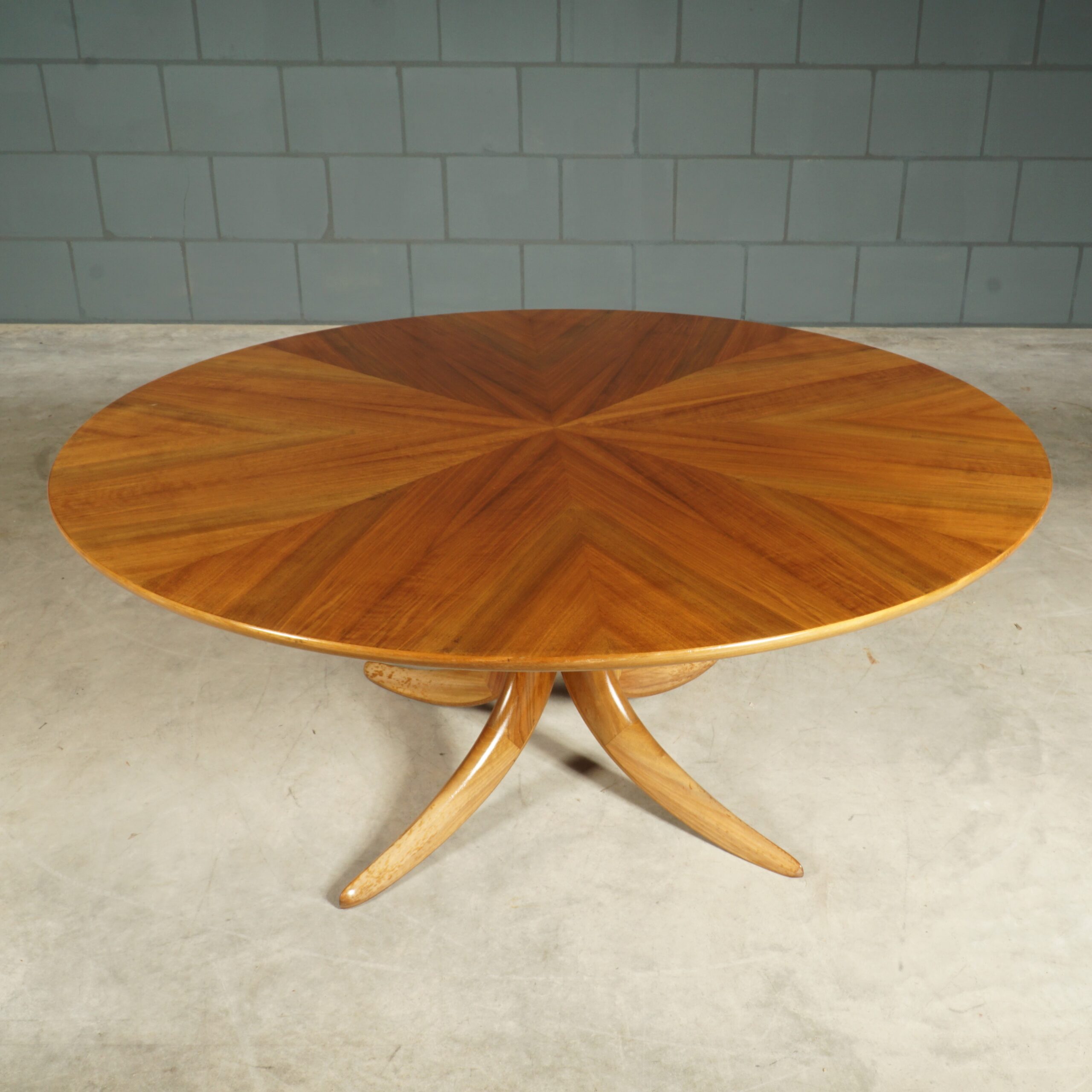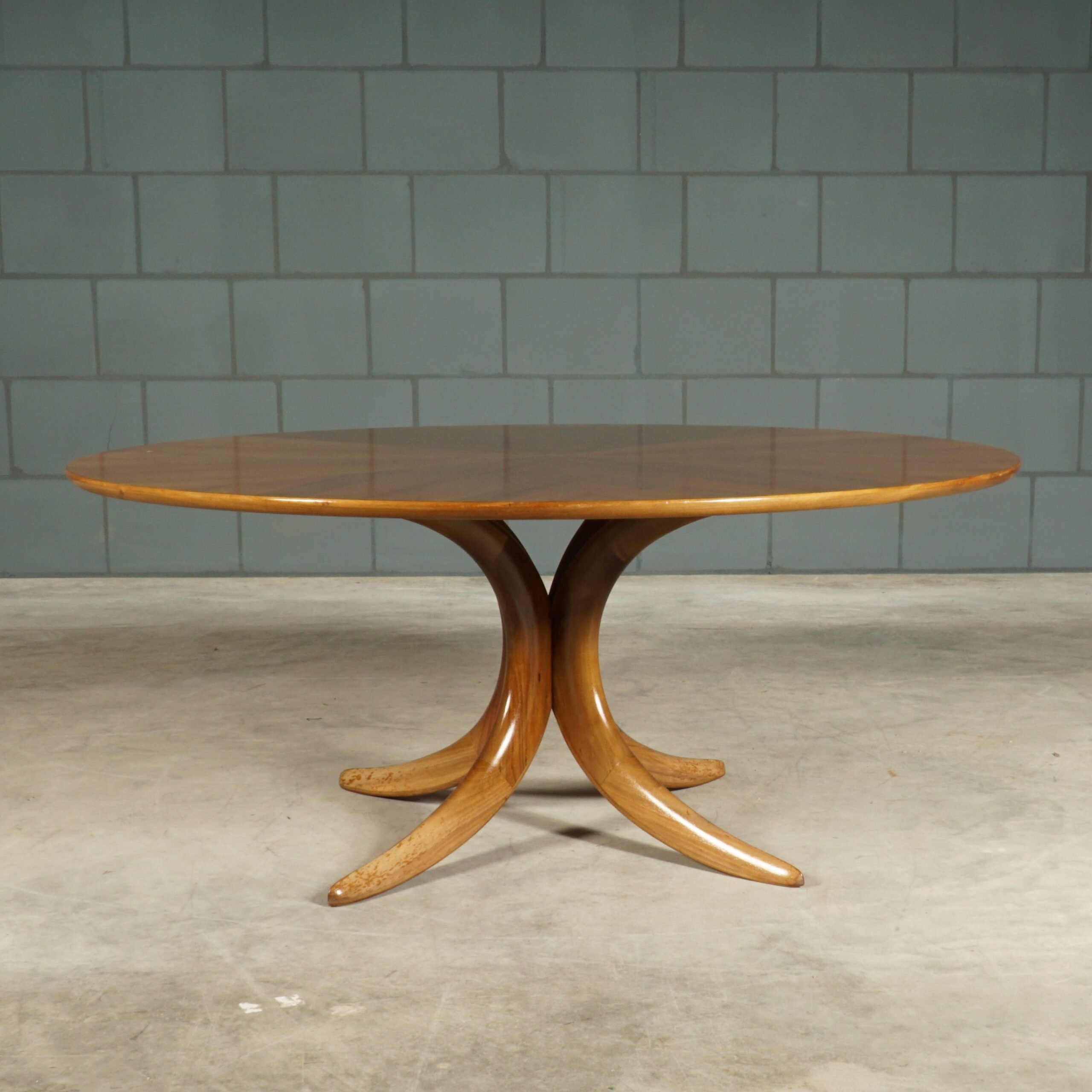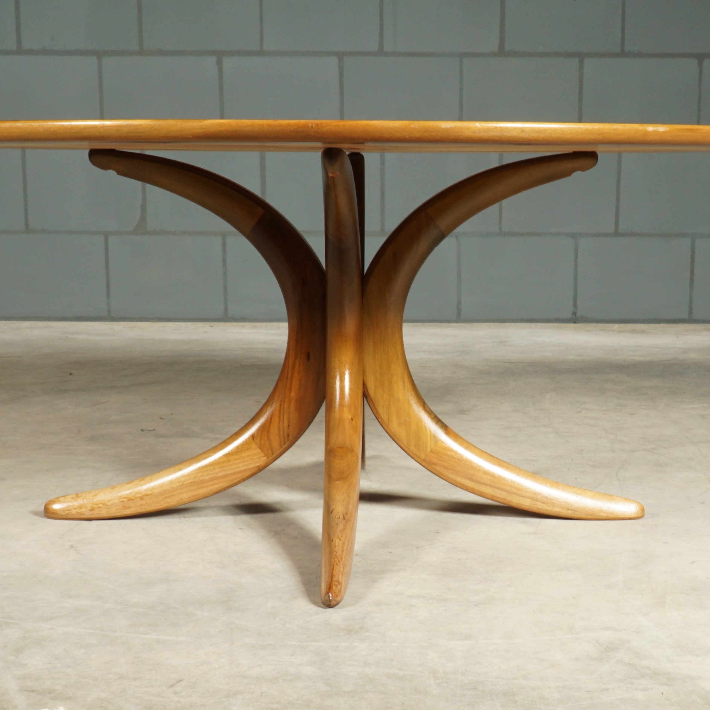 Deze prachtige ronde minimalistische salontafel dateert uit de jaren 70 en is gemaakt door de Duitse fabrikant Alma Möbel (tafel is gemerkt). De tafel bestaat uit een notenhouten blad met prachtig houtmotief met daaronder sabelpoten in massief notenhout. Deze tafel is door het unieke blad en bijzondere vormgeving een waar kunstwerk voor in je woonkamer! De tafel is in uitmuntende staat met zeer geringe gebruikssporen.