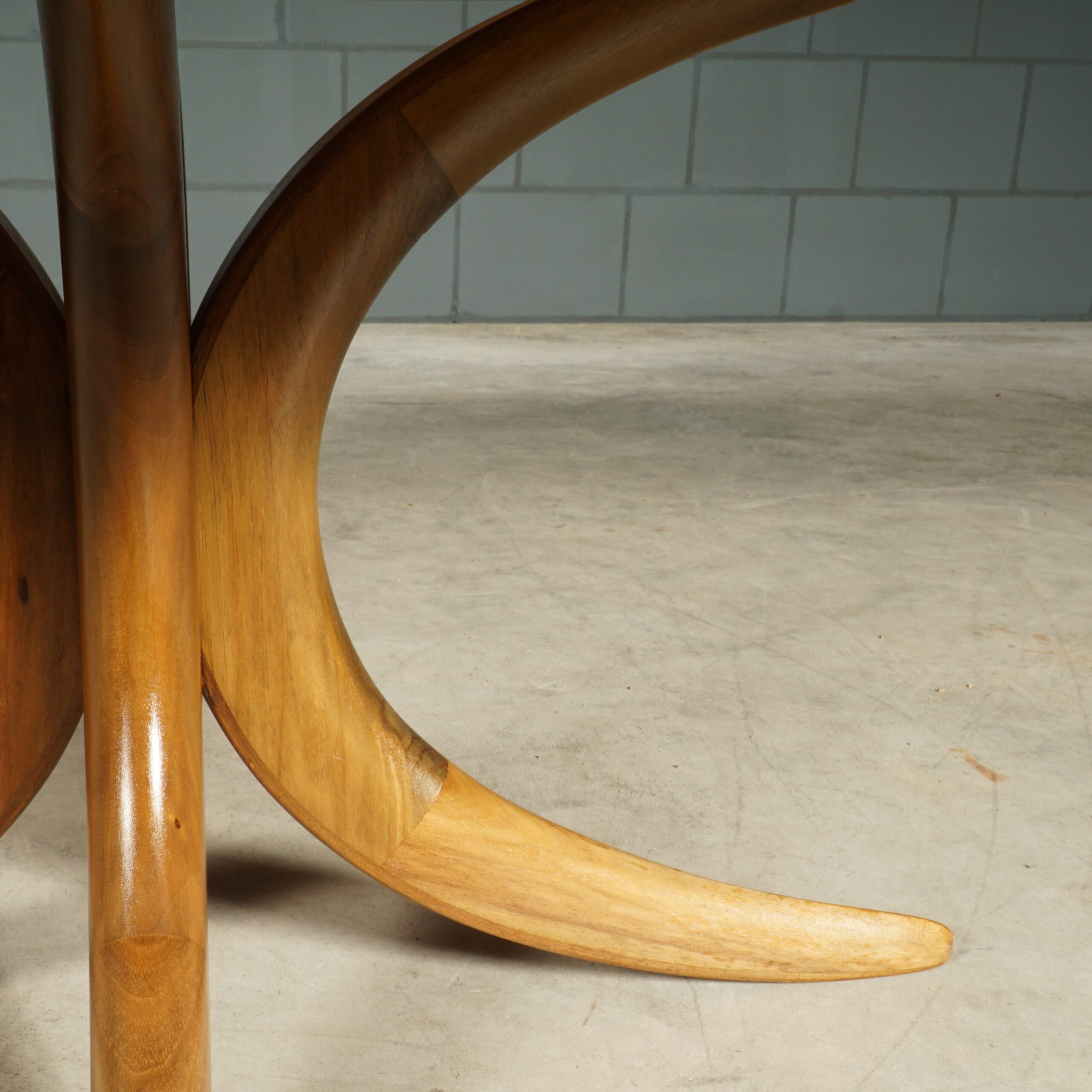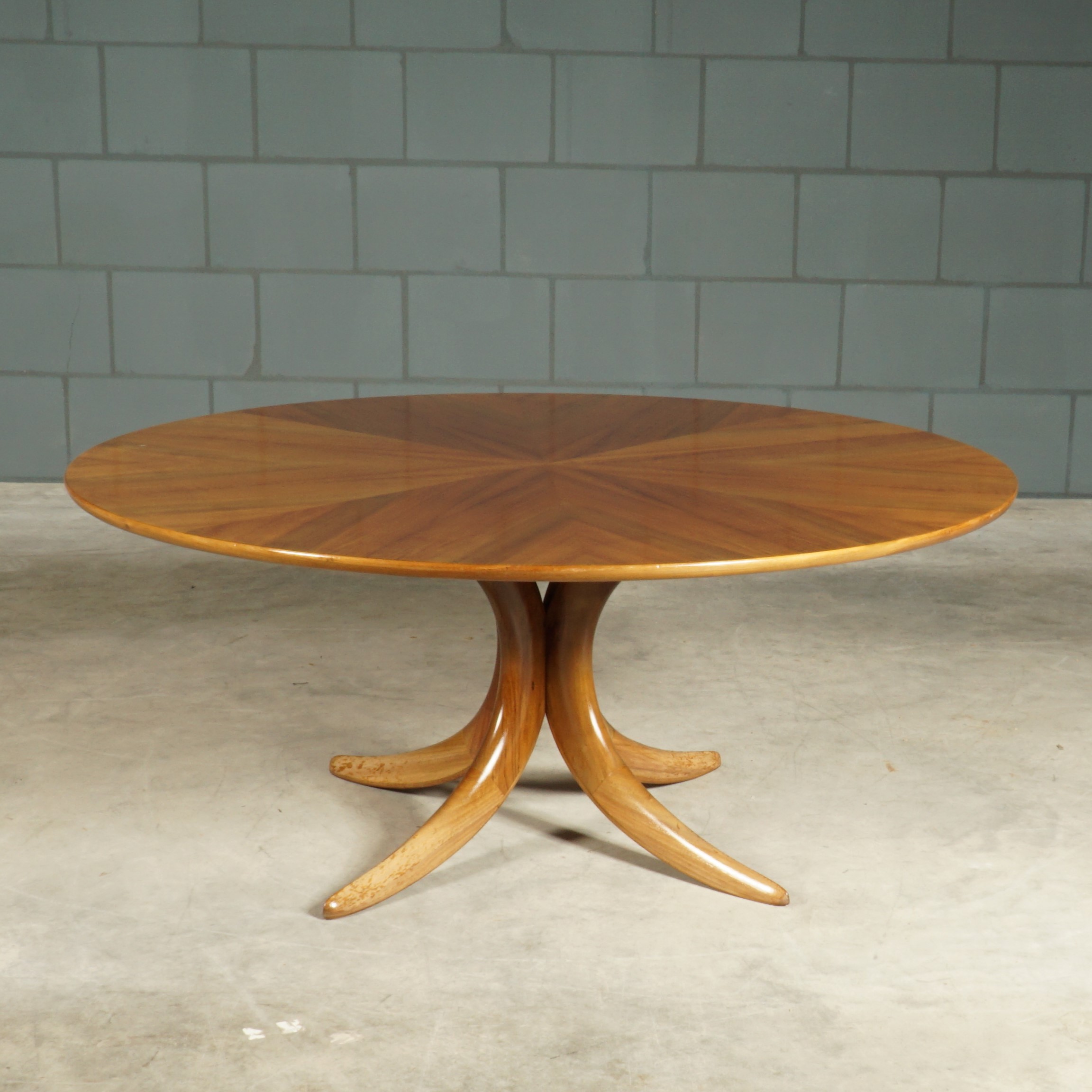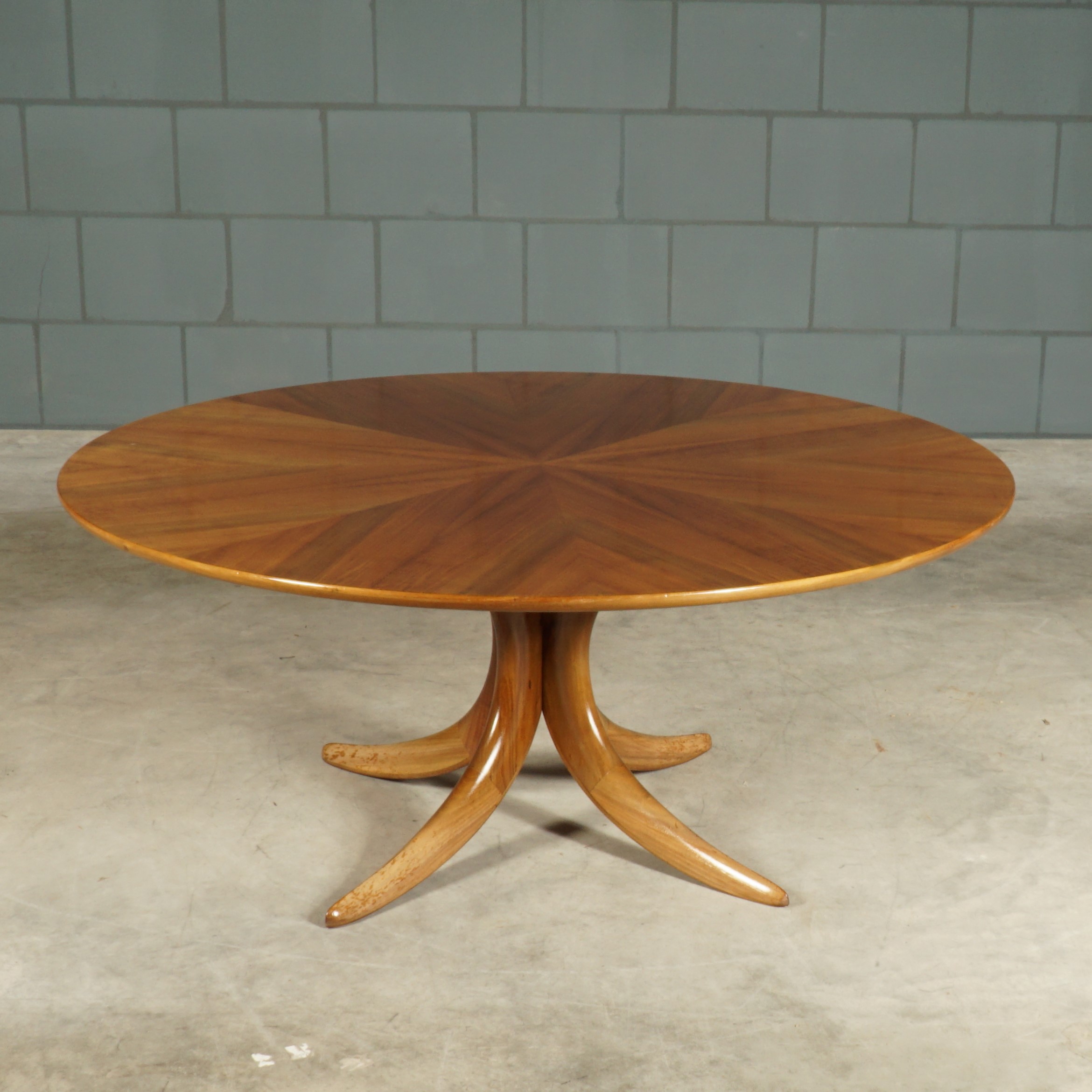 Deze prachtige ronde minimalistische salontafel dateert uit de jaren 70 en is gemaakt door de Duitse fabrikant Alma Möbel (tafel is gemerkt). De tafel bestaat uit een notenhouten blad met prachtig houtmotief met daaronder sabelpoten in massief notenhout. Deze tafel is door het unieke blad en bijzondere vormgeving een waar kunstwerk voor in je woonkamer! De tafel is in uitmuntende staat met zeer geringe gebruikssporen.