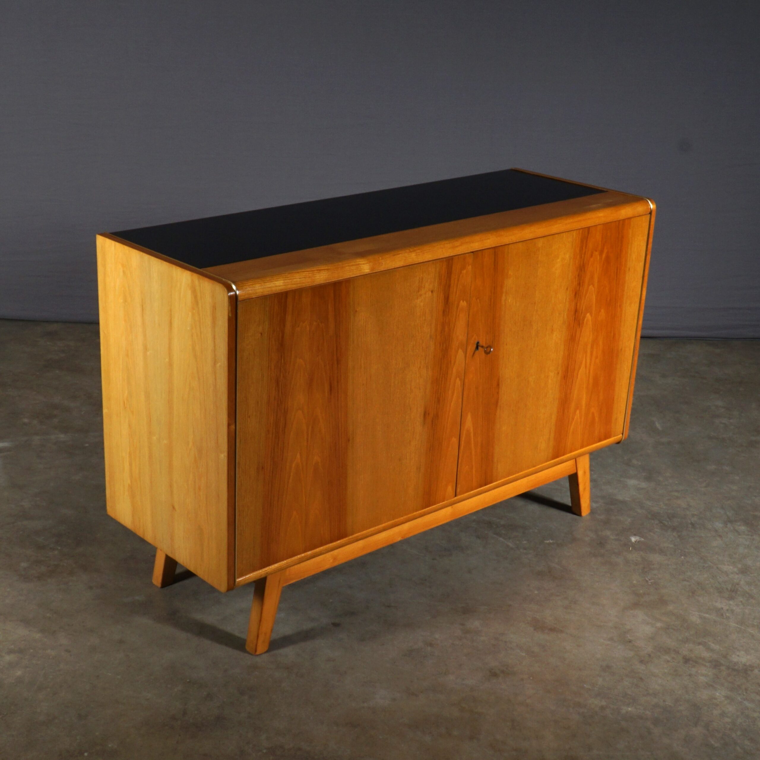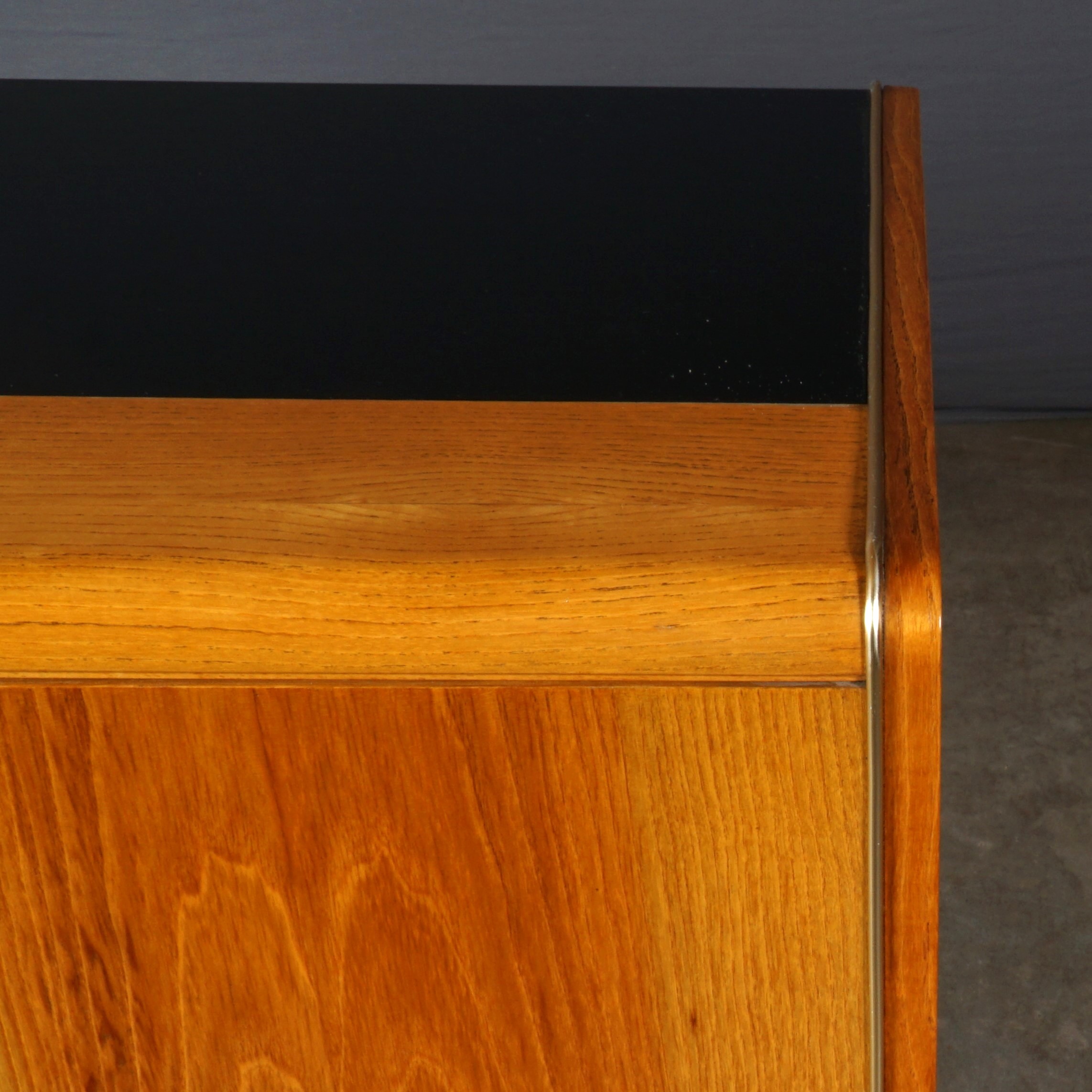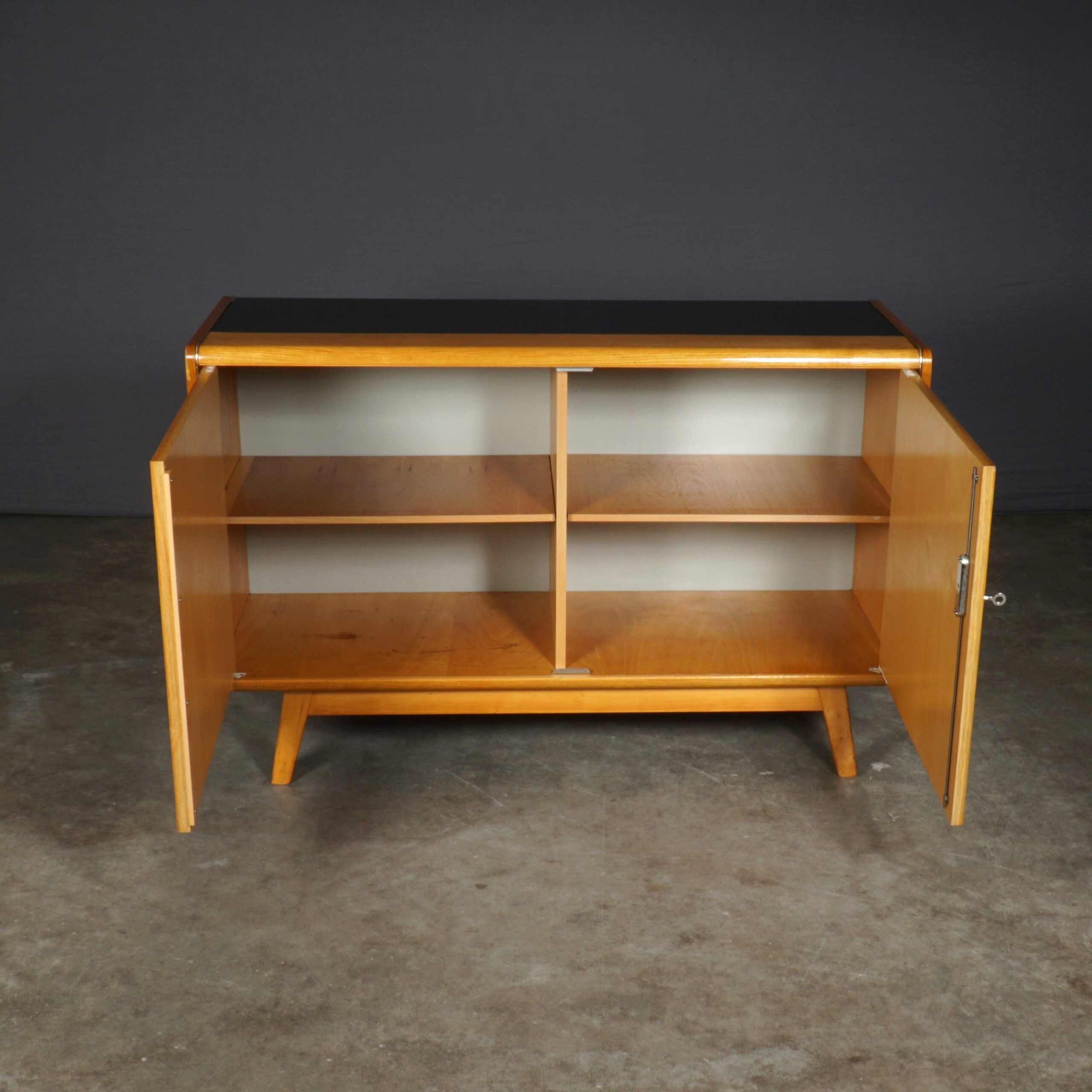 Vintage Czech design sideboard/dressoir ontworpen door Bohumil Landsman voor Jitona. Geproduceerd in de jaren 60 in het voormalige Tsjechoslowakije. De kast is afgewerkt met een prachtige eikenfineer en heeft een zwart glazen plaat en schuine poten. Het dressoir heeft twee openslaande deuren met slot (sleutel aanwezig) en binnenin twee uitneembare planken. Bovenop het blad ligt een zwart glazen plaat, wat een mooi contrast geeft met het blanke hout. De kast is in originele vintage staat met slechts hele lichte gebruikerssporen zoals passend bij de leeftijd.