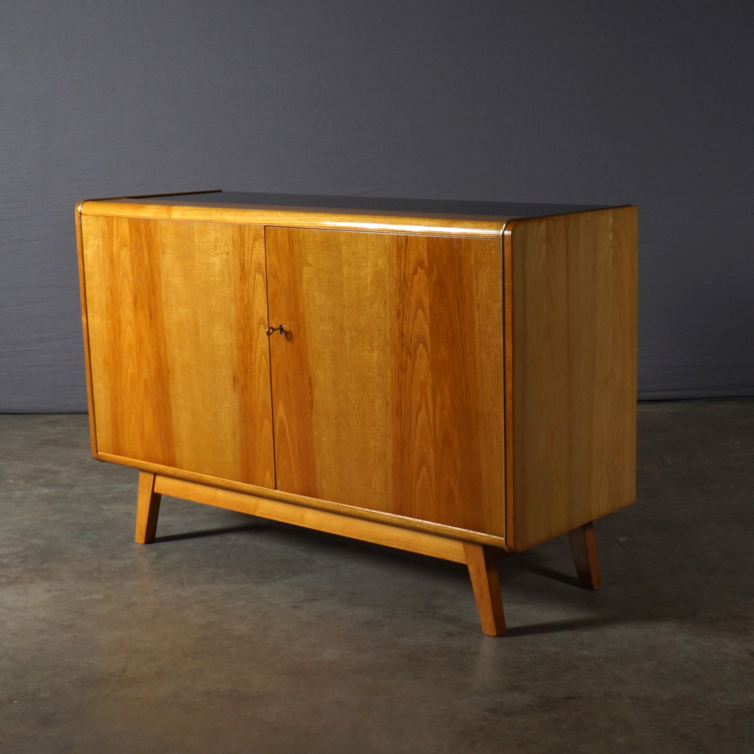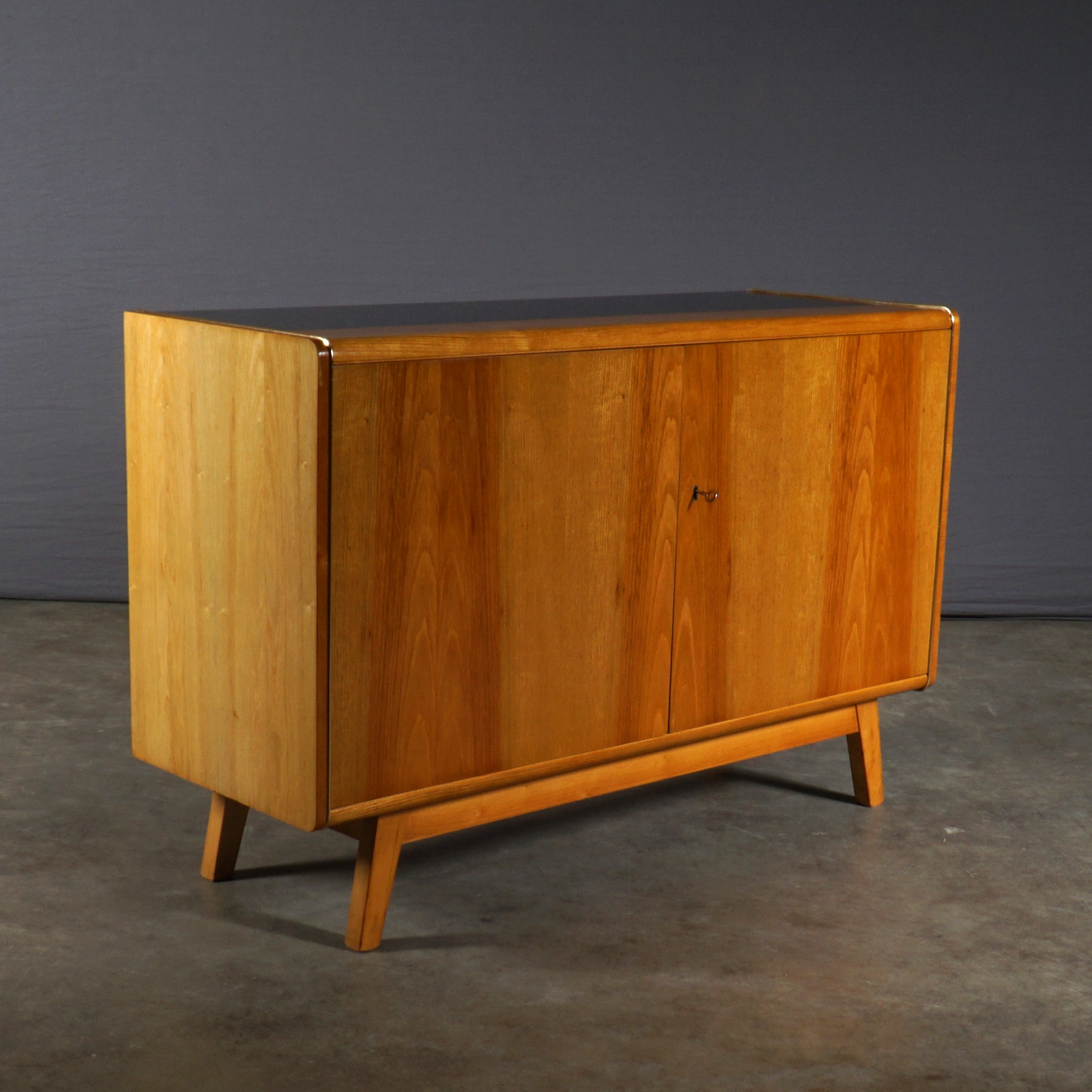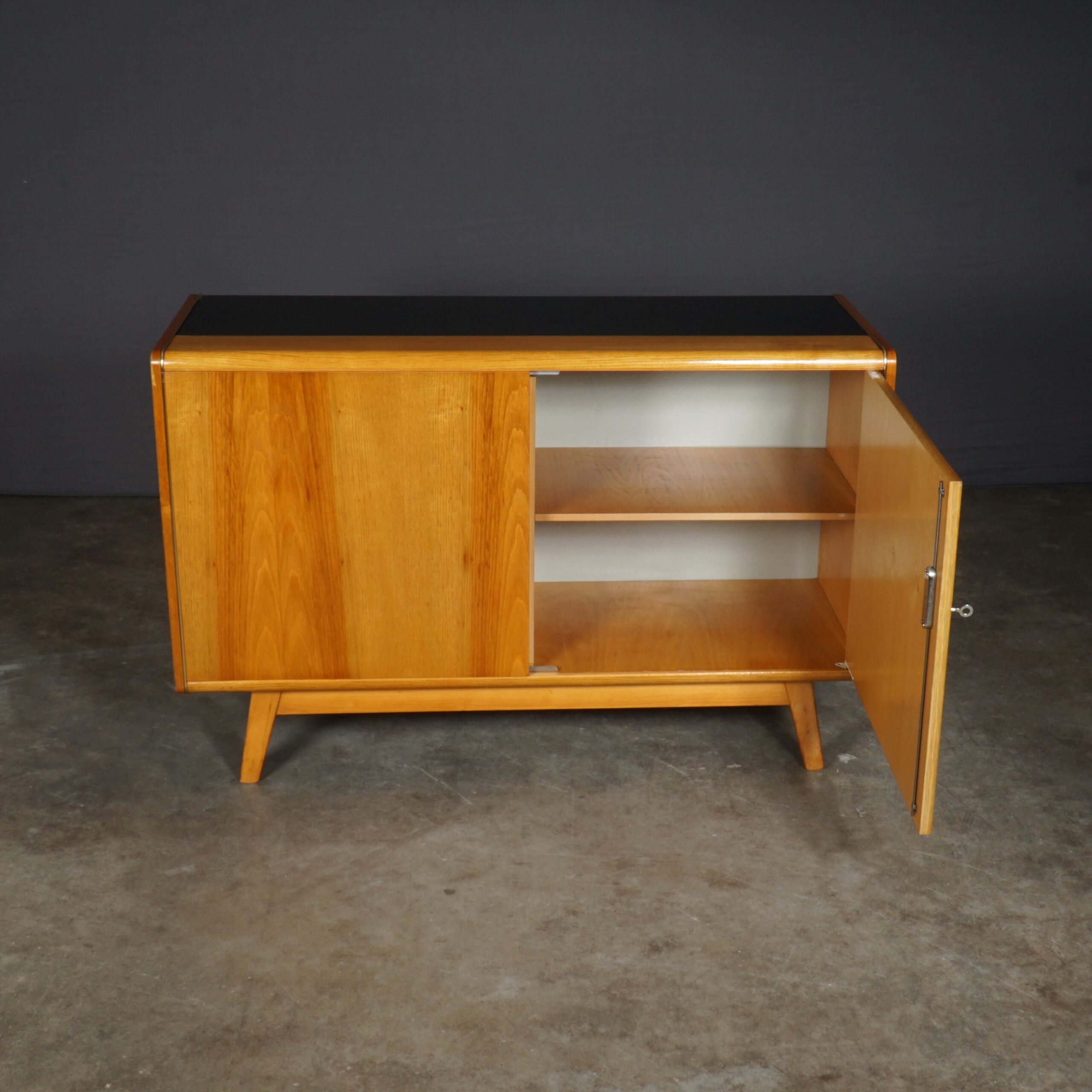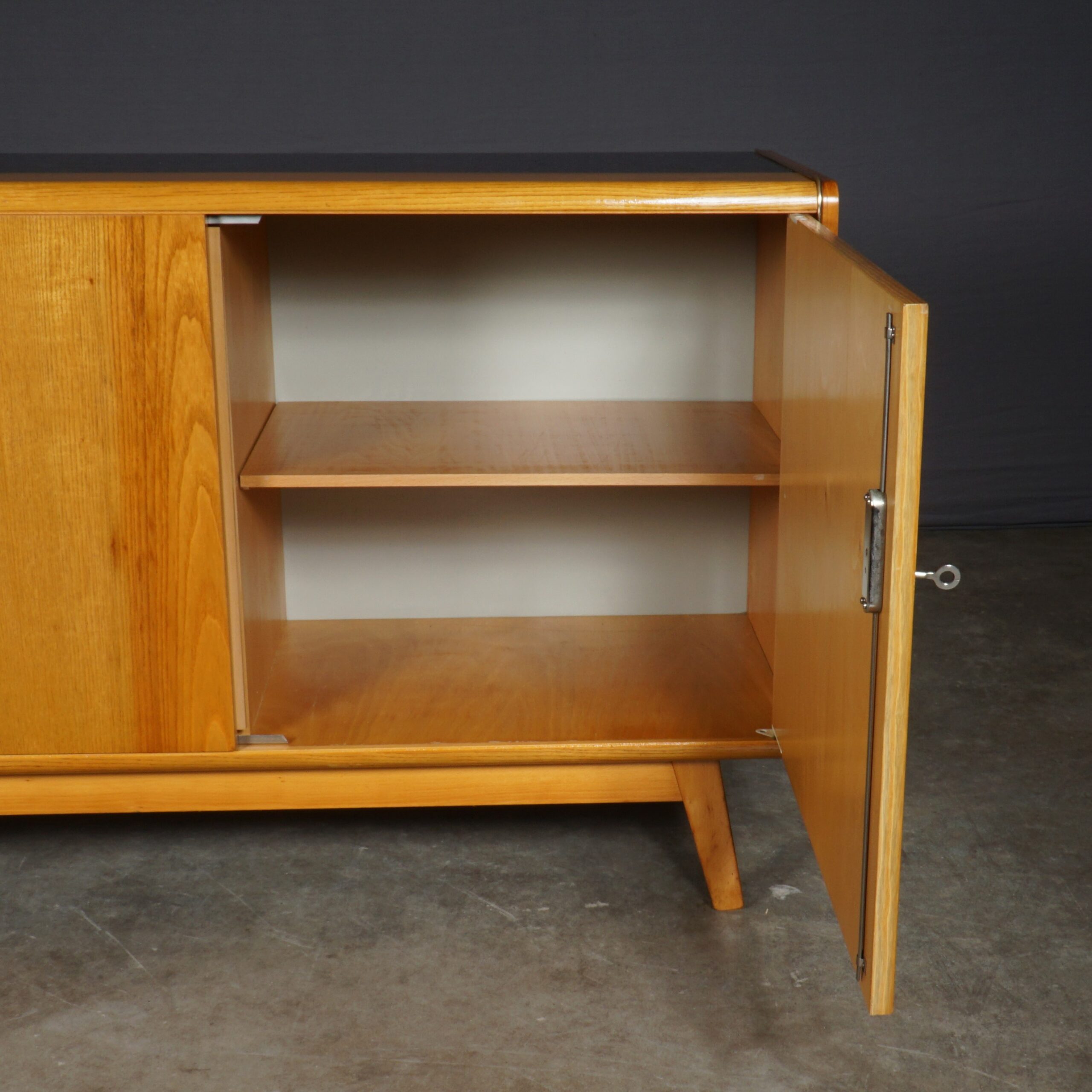 Vintage Czech design sideboard/dressoir ontworpen door Bohumil Landsman voor Jitona. Geproduceerd in de jaren 60 in het voormalige Tsjechoslowakije. De kast is afgewerkt met een prachtige eikenfineer en heeft een zwart glazen plaat en schuine poten. Het dressoir heeft twee openslaande deuren met slot (sleutel aanwezig) en binnenin twee uitneembare planken. Bovenop het blad ligt een zwart glazen plaat, wat een mooi contrast geeft met het blanke hout. De kast is in originele vintage staat met slechts hele lichte gebruikerssporen zoals passend bij de leeftijd.
