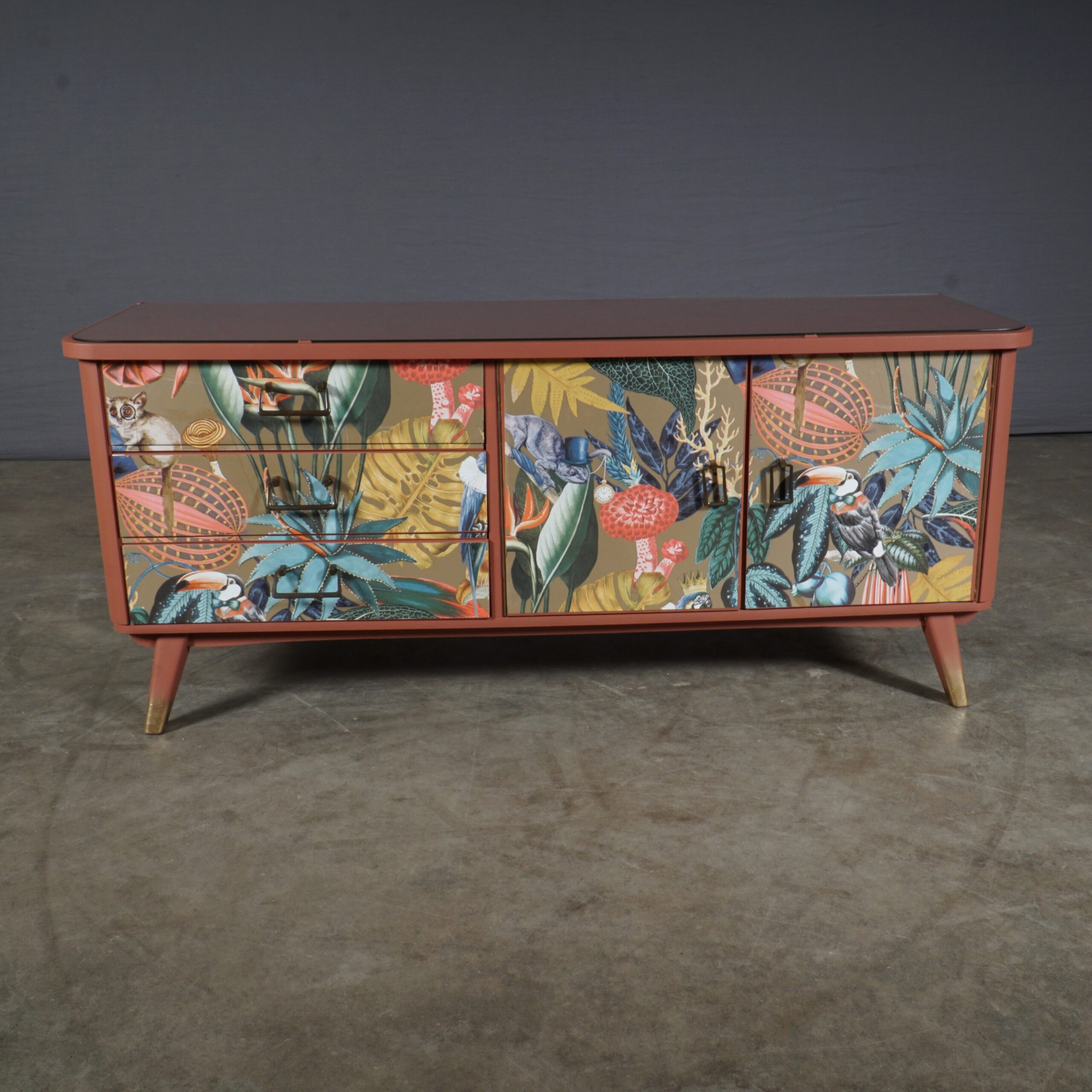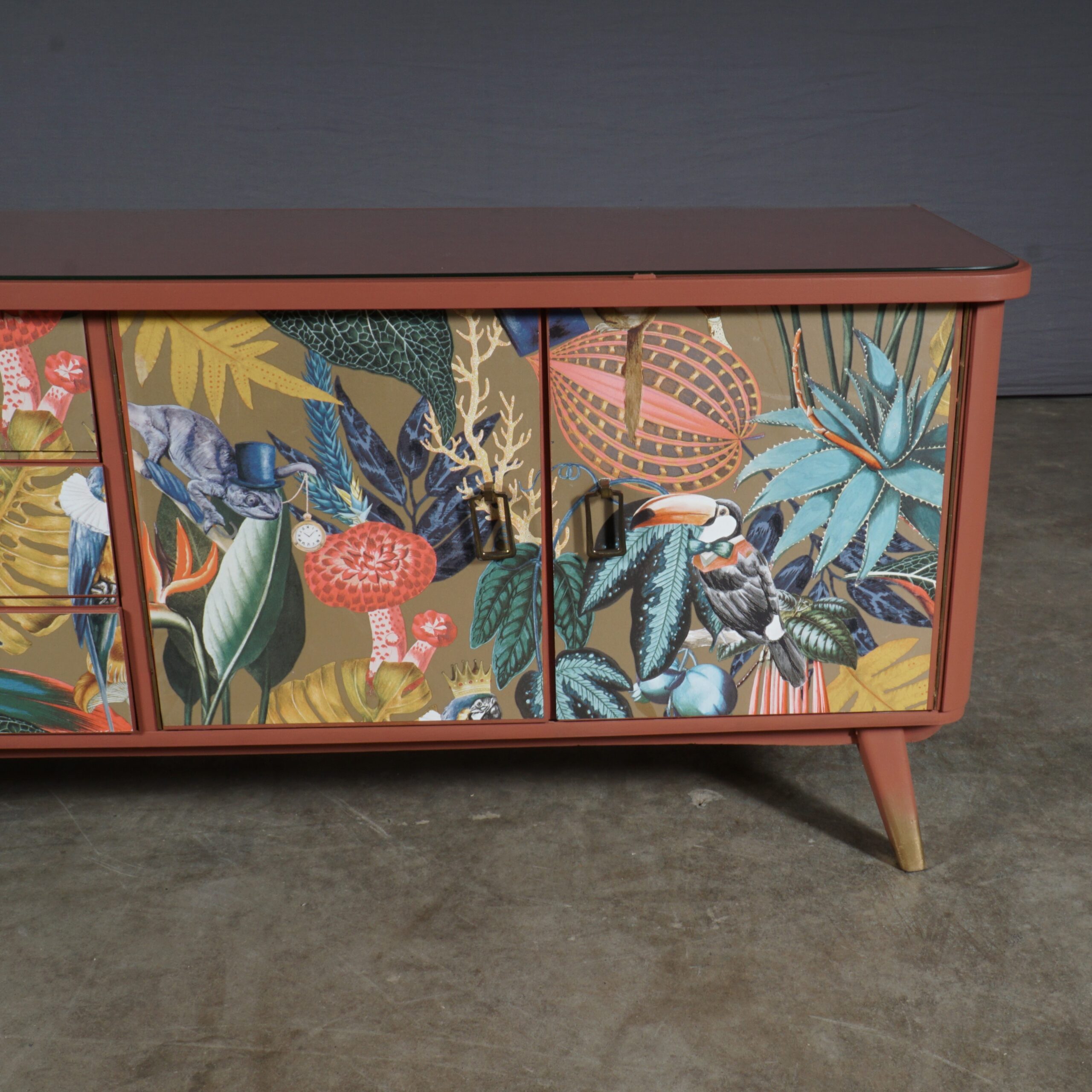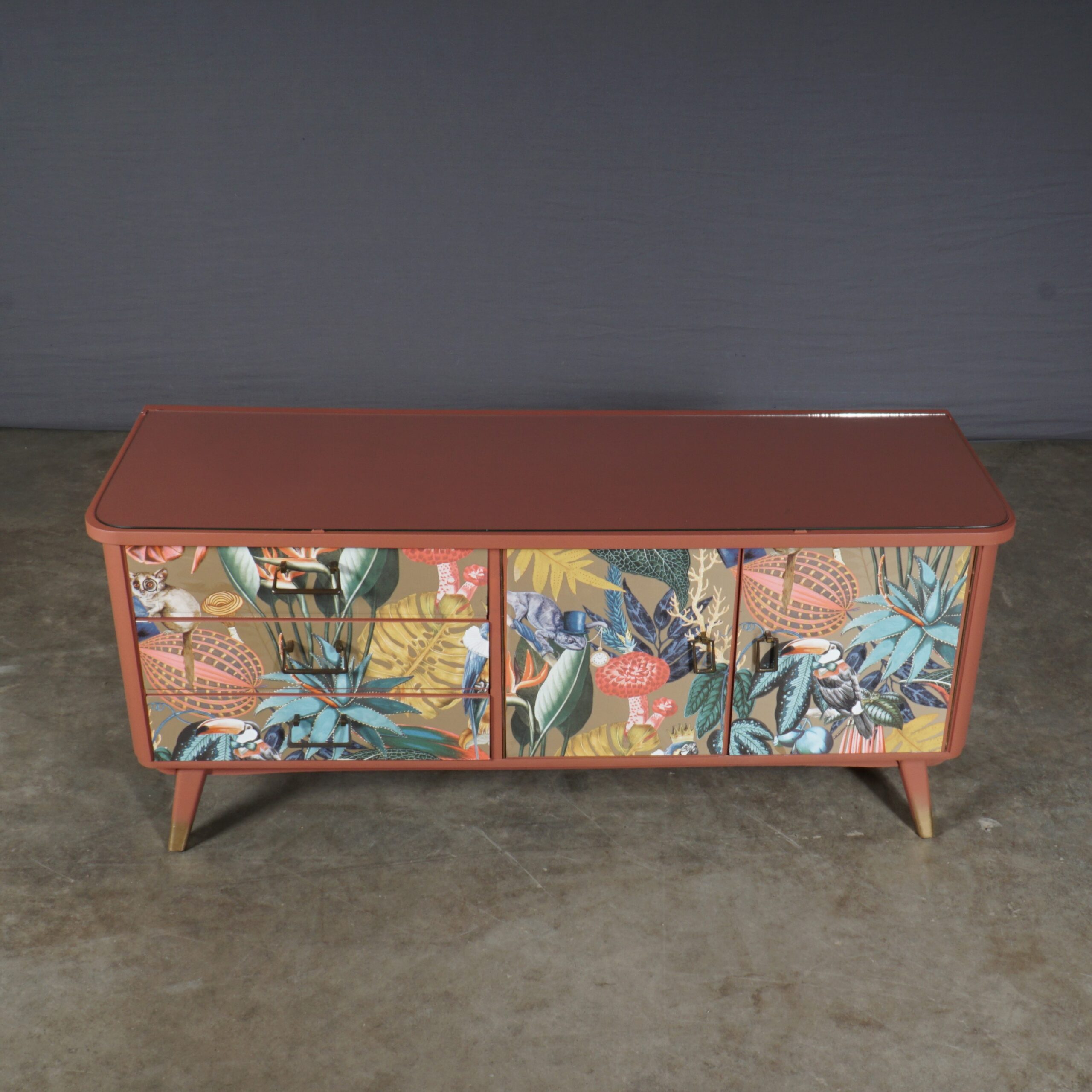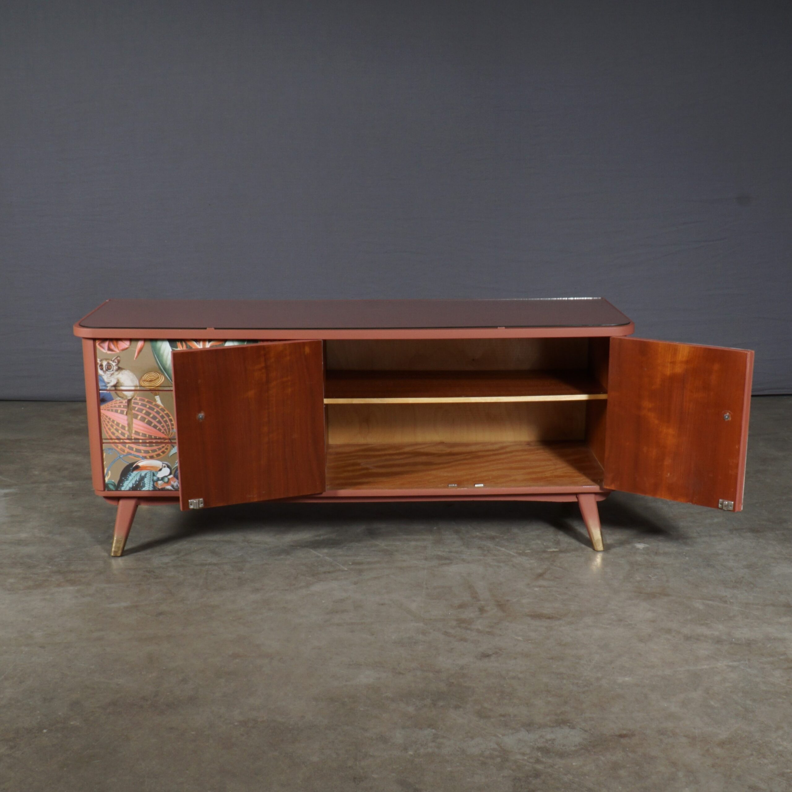 Dit kleurrijke sideboard is een unieke eye-catcher en absoluut one-of-a-kind! Het houten kastje dateert uit de jaren 60 en is in een warm oudroze kleur geschilderd en gelamineerd met een prachtig bloemenpatroon. De kast is afgewerkt met zwart metalen handgrepen en een glasplaat aan de bovenzijde. Het kastje heeft drie lades en twee deurtjes waarachter zich een legplank bevindt. Een opvallende en vrolijke verschijning waar elk interieur helemaal happy van gaat worden!