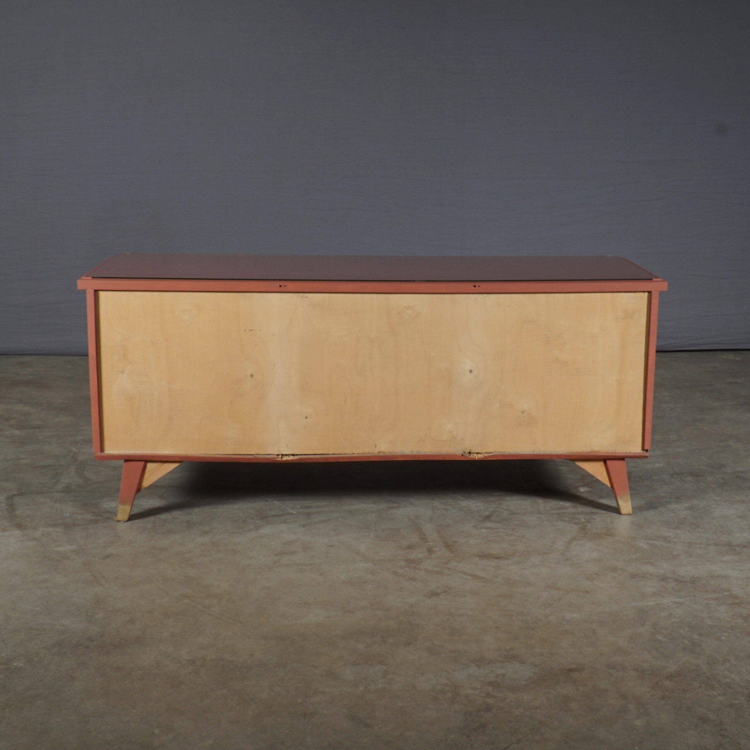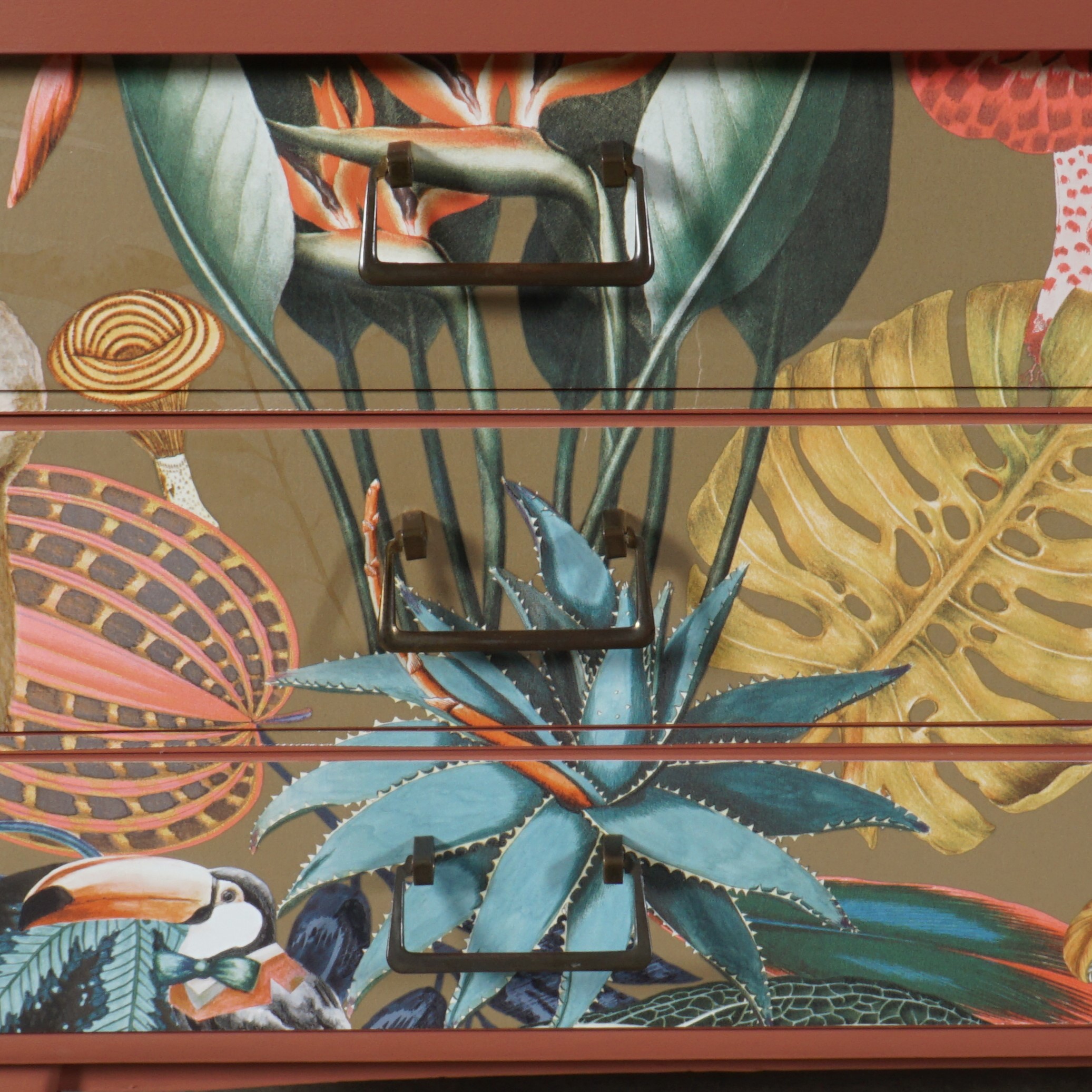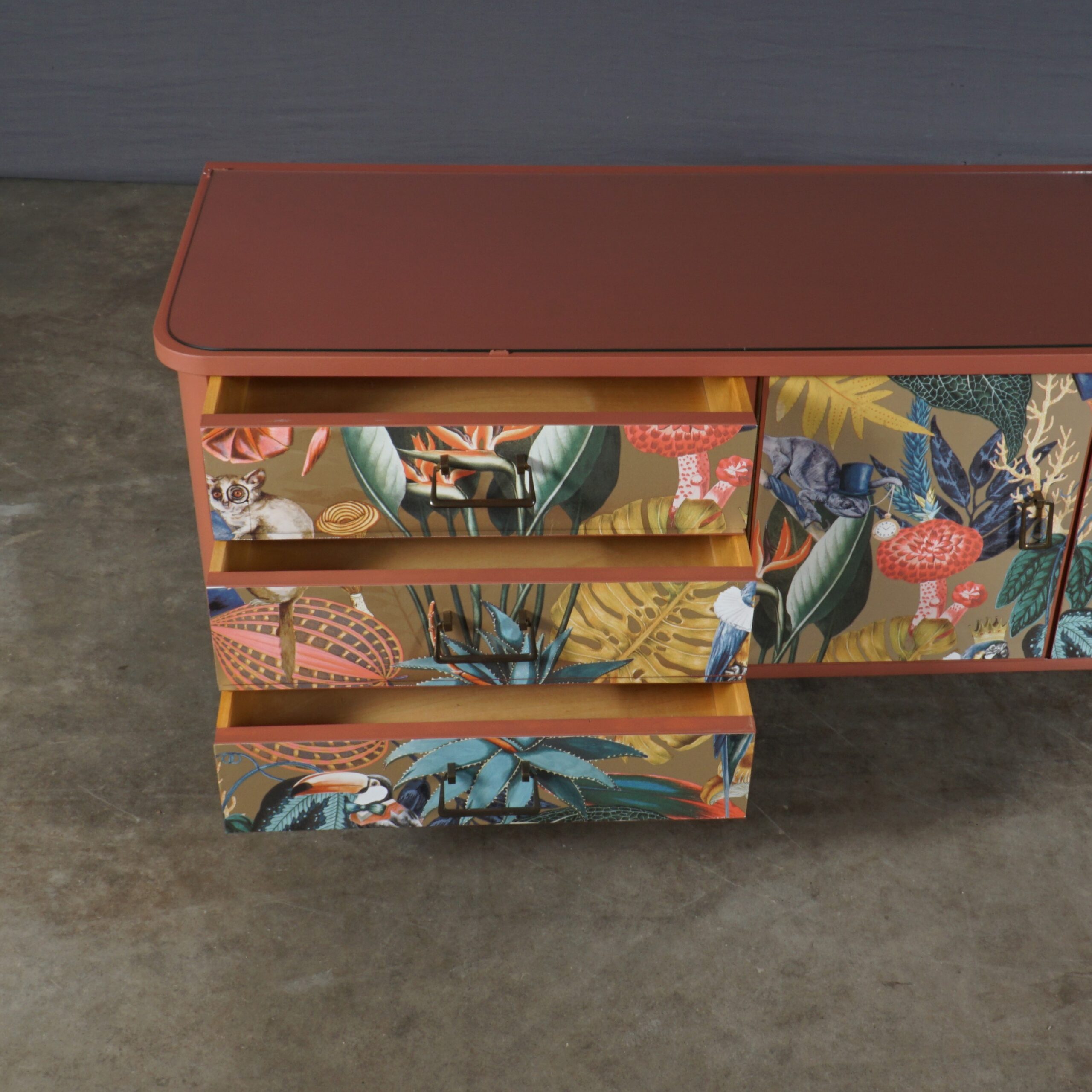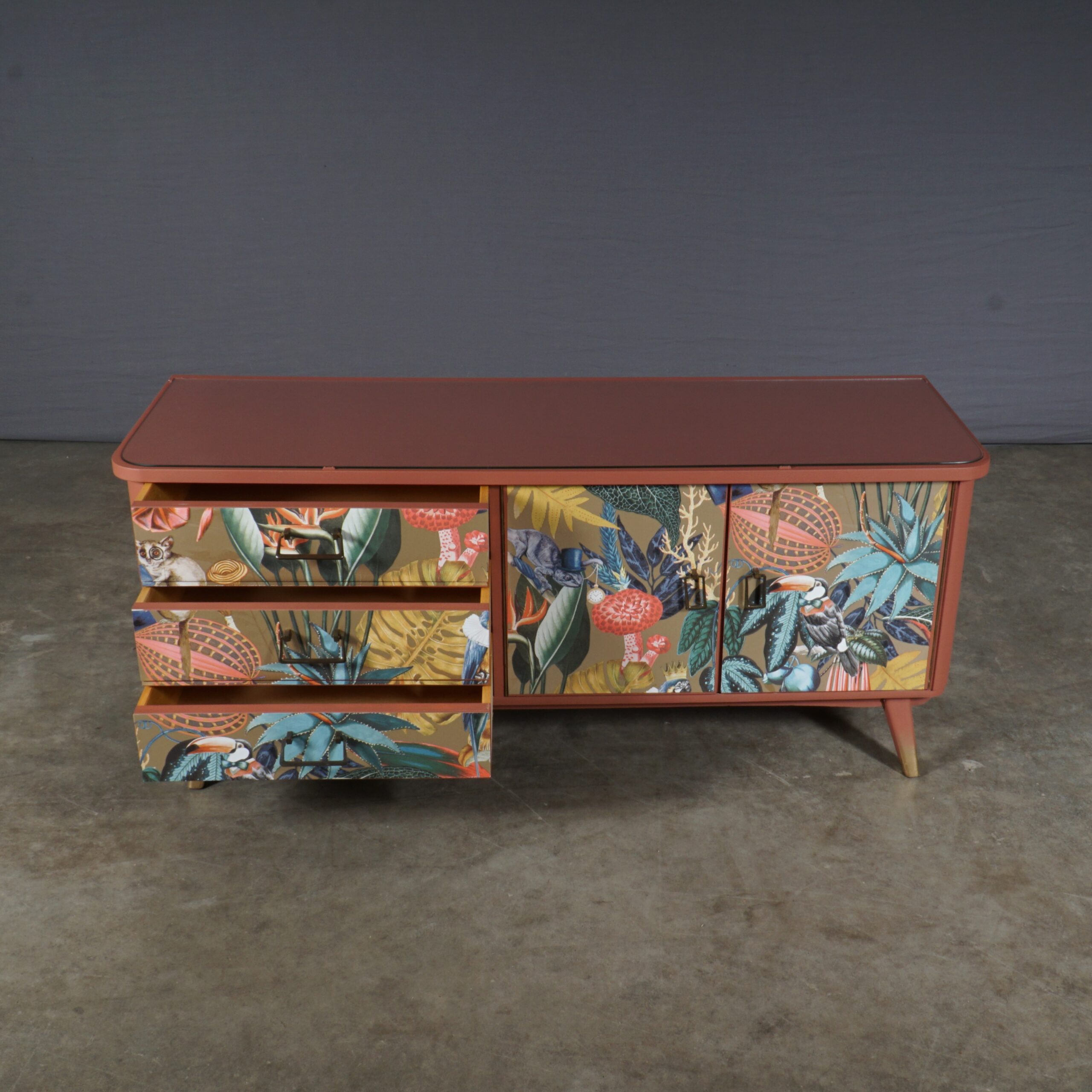Dit kleurrijke sideboard is een unieke eye-catcher en absoluut one-of-a-kind! Het houten kastje dateert uit de jaren 60 en is in een warm oudroze kleur geschilderd en gelamineerd met een prachtig bloemenpatroon. De kast is afgewerkt met zwart metalen handgrepen en een glasplaat aan de bovenzijde. Het kastje heeft drie lades en twee deurtjes waarachter zich een legplank bevindt. Een opvallende en vrolijke verschijning waar elk interieur helemaal happy van gaat worden!