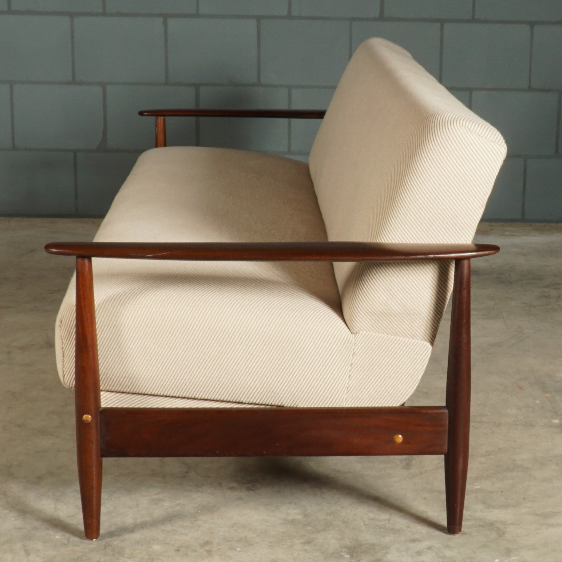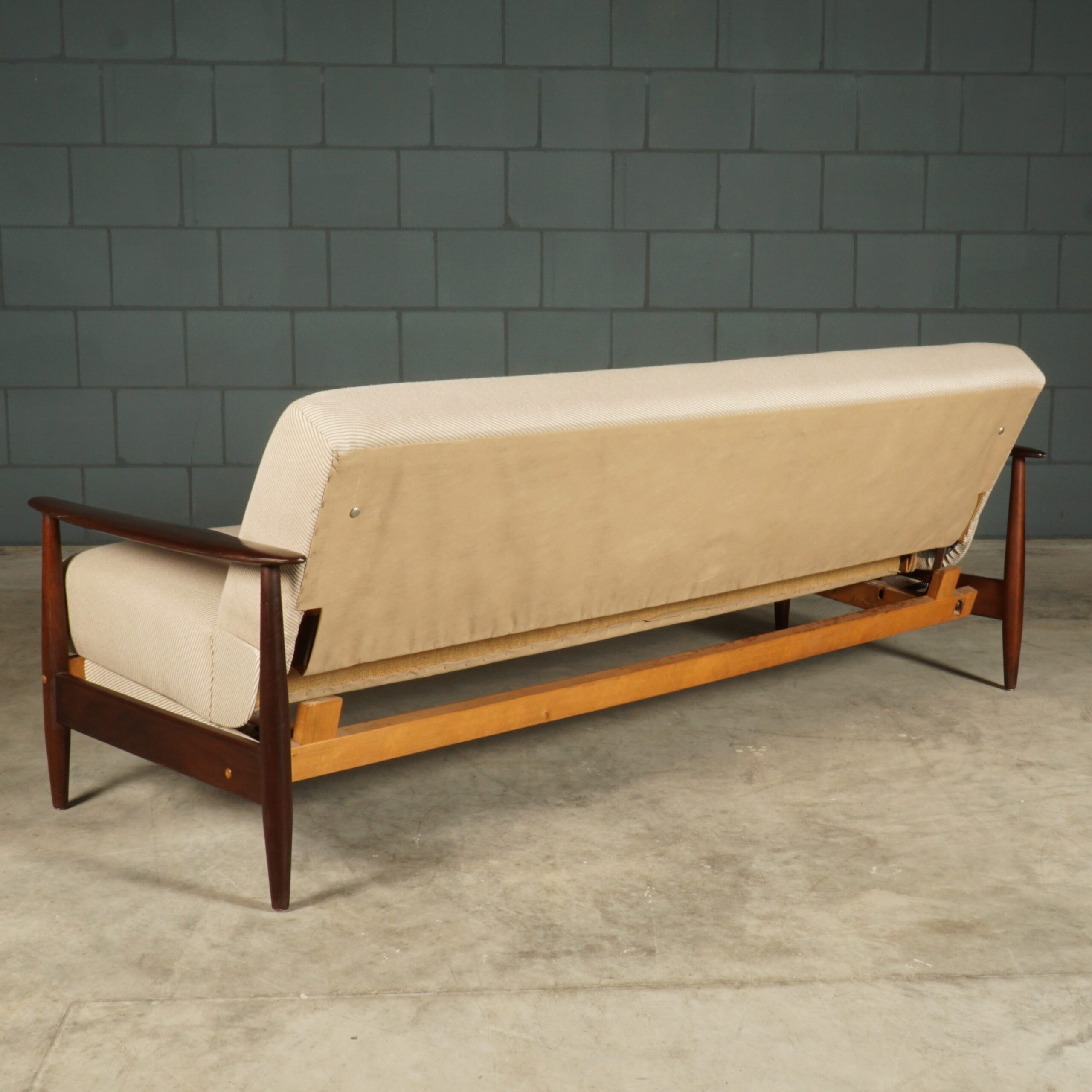 Deze prachtige vintage sofa/slaapbank komt uit Denemarken en dateert uit de jaren zestig. De bank heeft een natuurlijke Scandinavische uitstraling door het gebruik van een lichte beige stoffen bekleding en een strak vormgegeven donkerhouten frame. De bank biedt zitruimte voor 3 tot 4 personen en is in een simpele beweging uit te klappen tot een eenpersoons bed. Niet alleen een prachtig design voor zowel in een modern als in een vintage interieur, maar ook nog super praktisch door de geïntegreerde slaapfunctie. De bank is in uitmuntende staat met amper gebruikssporen.