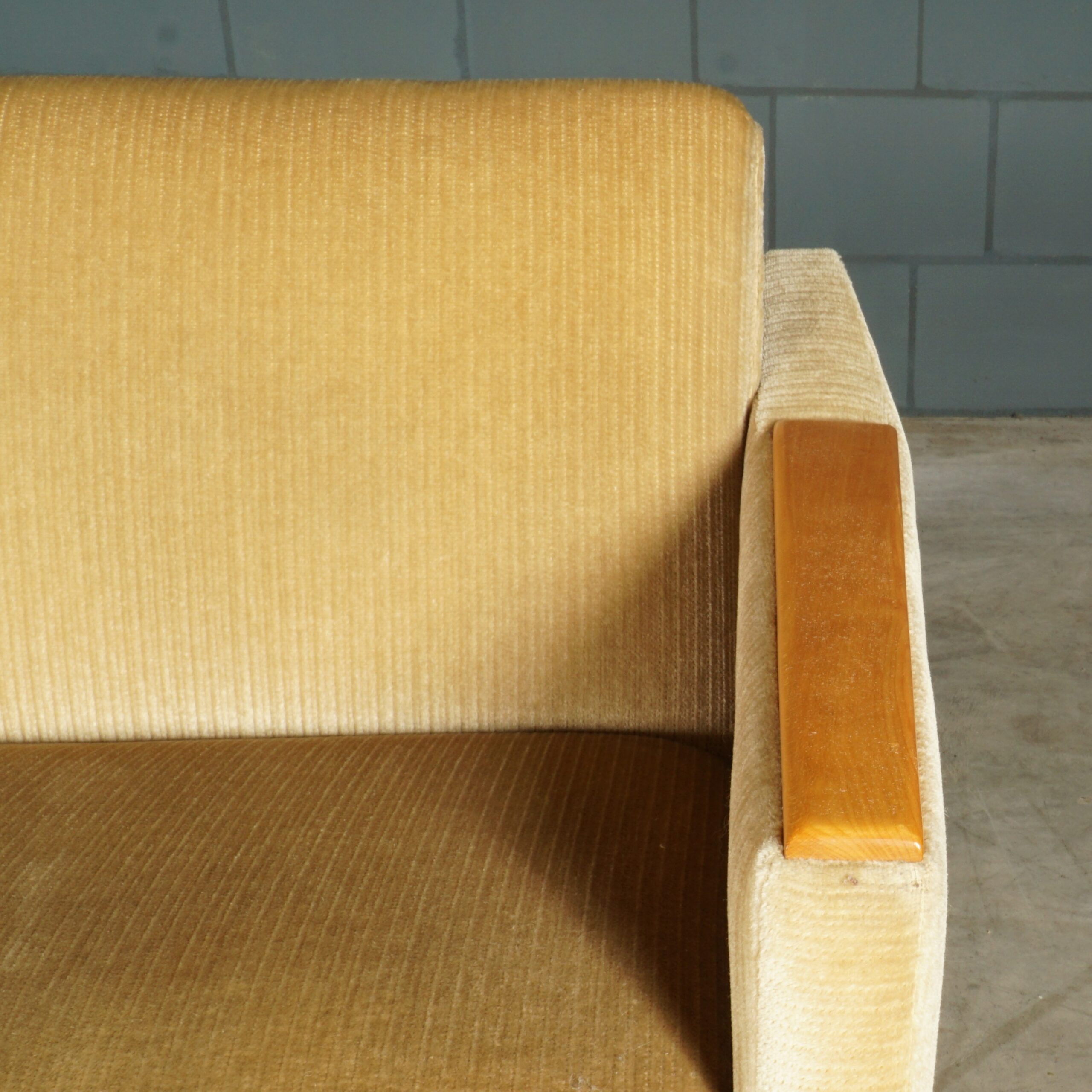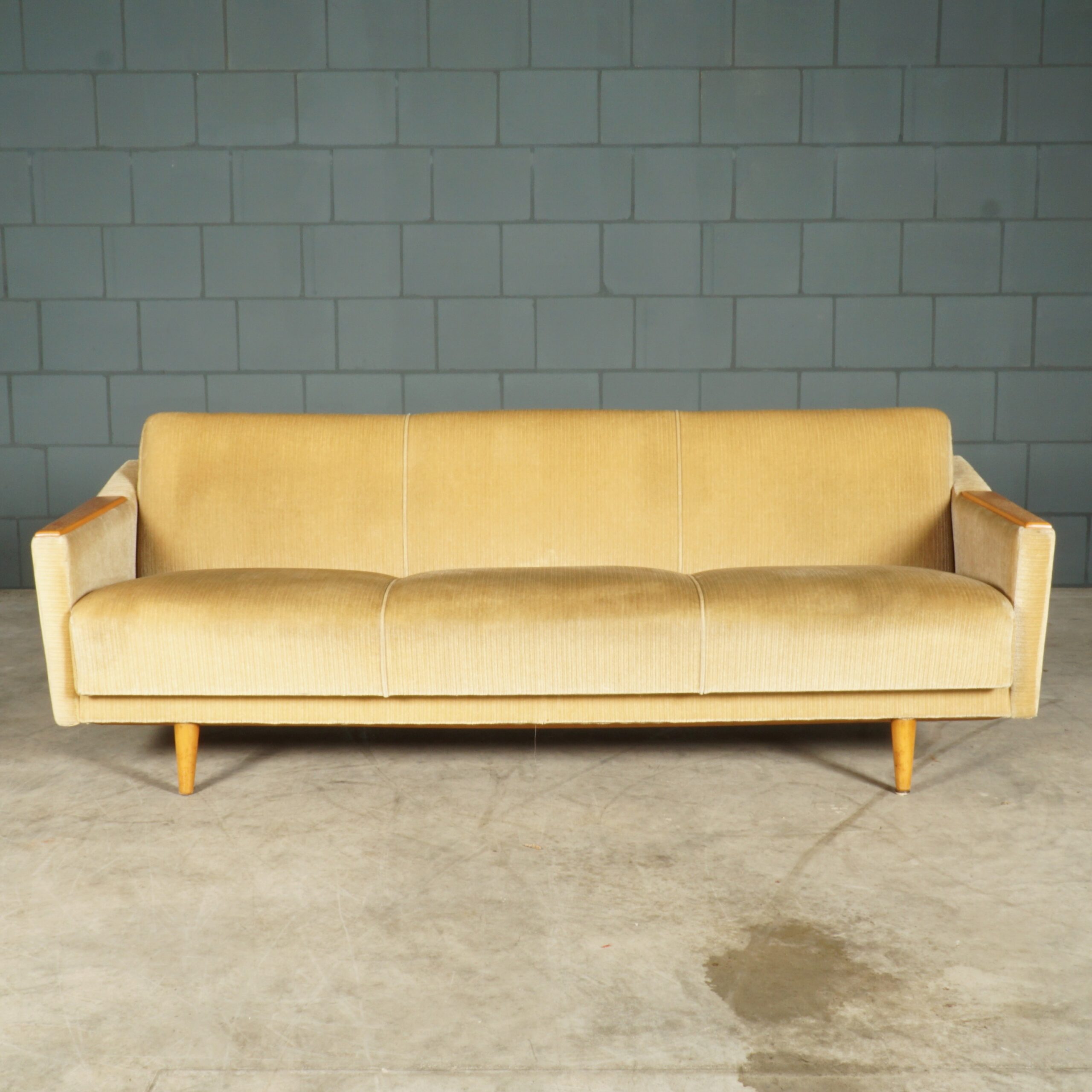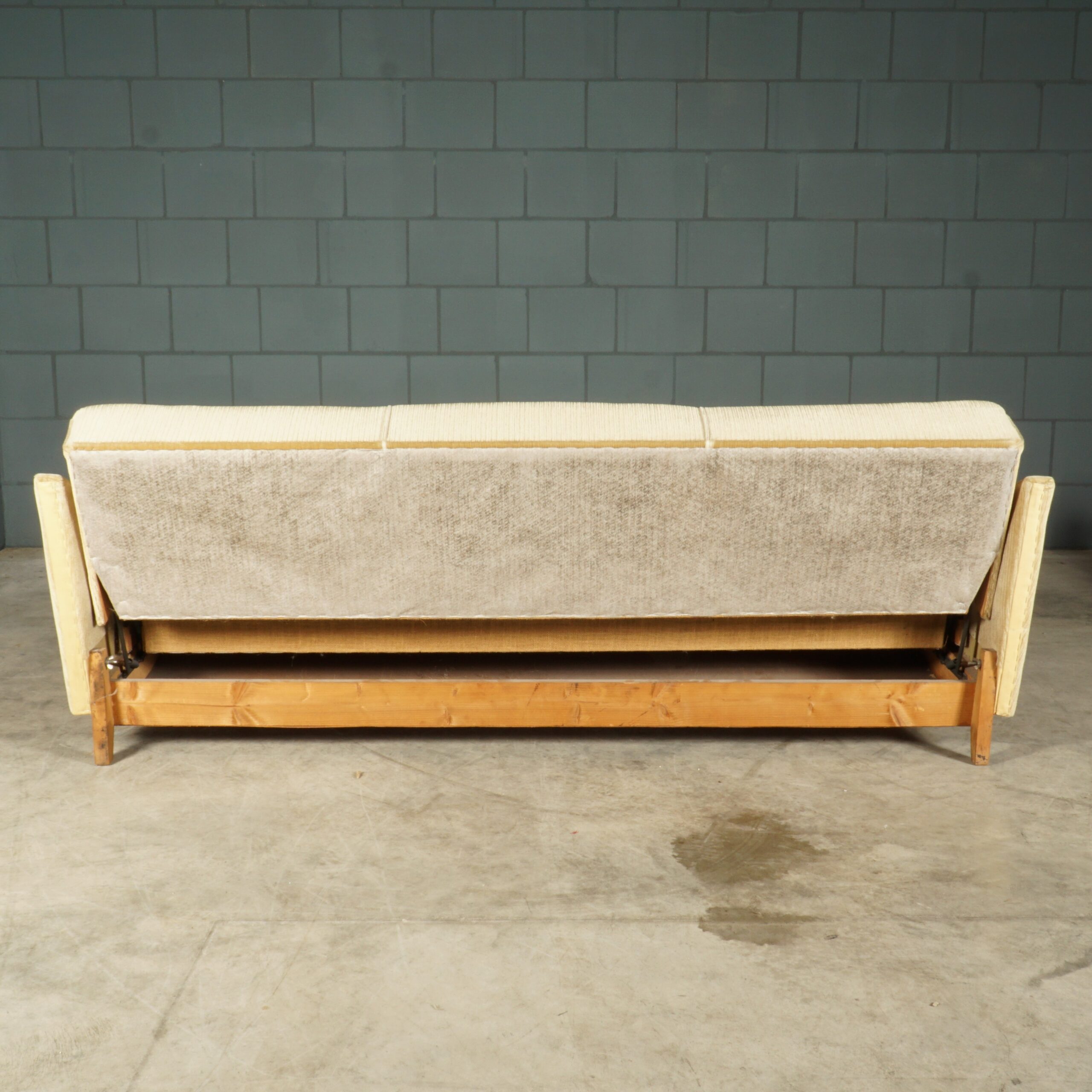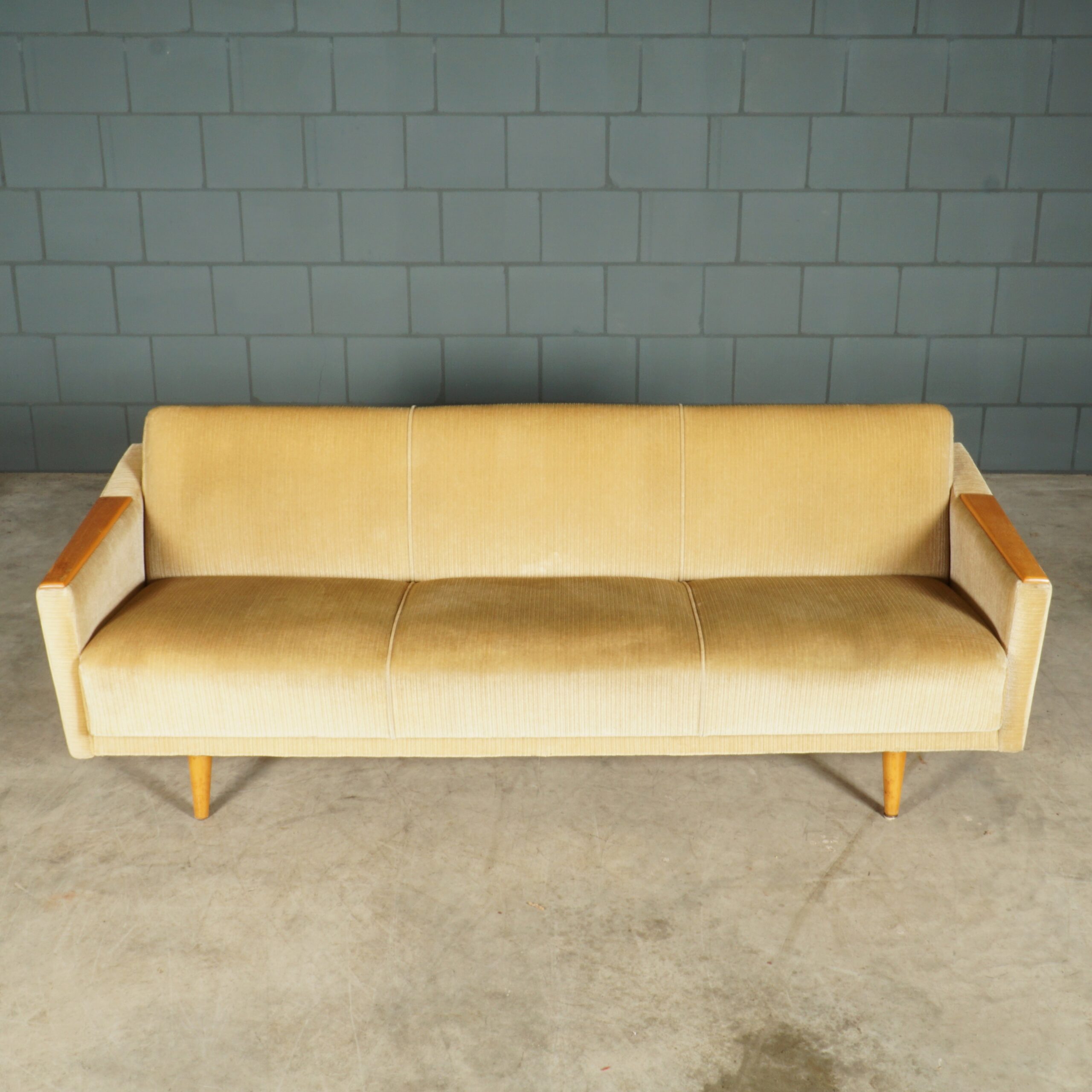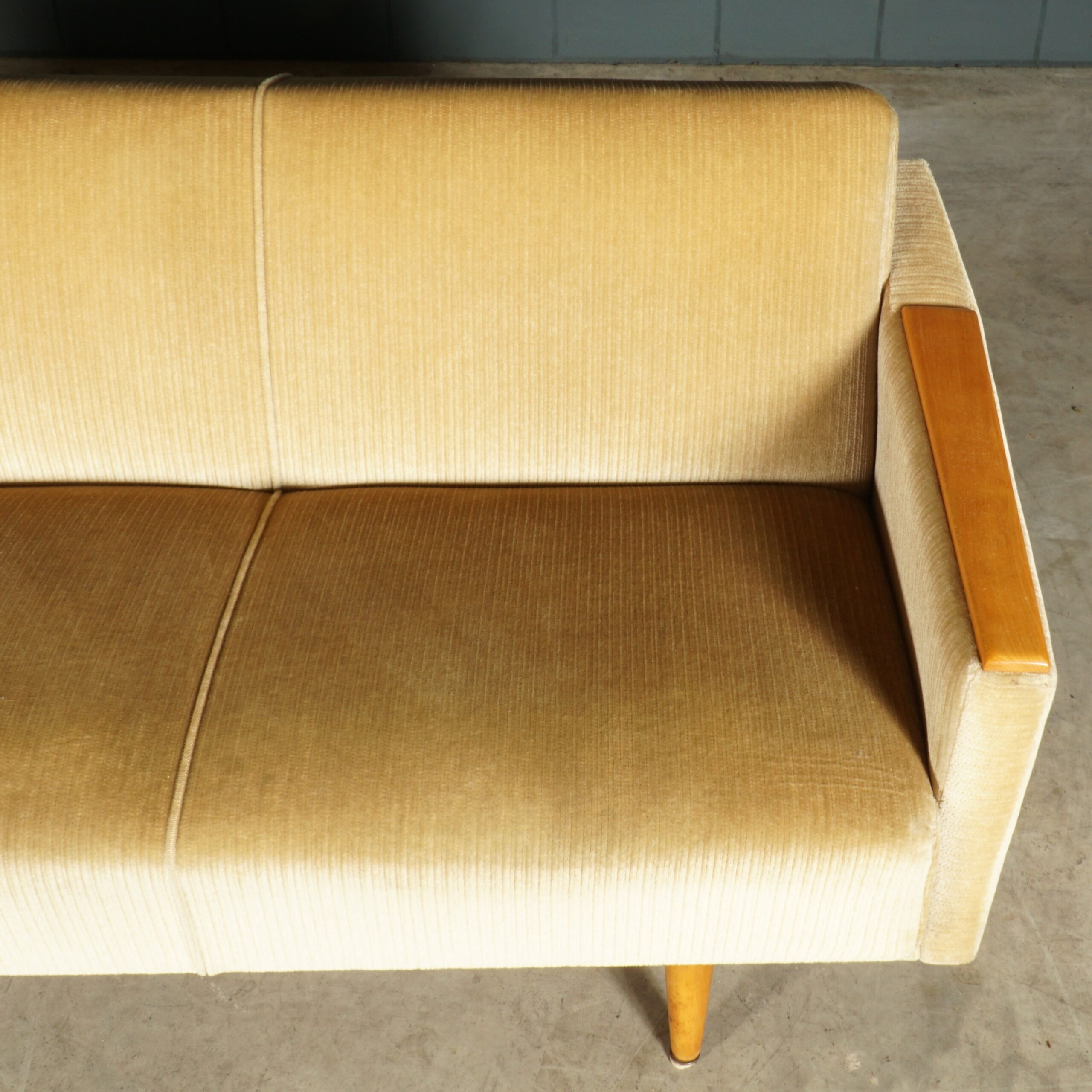 Deze prachtige beige vintage sofa/slaapbank en fauteuil met hocker dateren uit de jaren zestig. De set heeft een natuurlijke Scandinavische uitstraling door het gebruik van een warmbeige velours stoffen bekleding en een strak vormgegeven frame met notenhouten armleuningen en poten. De bank is in een simpele beweging uit te klappen tot een eenpersoons bed. Niet alleen een prachtig design voor zowel in een modern als in een vintage interieur, maar ook nog super praktisch door de geïntegreerde slaapfunctie. Een mooie combinatie met de bijpassende fauteuil met hocker. De bank en fauteuil hebben nog de originele bekleding in super goede staat met amper gebruikssporen. De bank en fauteuil met hocker zijn eventueel ook los te koop.