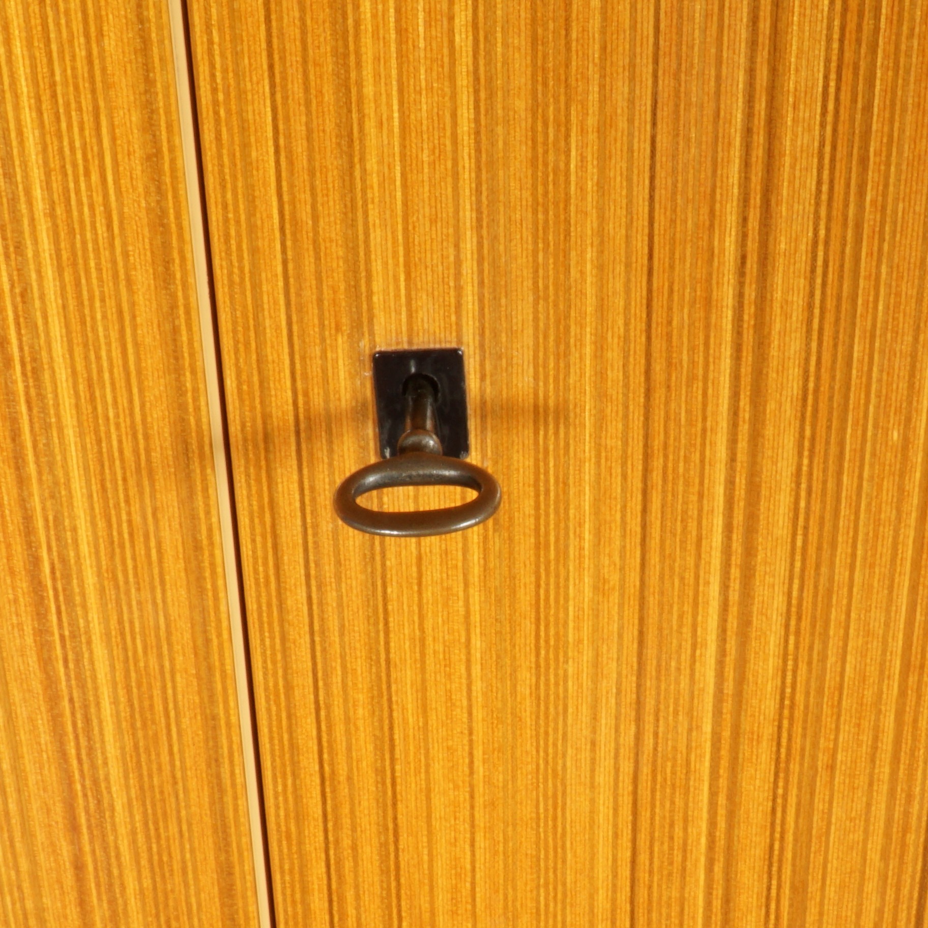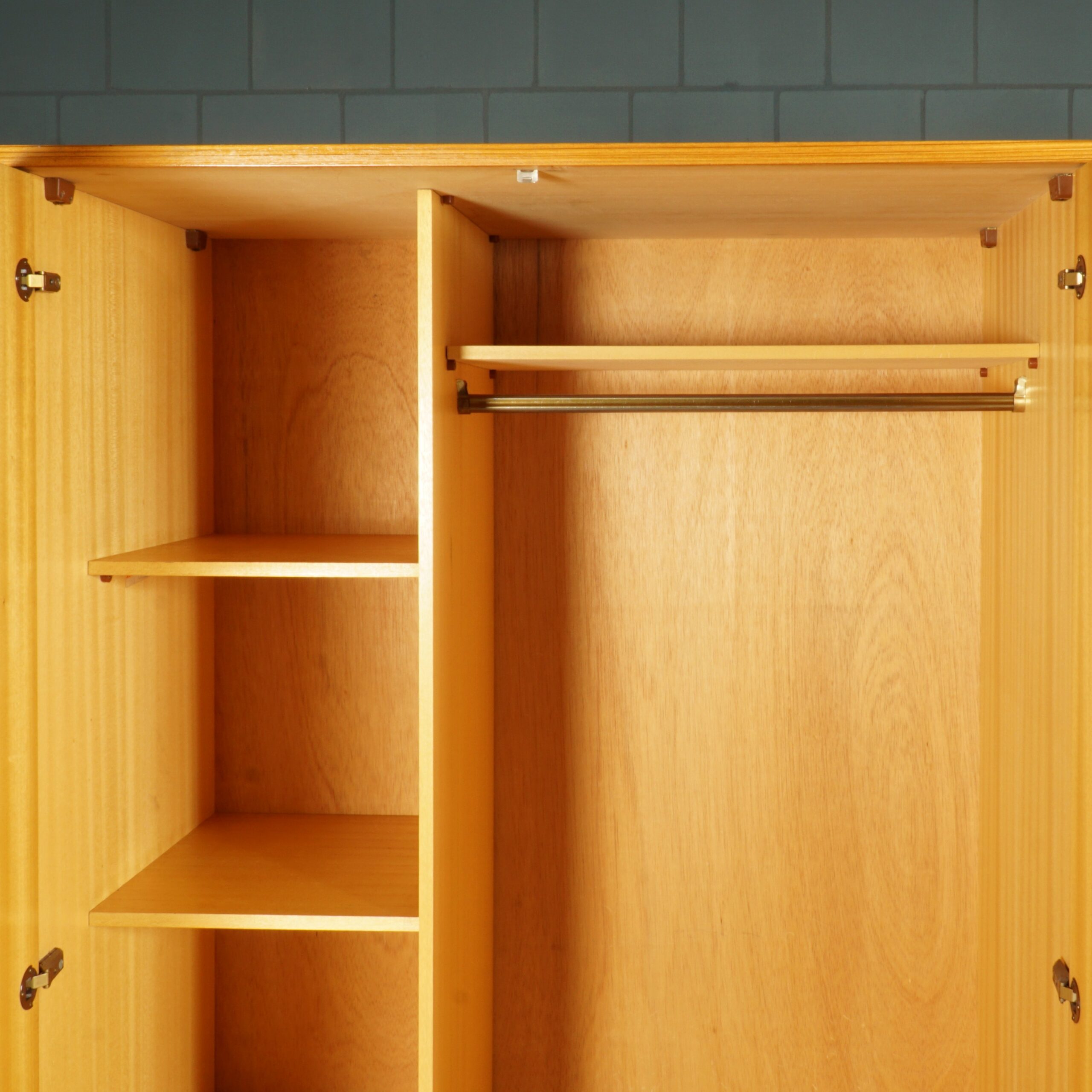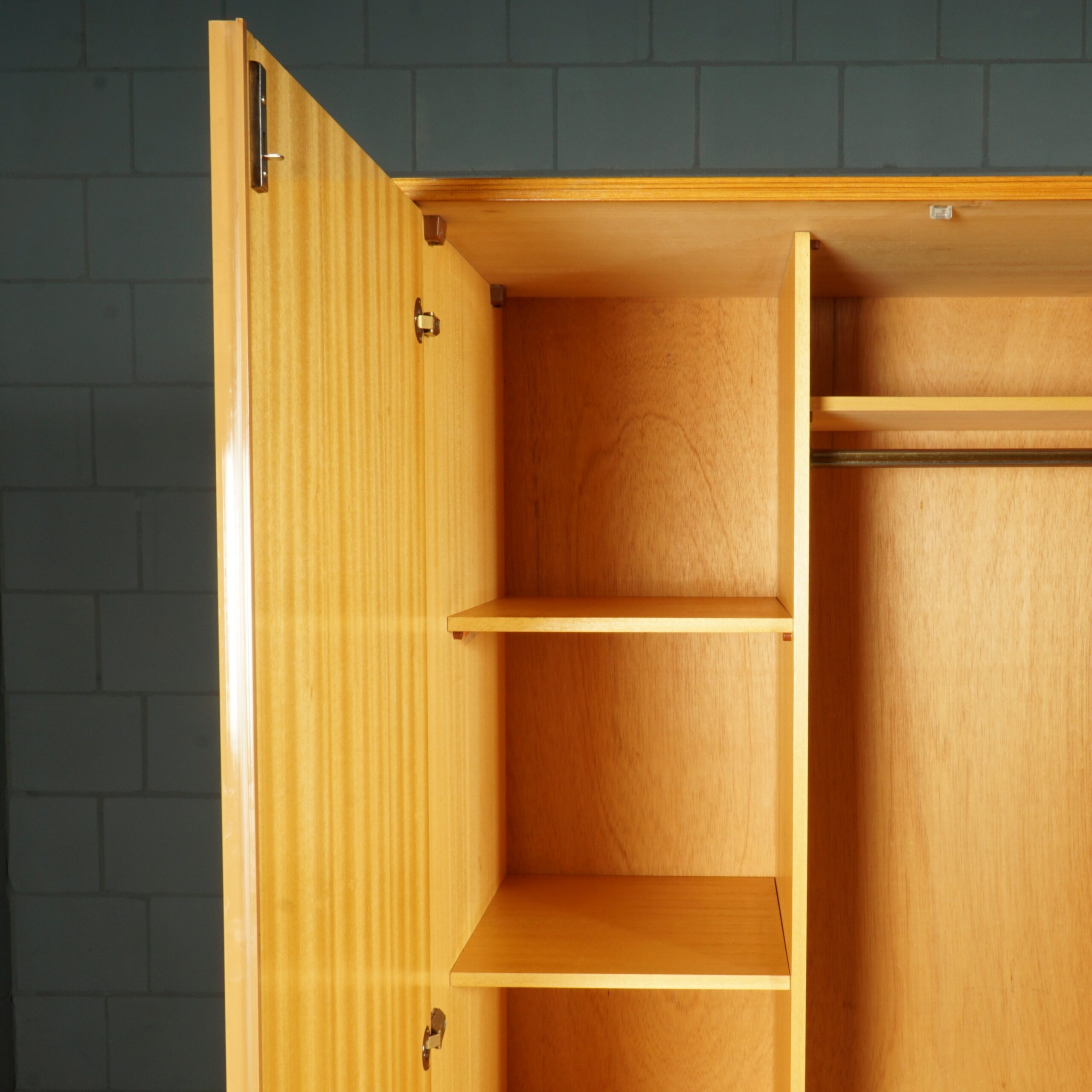 Deze leuke vintage kast uit de jaren 60 in een lichte notenhouten fineer is ideaal als kledingkast, maar ook goed te gebruiken op de kinderkamer. De kledingkast is voorzien van een roede om je kleding aan op te hangen. Ideaal als je graag je mooiste jurken en jasjes op wilt hangen. In de kast zitten verder nog 4 plankjes. de originele sleutel is aanwezig. De kast is in goede vintage staat met wat gebruikssporen, waaronder wat vlekjes op het hout van de bovenkant van de kast (niet goed zichtbaar vanwege de hoogte). Ook is het fineer lichtjes beschadigd aan de onderkant van de binnenzijde van de kastdeuren , omdat de deuren voorheen wat geklemd hebben (zie laatste foto).