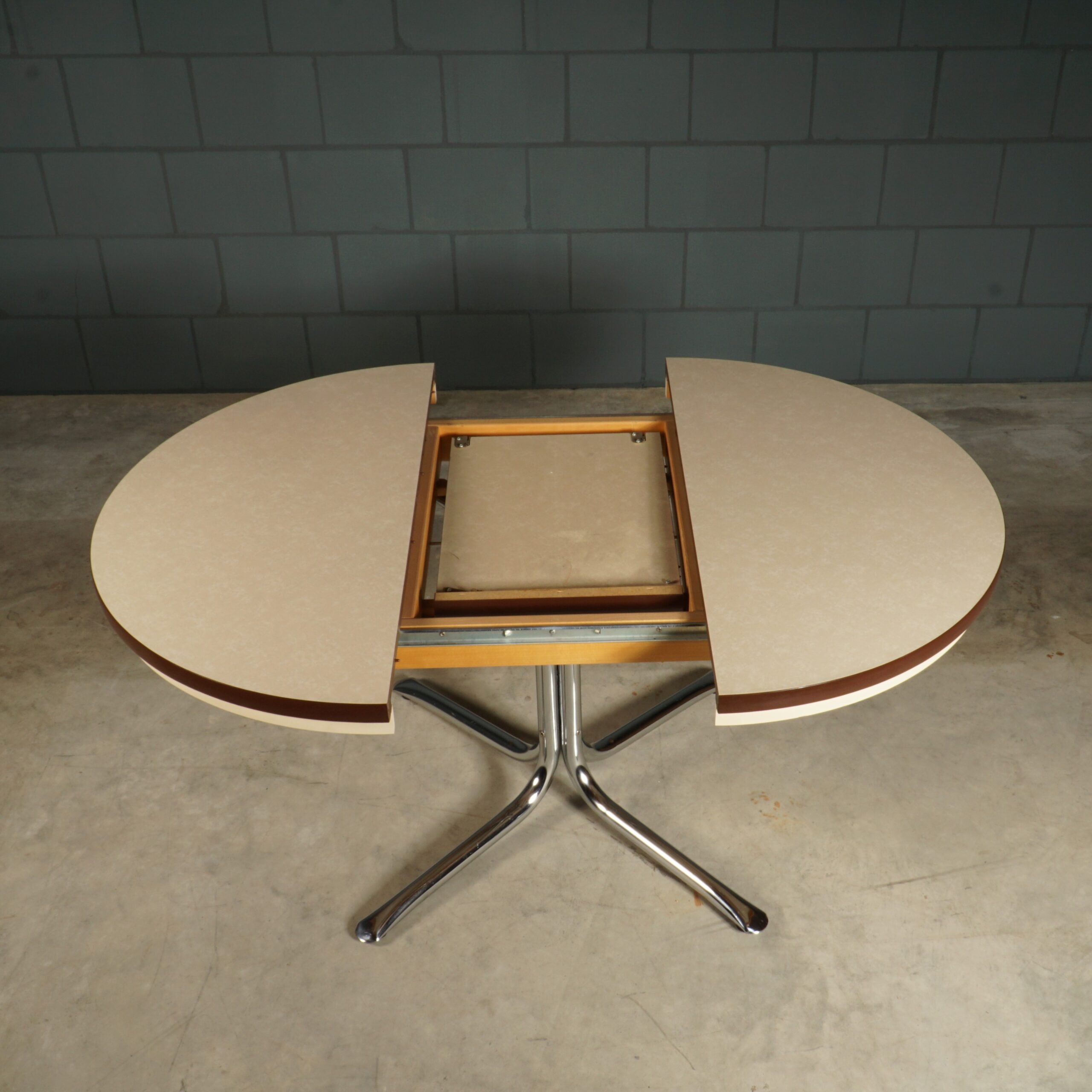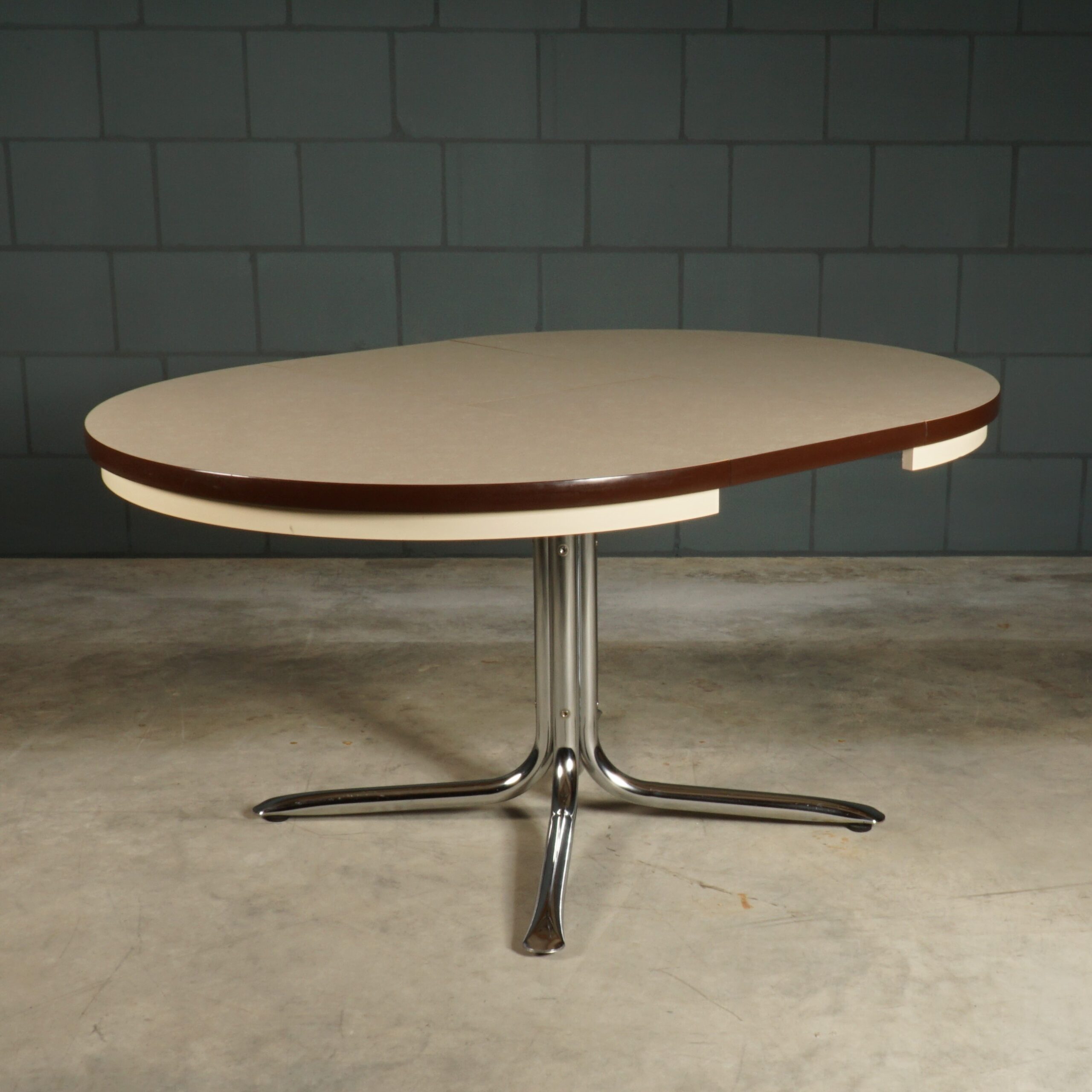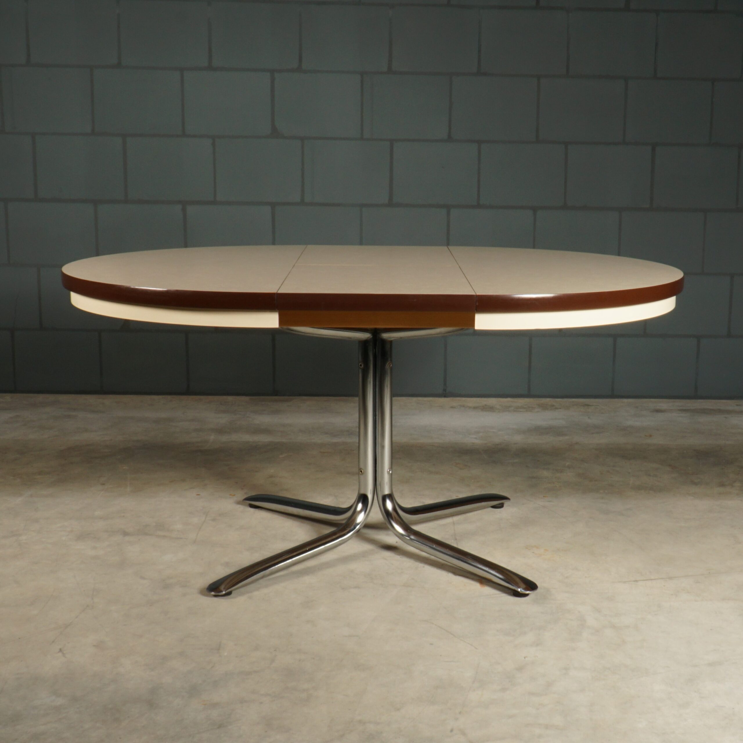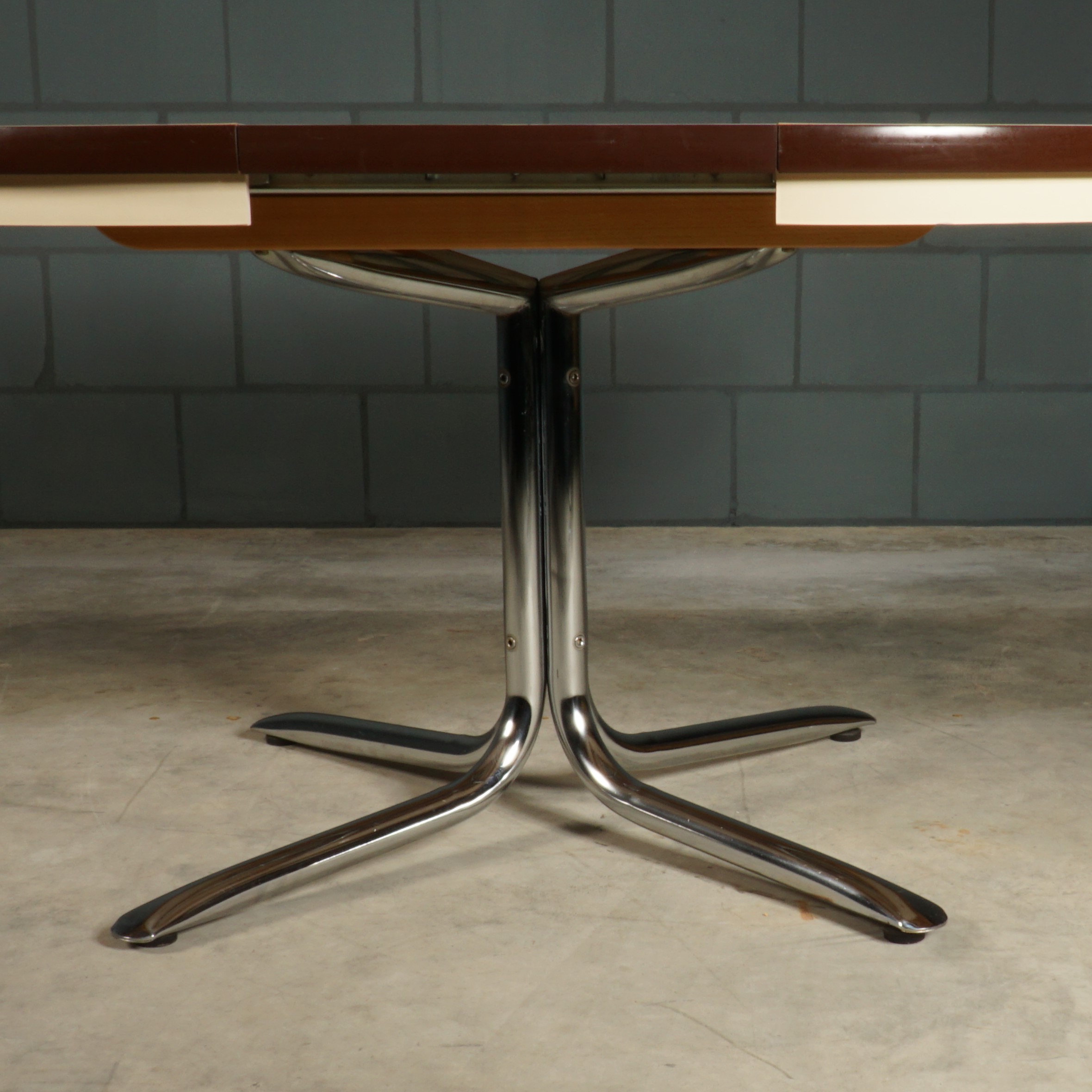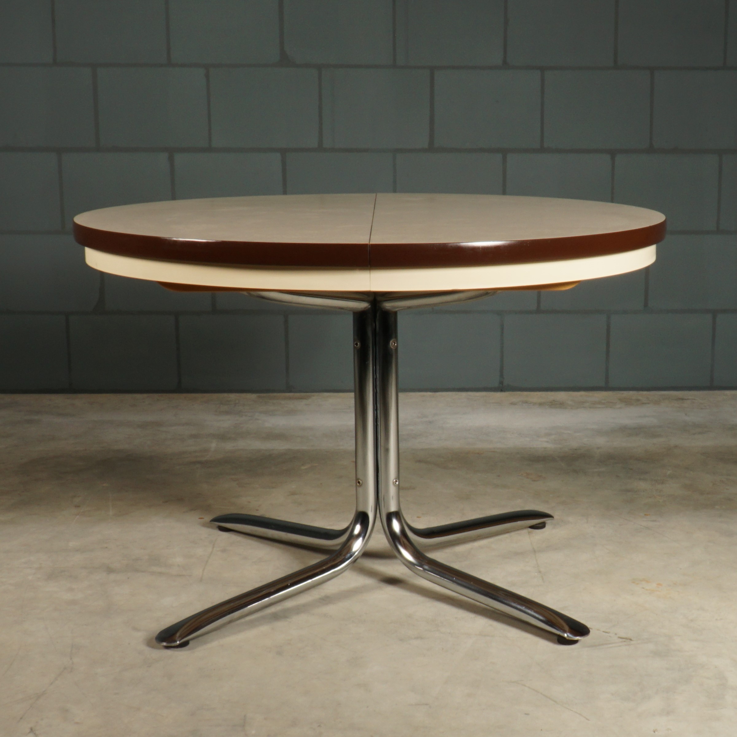 Deze stoere hoogwaardige design tafel dateert uit de jaren 70 en is van het Duitse merk EKA Wohnmöbel. De verchroomde tafelpoten zijn zeer stabiel en perfect onder de tafel geplaatst, waardoor je gemakkelijk stoelen onder de tafel kunt schuiven. Elke poot heeft een vloerstelschroef aan de onderkant zodat de tafel perfect staat. Het tafelblad is van massief hoogwaardig hout, afgewerkt met een gecoate toplaag. De ronde tafel kan worden vergroot tot een ovale vorm (1,50 cm lang) met het uittrekelement (40 cm breed). De tafel is in uitmuntende staat! Echt een designer juweeltje die zeker gaat opvallen in je interieur!